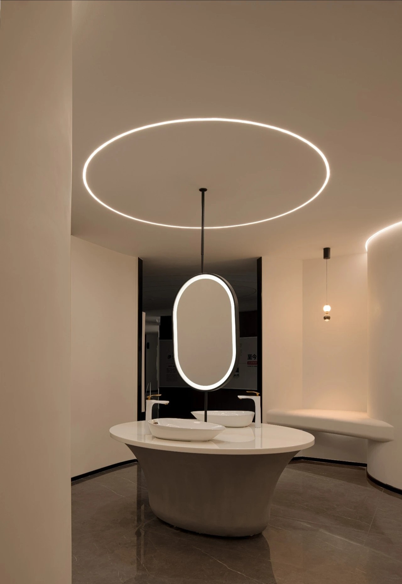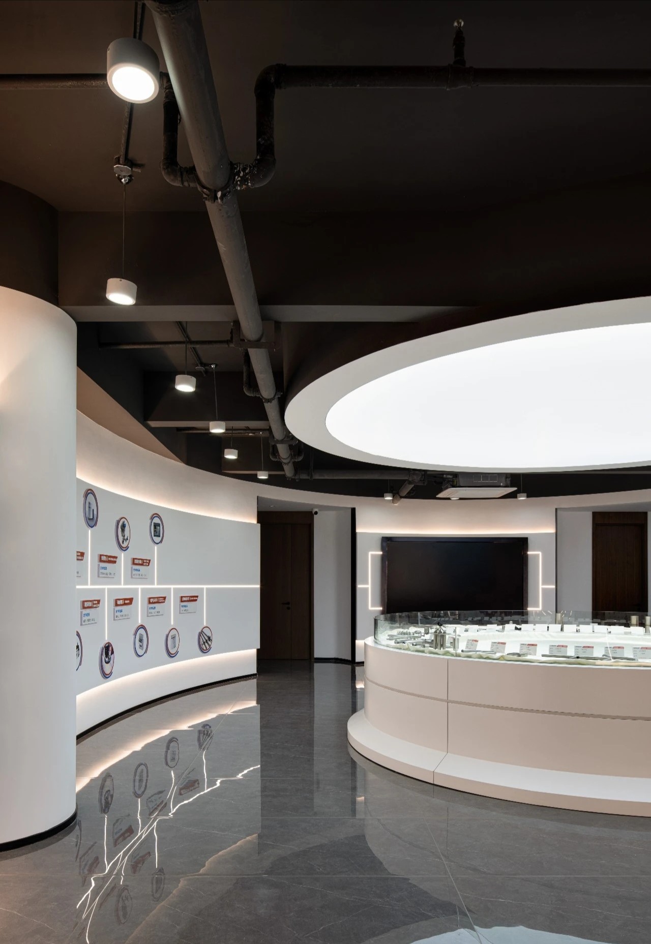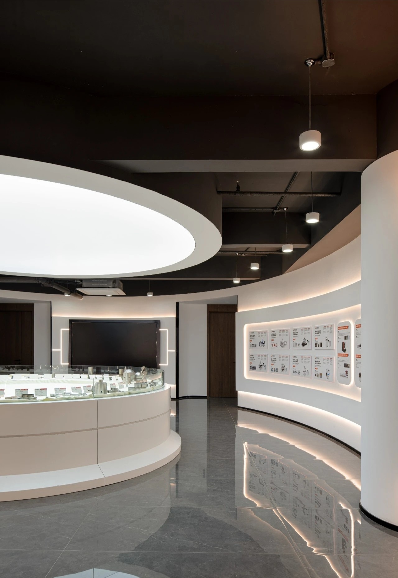 继续前行,椭圆形的企业展厅映入眼帘,中央直径3.5米的圆形展示台,宛如一颗璀璨的科技明珠,精心陈列着铭泰激光制作的精密配件,每一处细节都透露着对品质的极致追求。