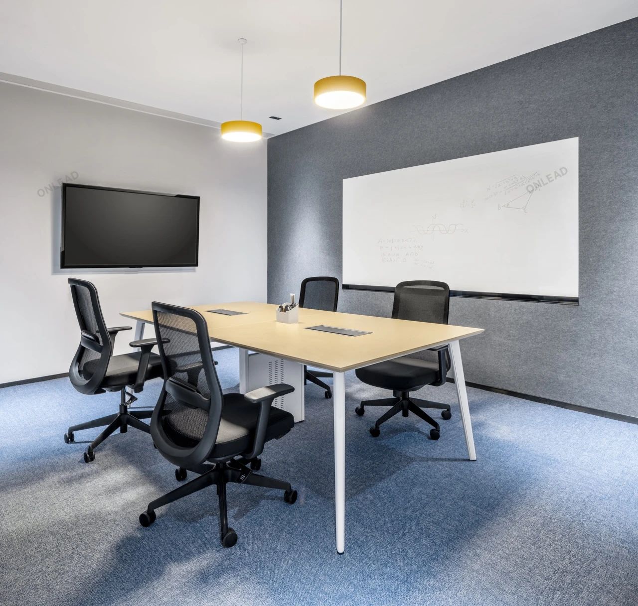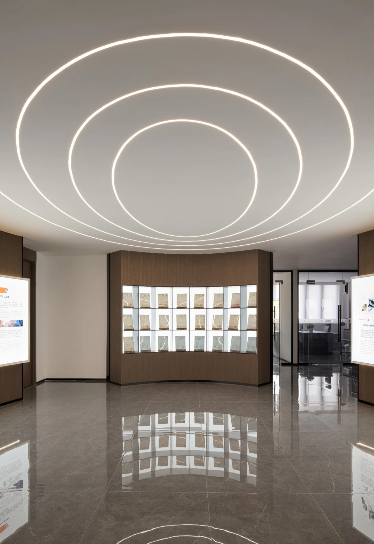 大型LED屏幕循环播放着企业介绍与文化,左右两侧,业务范围、合作单位、布局全球、等展示墙,全方位展现了铭泰的全球化视野与深厚底蕴。