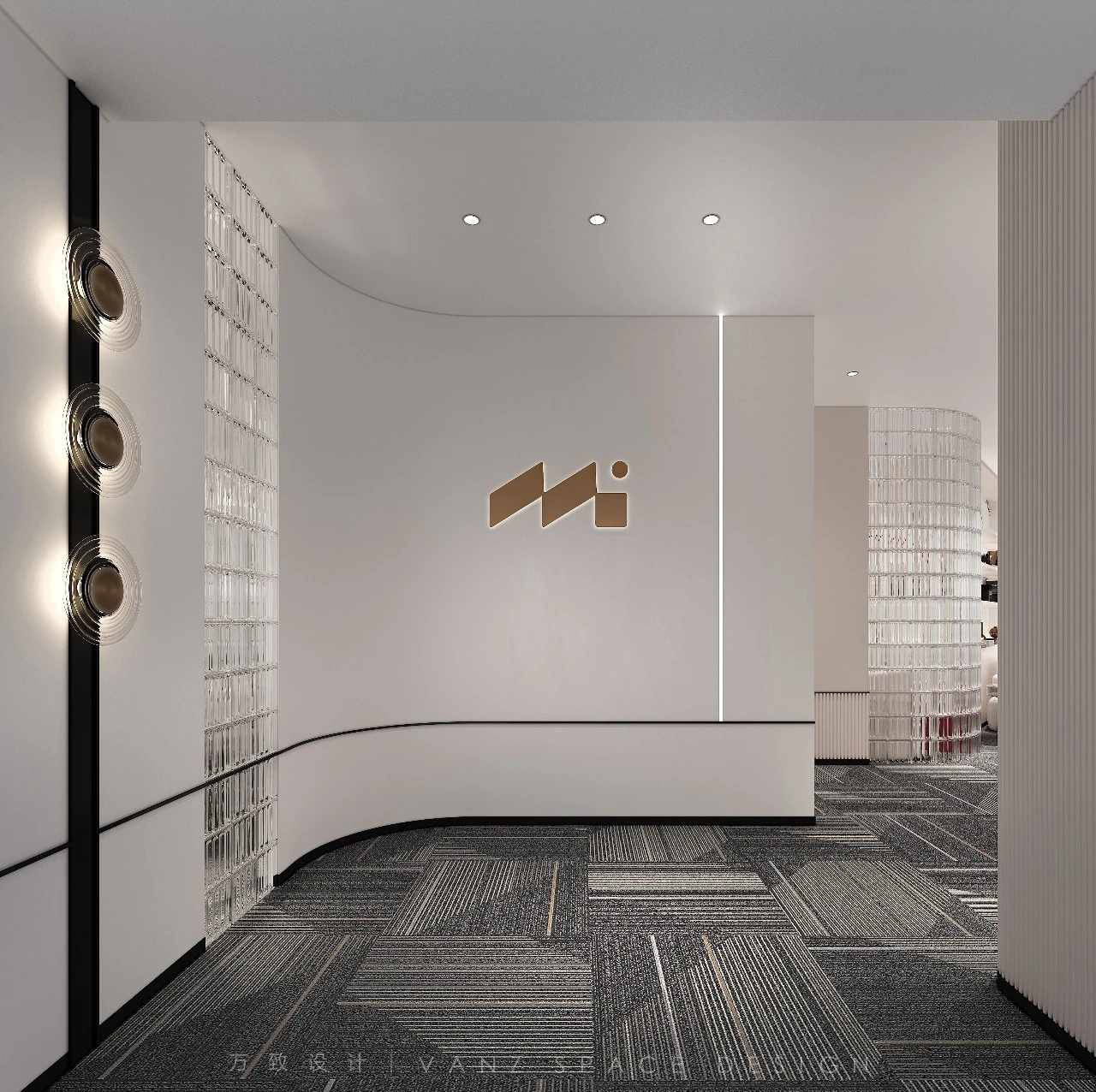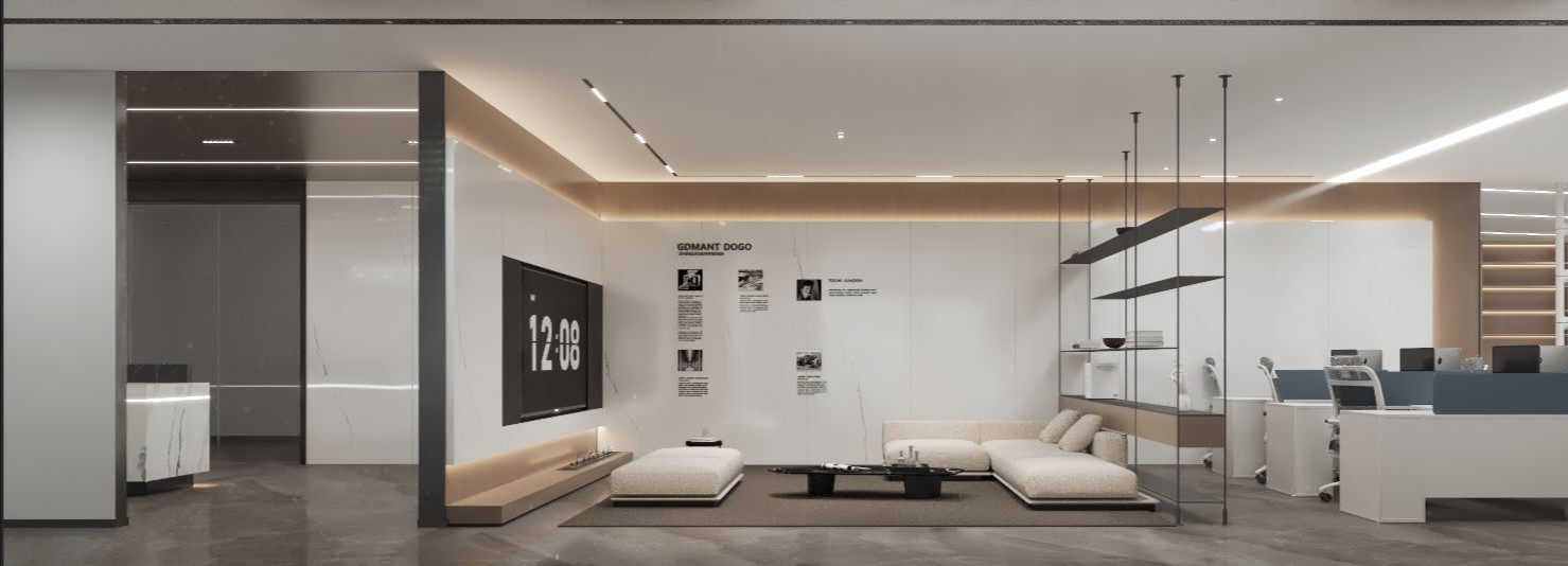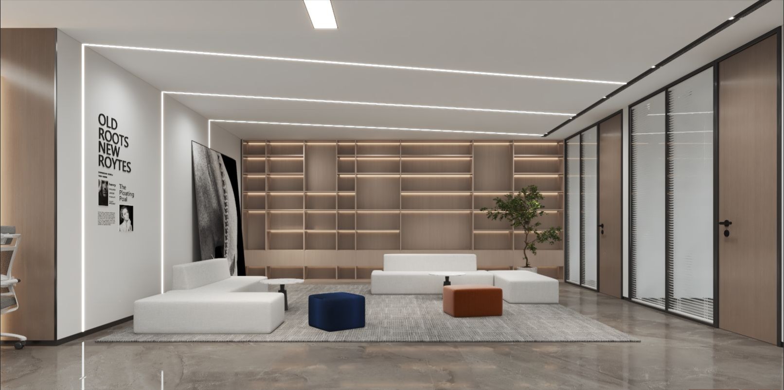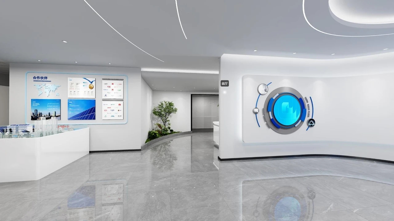 展厅作为前台的延展空间,风格色调继续保持一致。设计理念注重简约、科技感以及品牌展示。空间布局通透开放,利用线条灯带营造氛围,色彩上以蓝白相间为主色调。