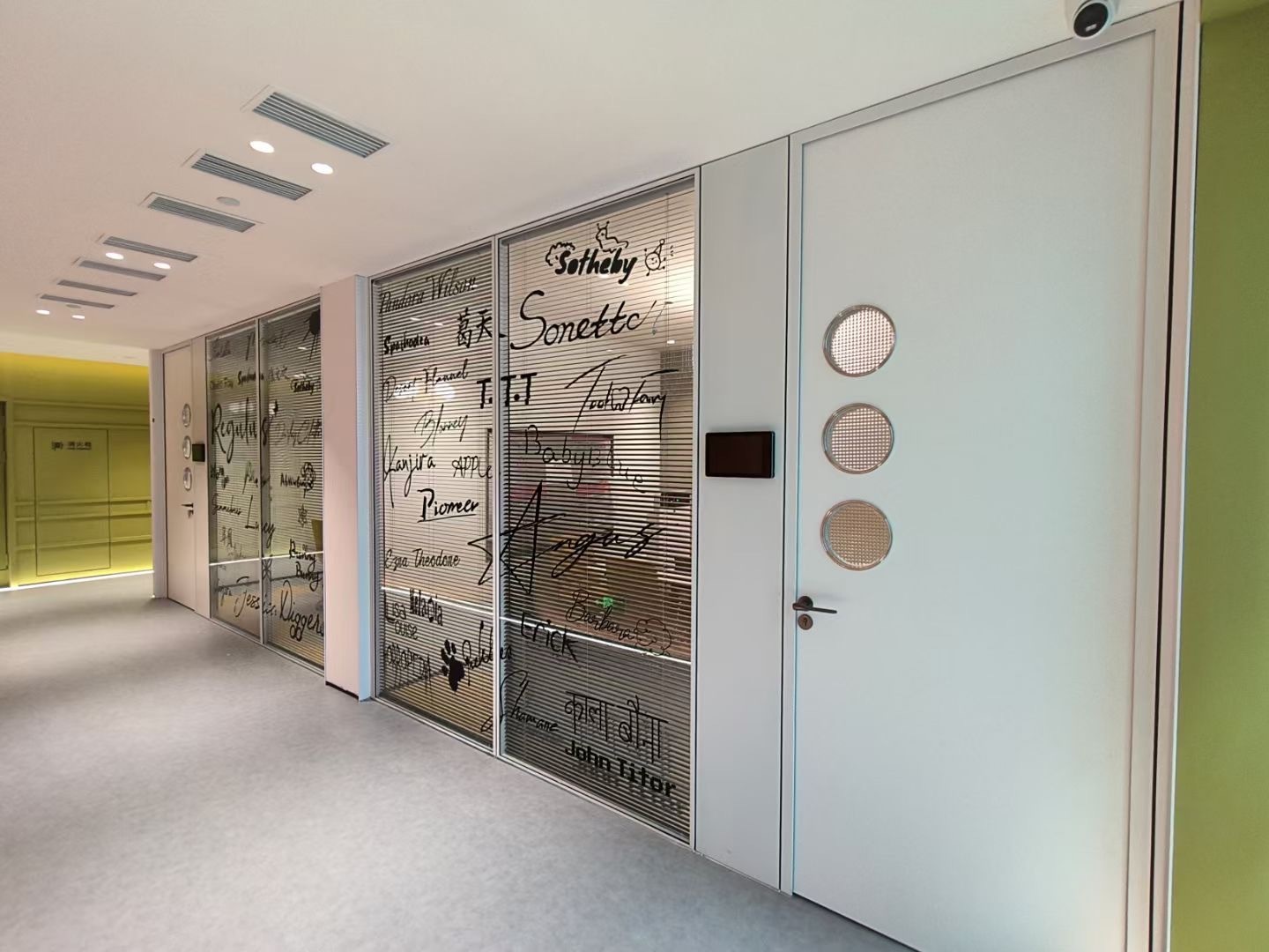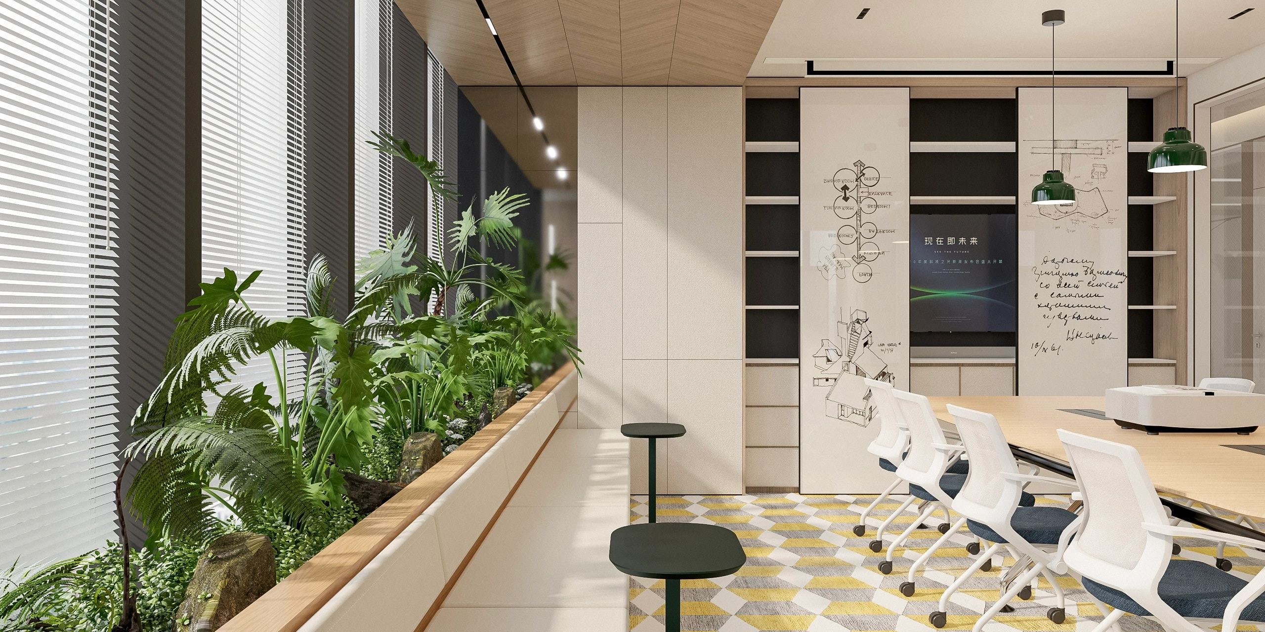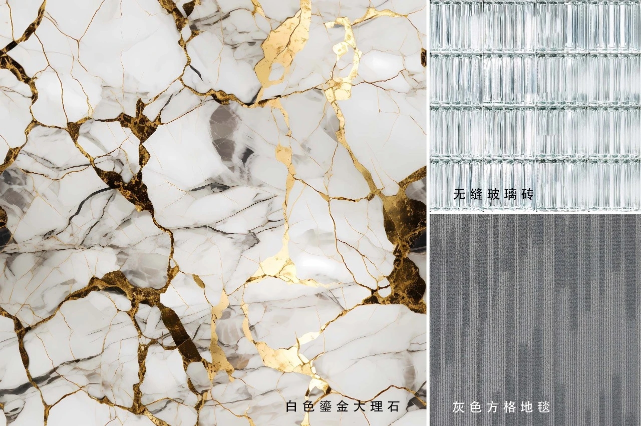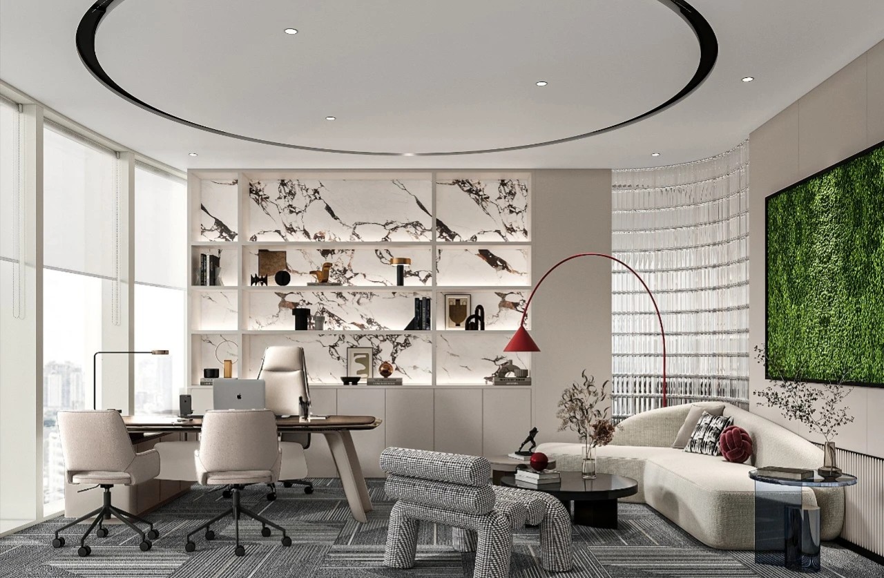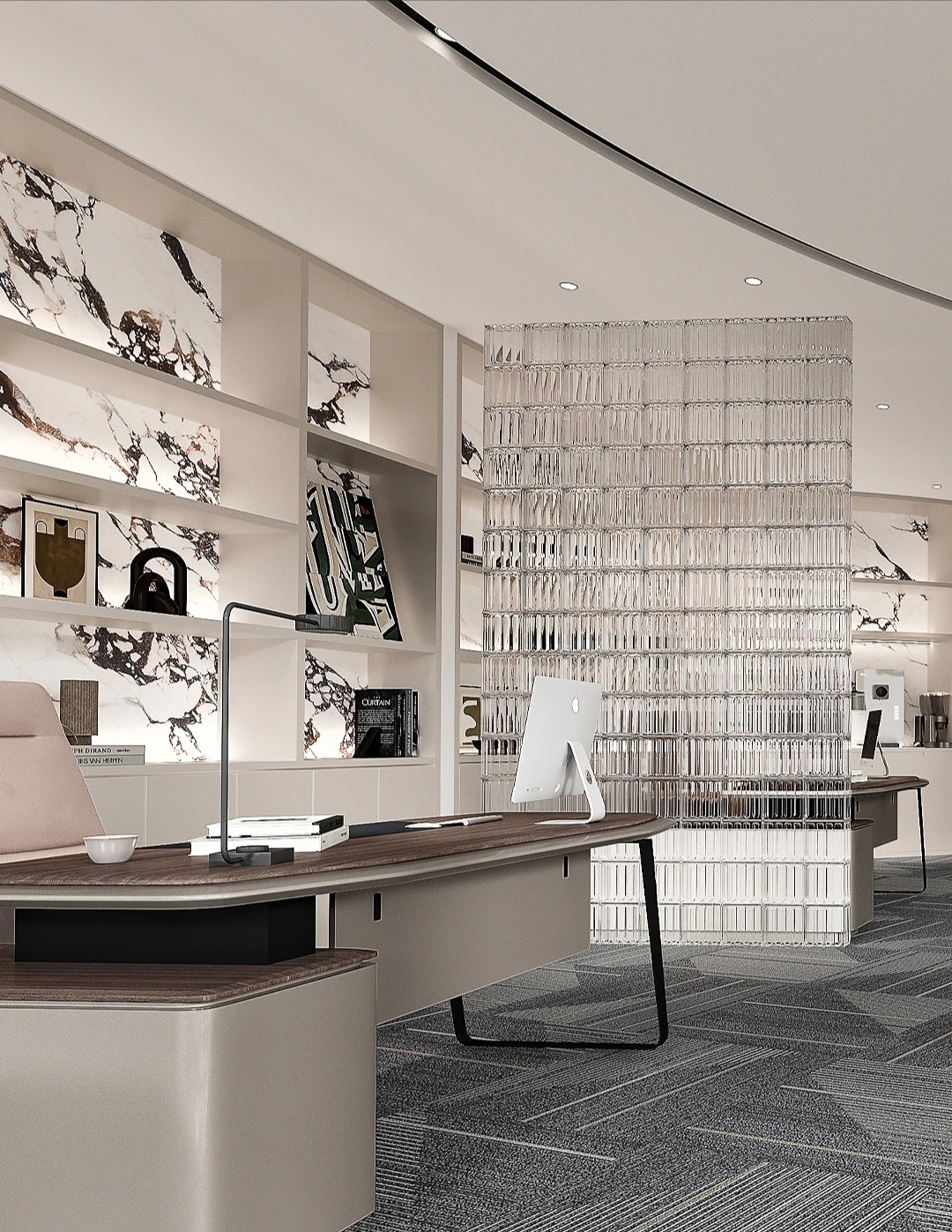 灰色地毯的使用可以降低地面的反光,也能中和空间的白色色调,让整体看起来更加协调。无缝玻璃则可以增加办公室的艺术氛围,同时也能打破办公室材质的单一,让空间看起来更加年轻跳跃,而鎏金大理石裂纹则可以增加办公室的气质,为空间赋予时尚改高级的氛围。