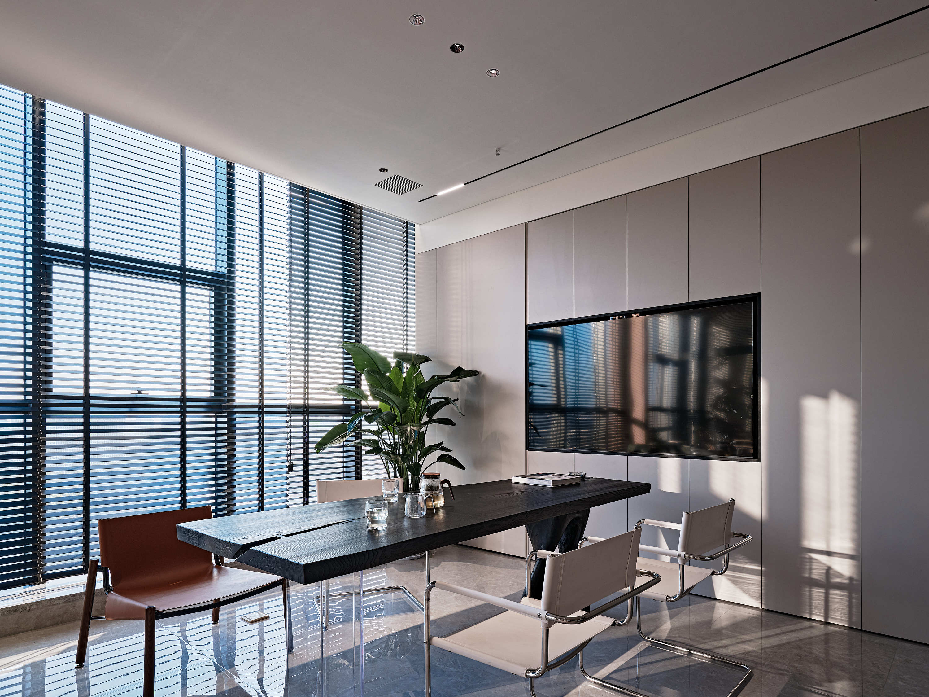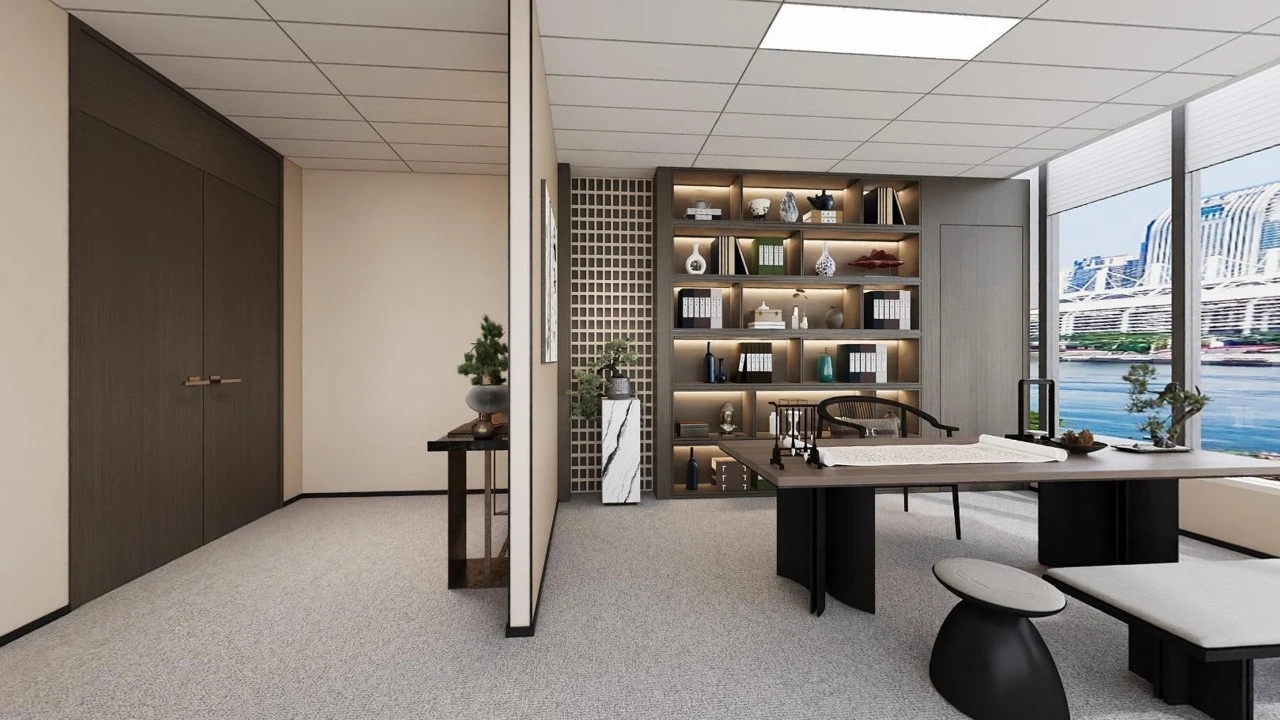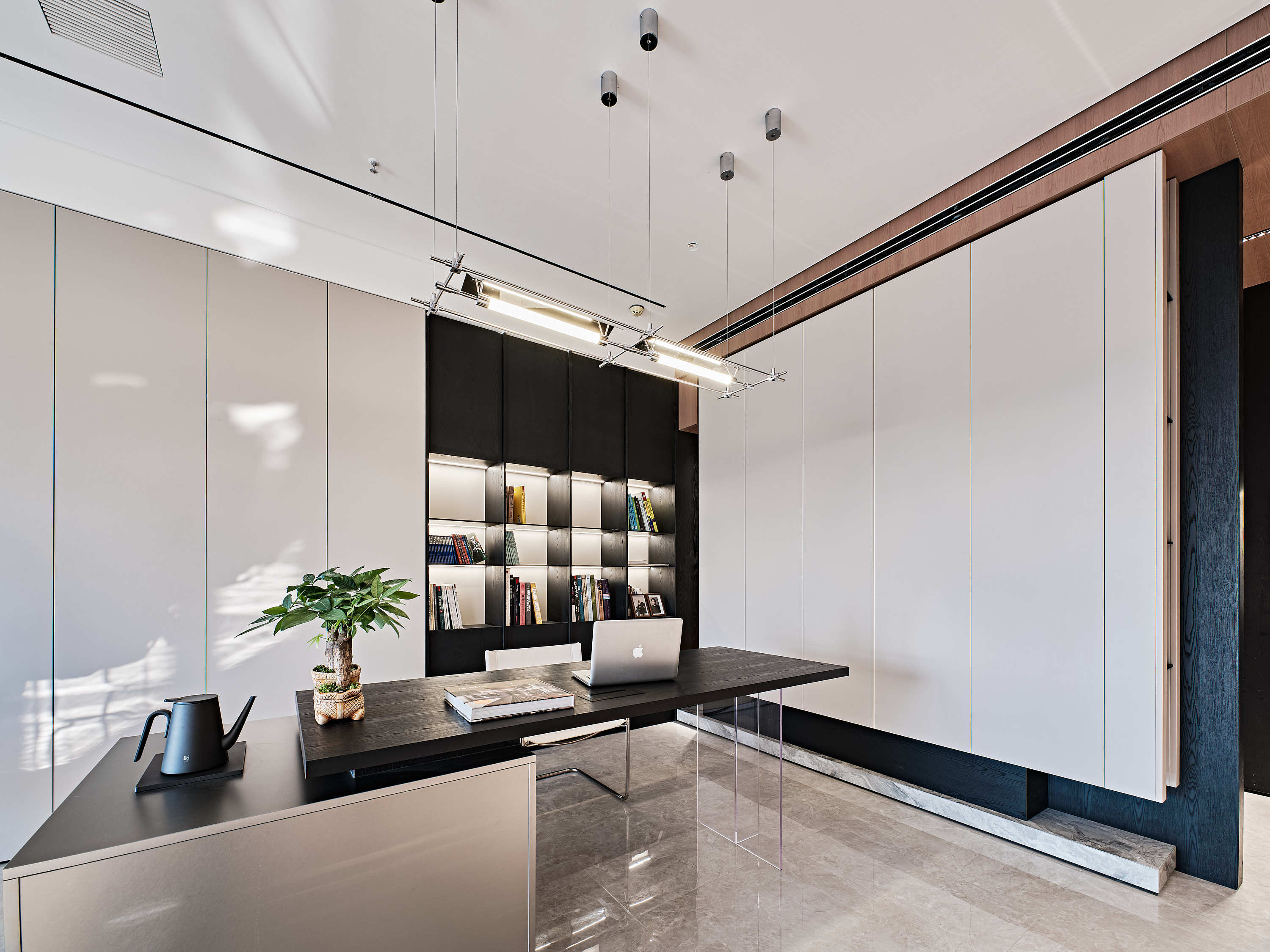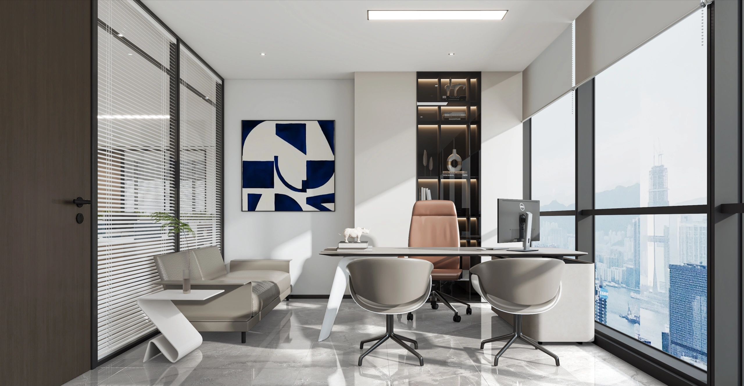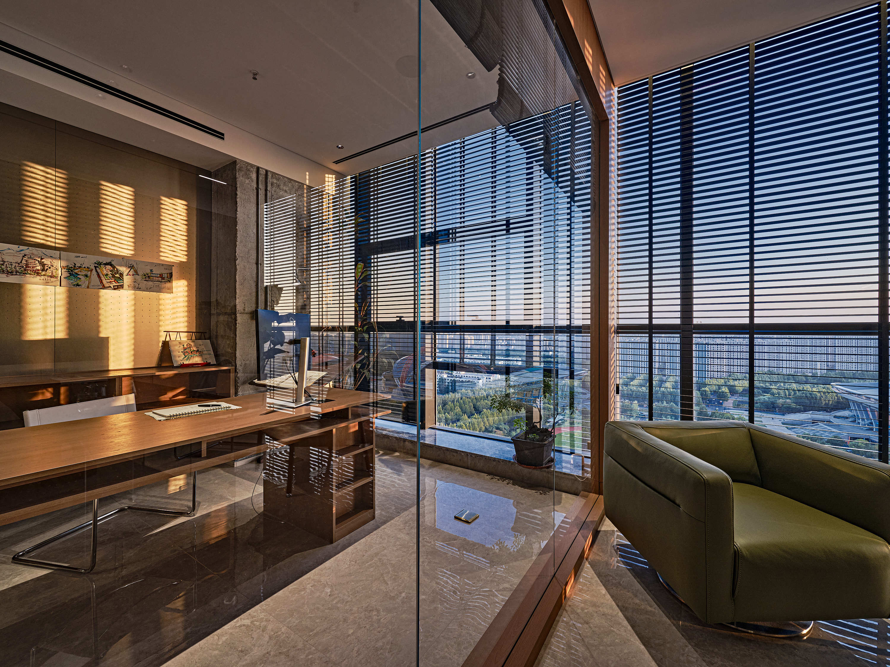会议室的风格沉稳、大气,同时融合公司的文化氛围和品牌形象。选择了符合公司风格的颜色和元素,让参会人员感受到公司的文化内涵和品牌气息。经理室划分了办公区和休息区,空间宽敞明亮,于严谨的秩序与效率间巧妙注入舒适、轻松与明快的优雅气韵,让使用者在其中可放松身心、可高效工作、亦可缓解压力,赋予办公新乐趣。这是一个豪华的总经理室,整个空间采用了高级灰+木色的设计,给人一种稳重又不失温馨的感觉。头顶的吊灯和脚下的地毯相呼应,营造出一种奢华氛围。开阔的落地窗,能尽情享受空中极佳的视野与美景。