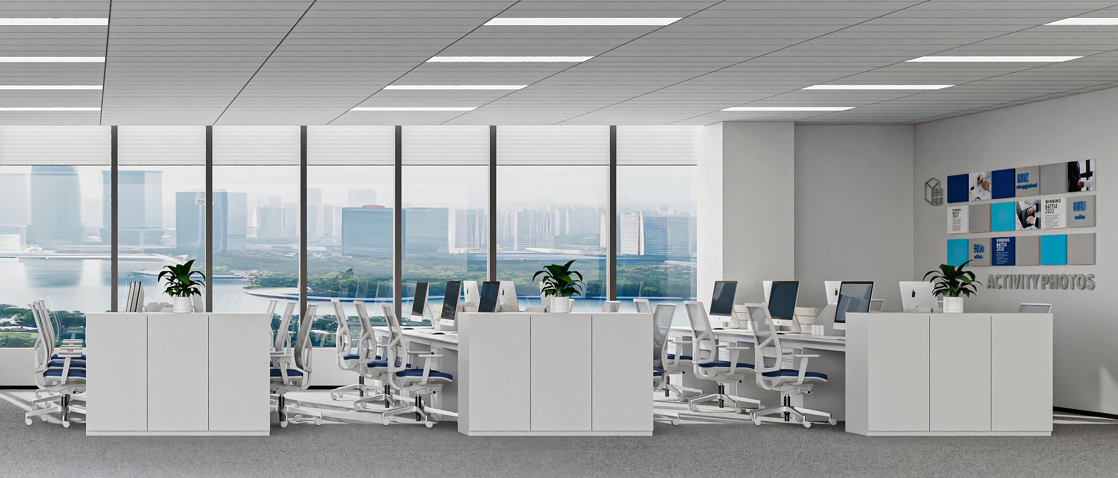 前台接待区作为进入办公室的第一眼视觉空间,设计以简洁明快为主,采用白色大理石台面和灰色地砖,营造出干净利落的空间感。背景墙中央蓝色LOGO,与整体白色墙面形成对比,提升了品牌形象的视觉效果。