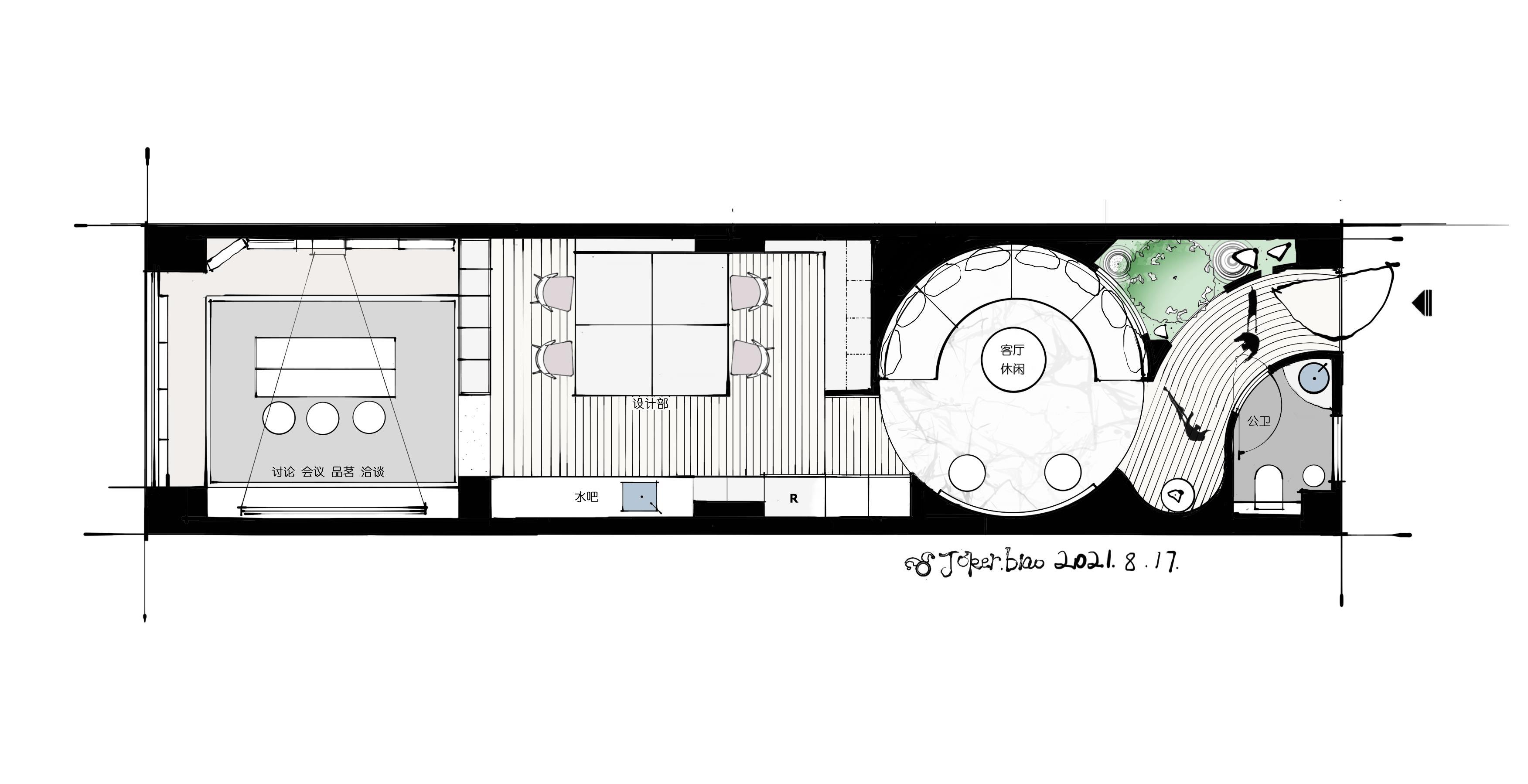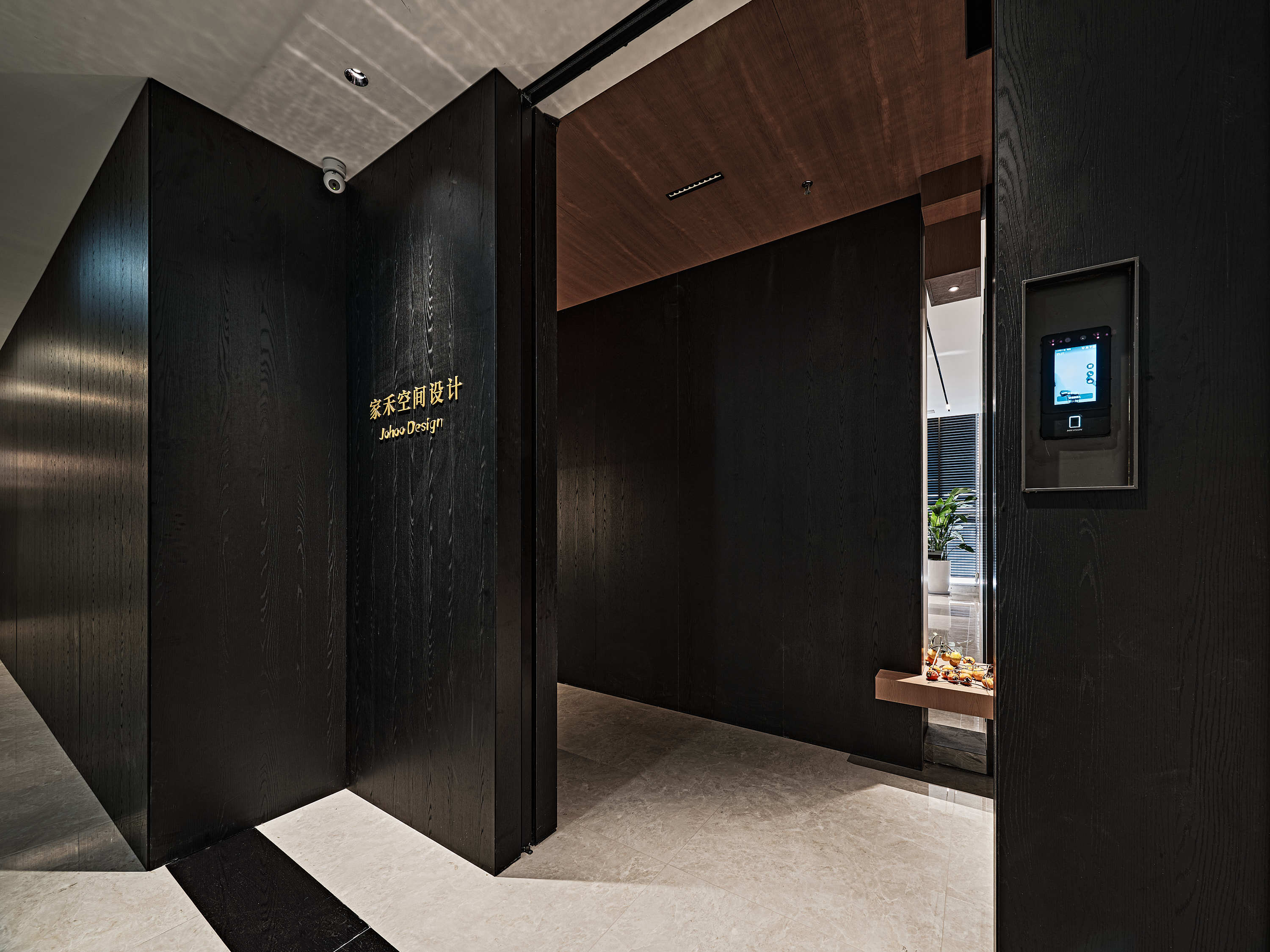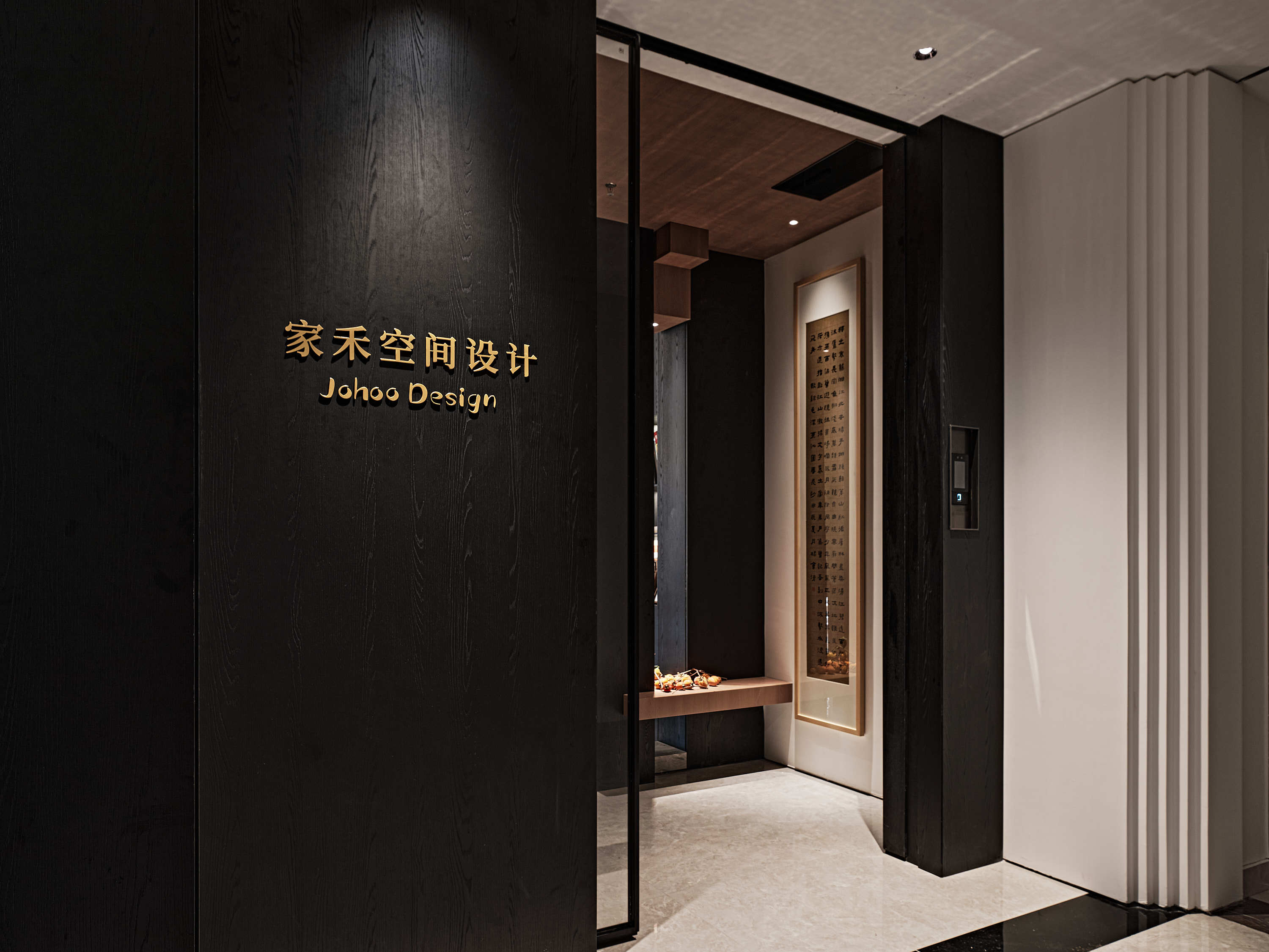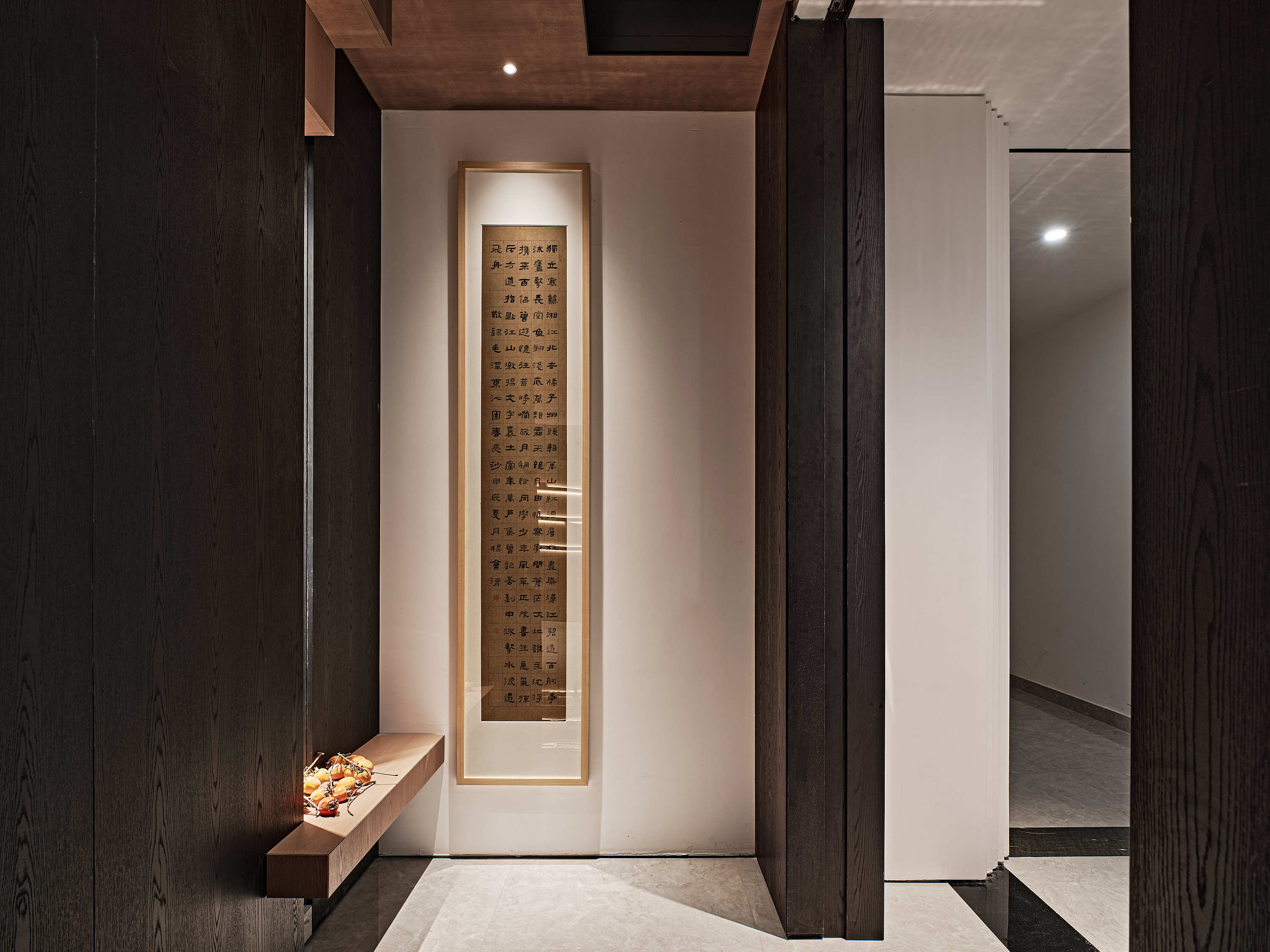 茶室整体风格简约而优雅,黑色大理石台面的茶桌能有效提升空间的整体档次,而灰色木纹元素则增添了一丝自然与温馨的气息,两者结合使整个空间看起来更有层次感。绿植的使用,让整个空间灵动而富有生机。