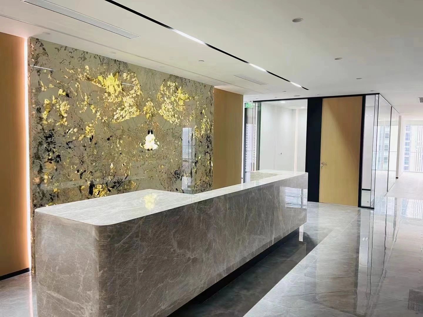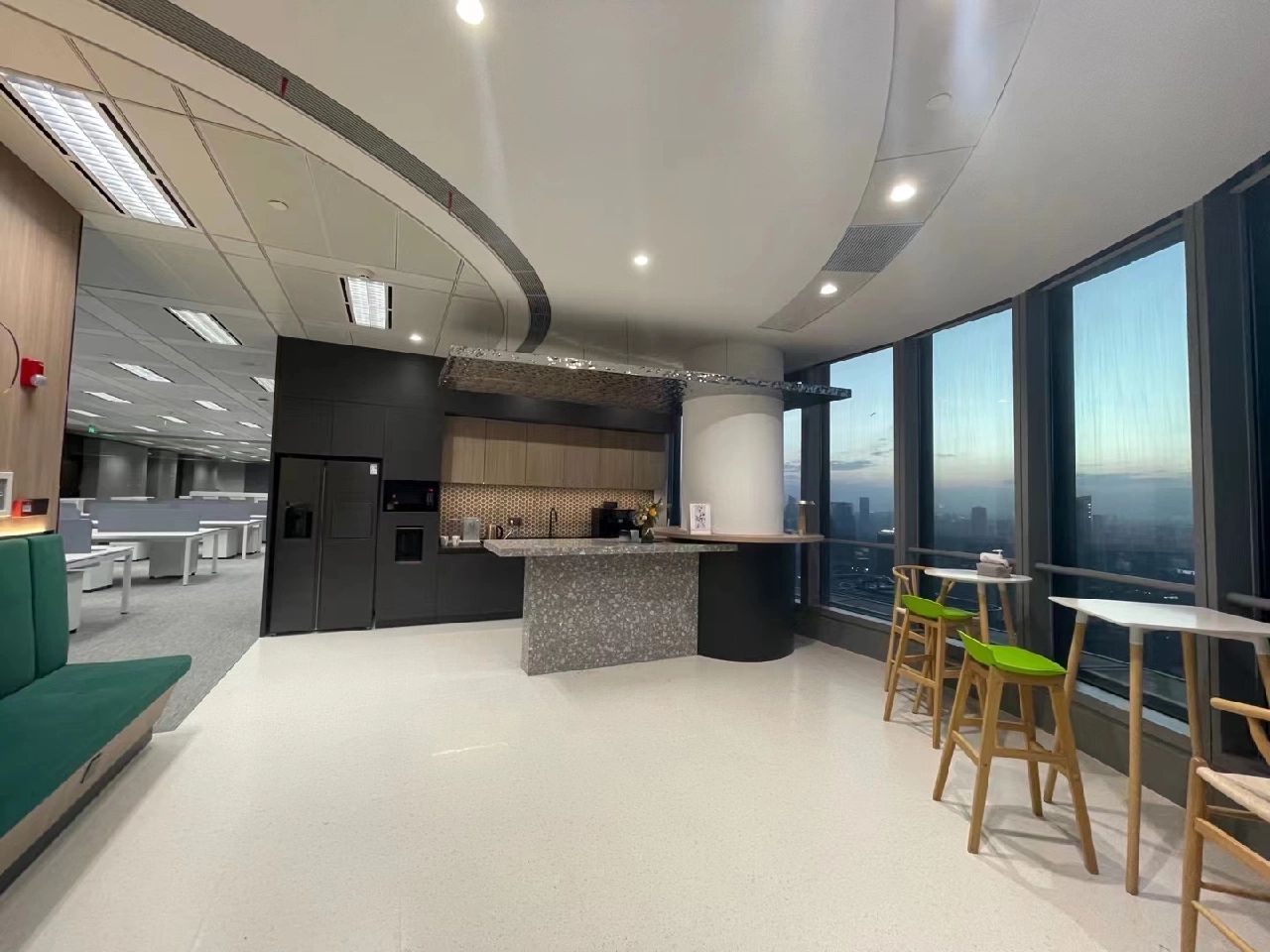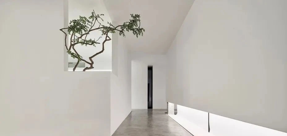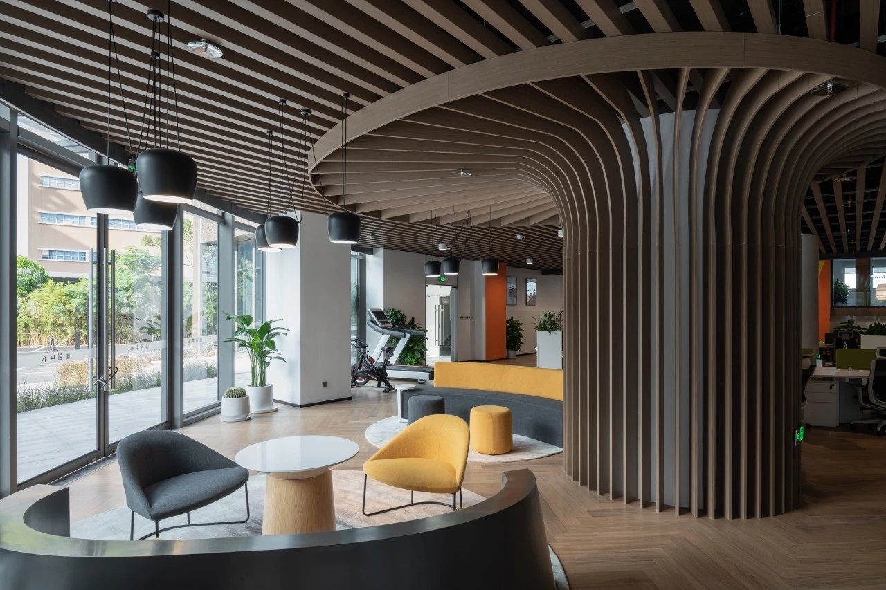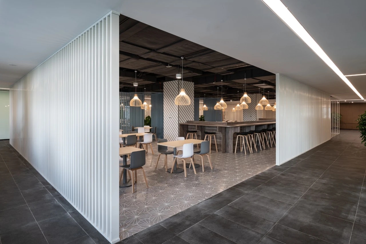 首层大堂的挑高空间运用大面积的灰白色调,形成视觉上的延伸,突出场所的宽敞透亮,大理石、铝板和不锈钢等材料的组合点缀,呈现简洁现代的空间氛围。共享办公区内流动的天花弧线犹如叶脉一般,被紧紧联结并向上生长。餐厅区域设置孔雀蓝的铝制格栅,结合不同明度的灰色地砖、沉稳的木饰面以及形状奇特的灯具,各种利落流畅的线条运用其中,形成彼此呼应而又统一的美感。