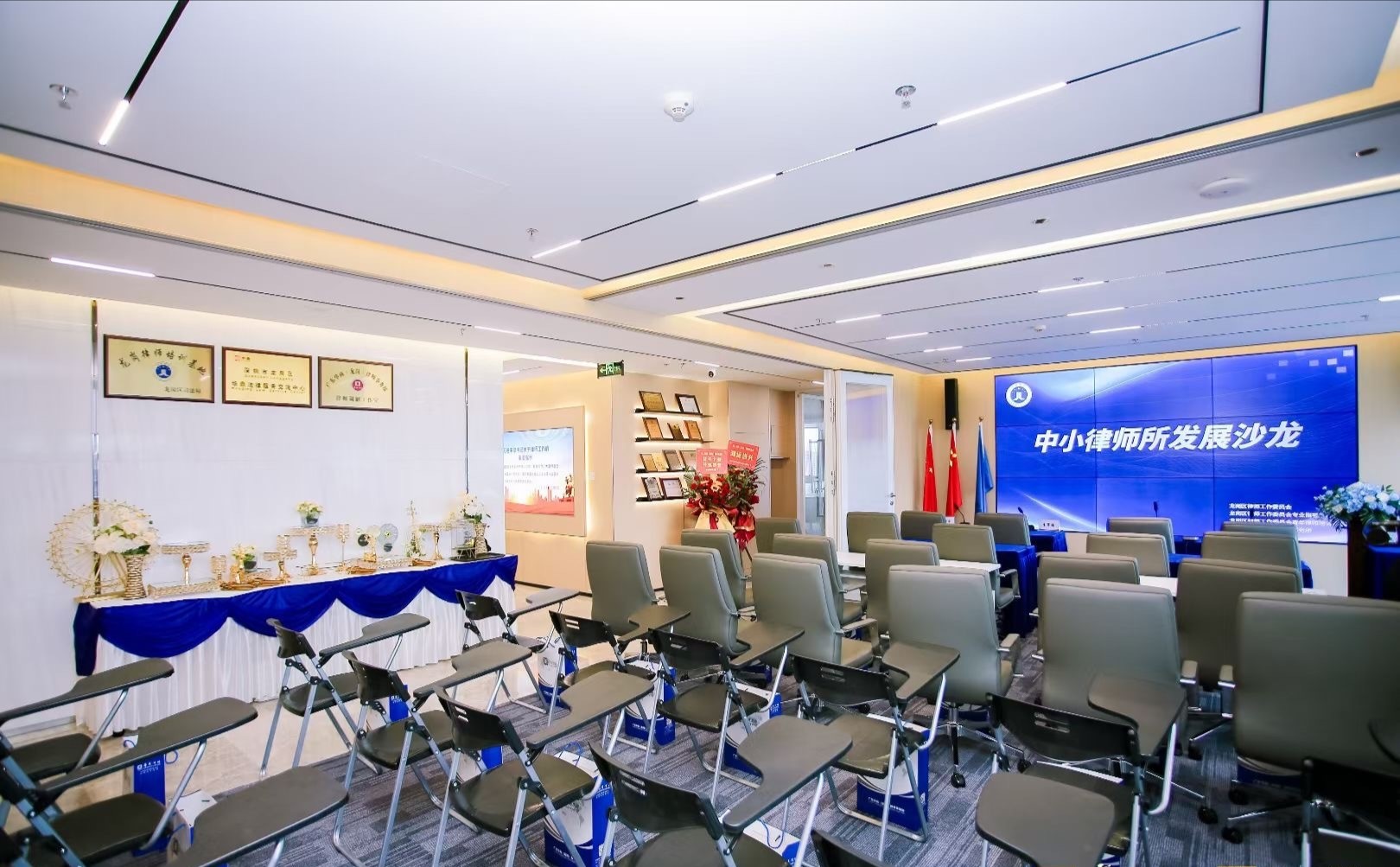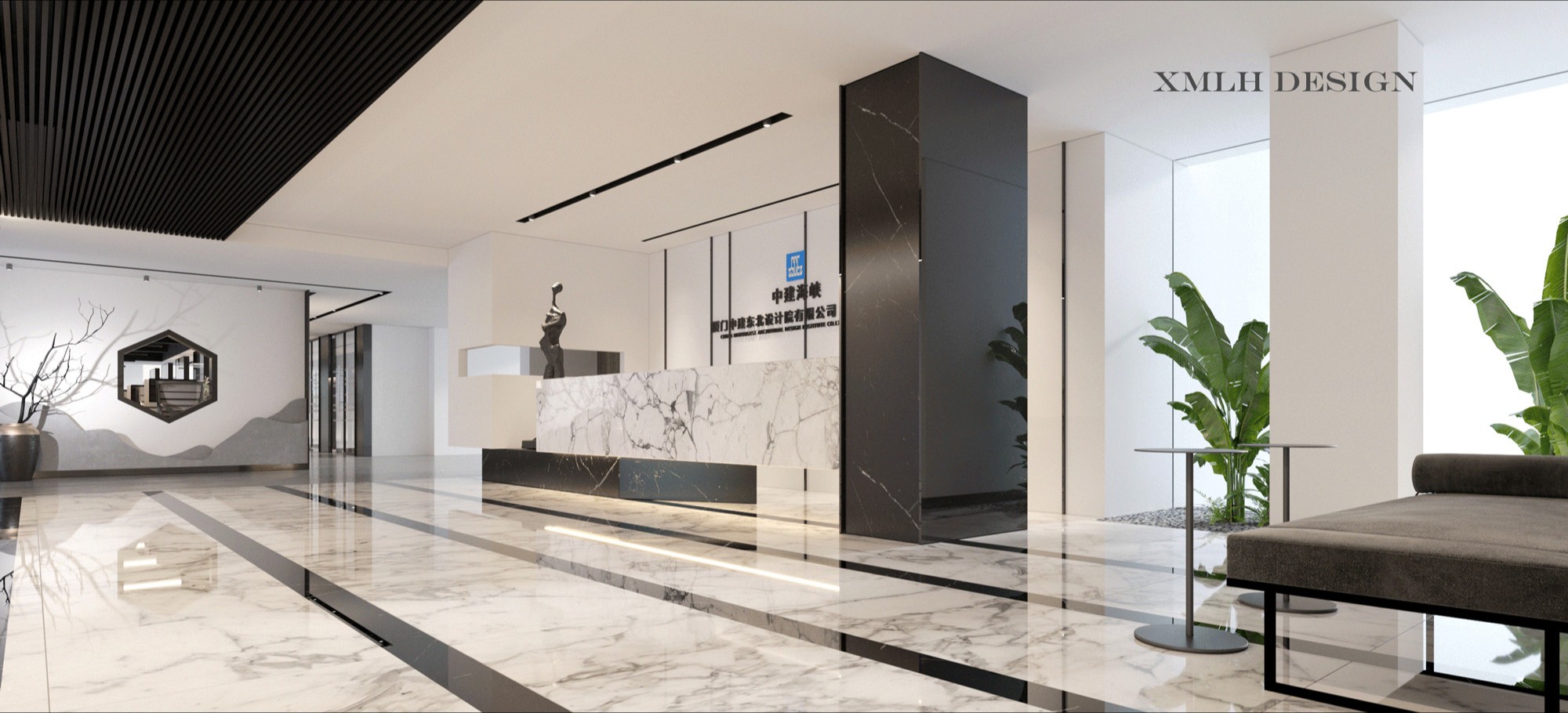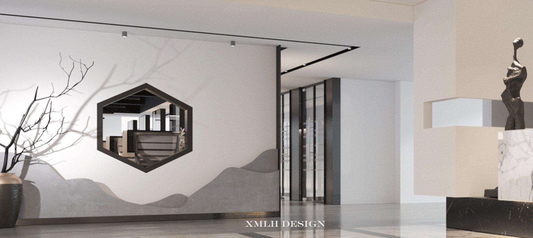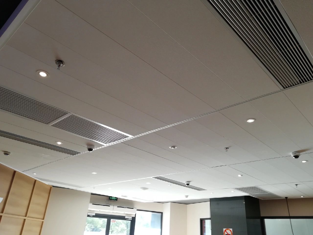 首层大堂的挑高空间运用大面积的灰白色调,形成视觉上的延伸,突出场所的宽敞透亮,大理石、铝板和不锈钢等材料的组合点缀,呈现简洁现代的空间氛围。共享办公区内流动的天花弧线犹如叶脉一般,被紧紧联结并向上生长。餐厅区域设置孔雀蓝的铝制格栅,结合不同明度的灰色地砖、沉稳的木饰面以及形状奇特的灯具,各种利落流畅的线条运用其中,形成彼此呼应而又统一的美感。
