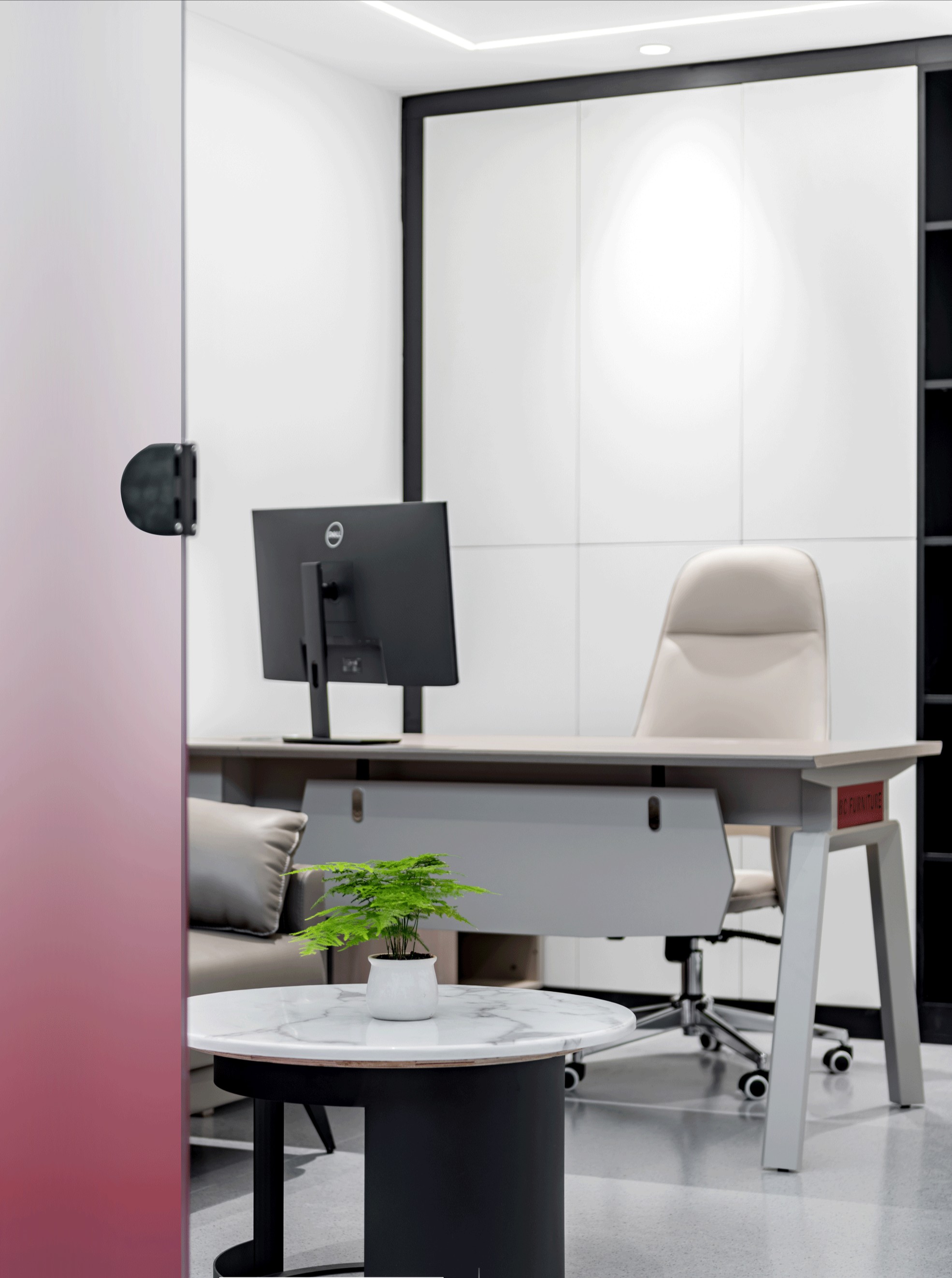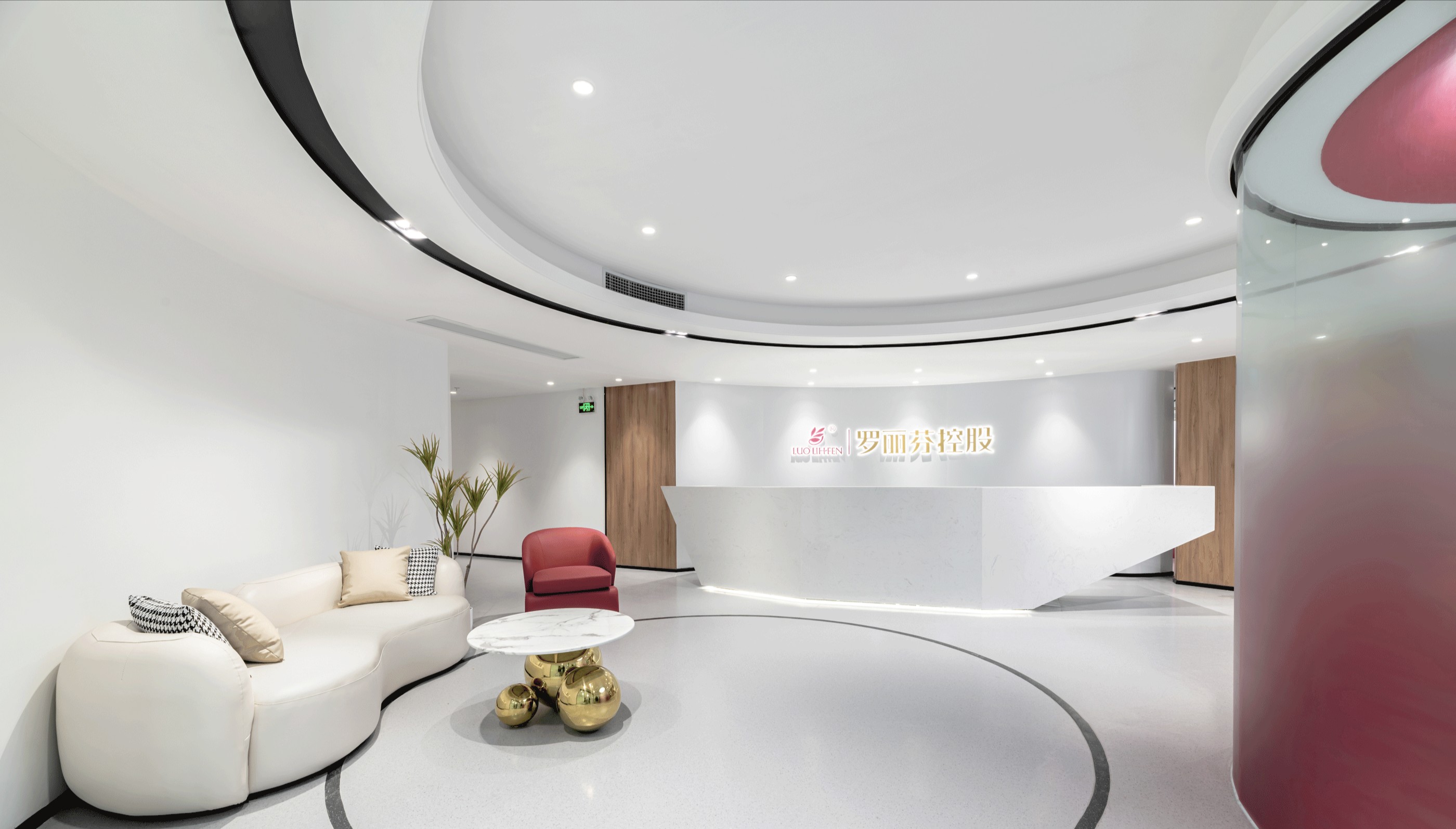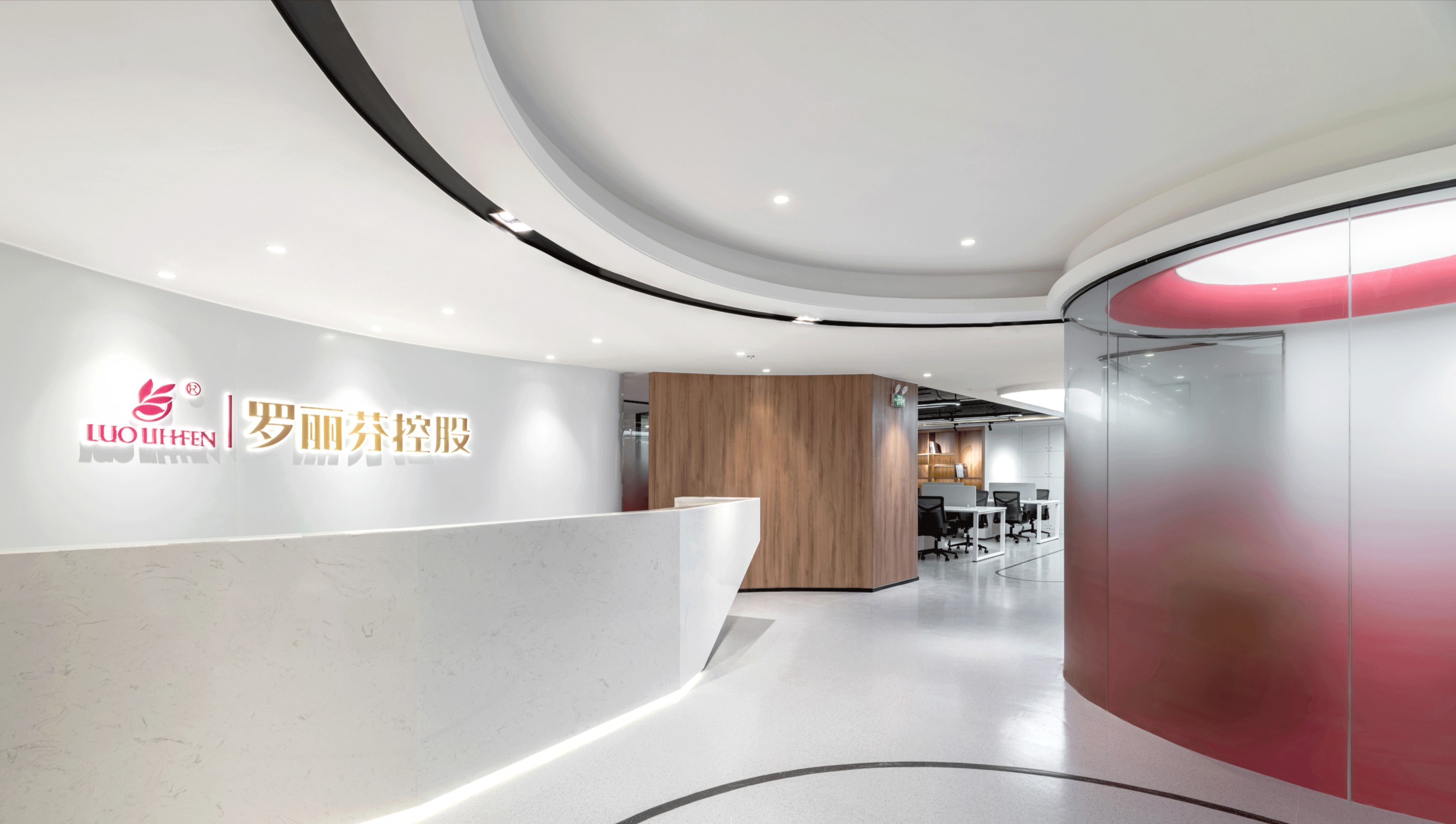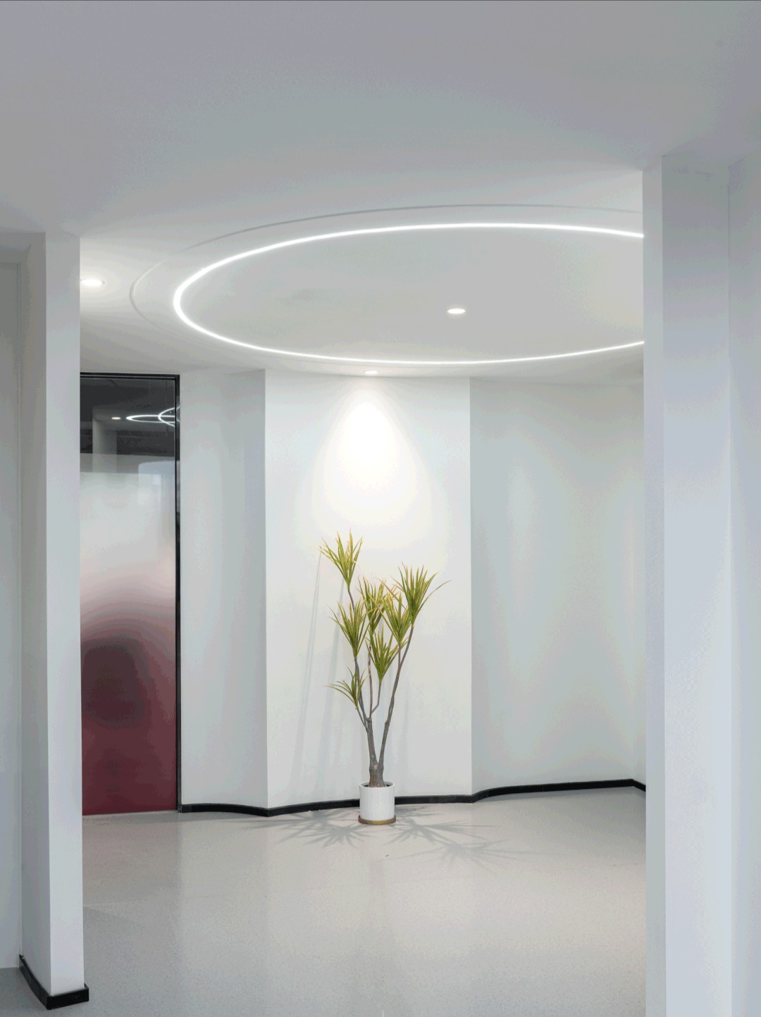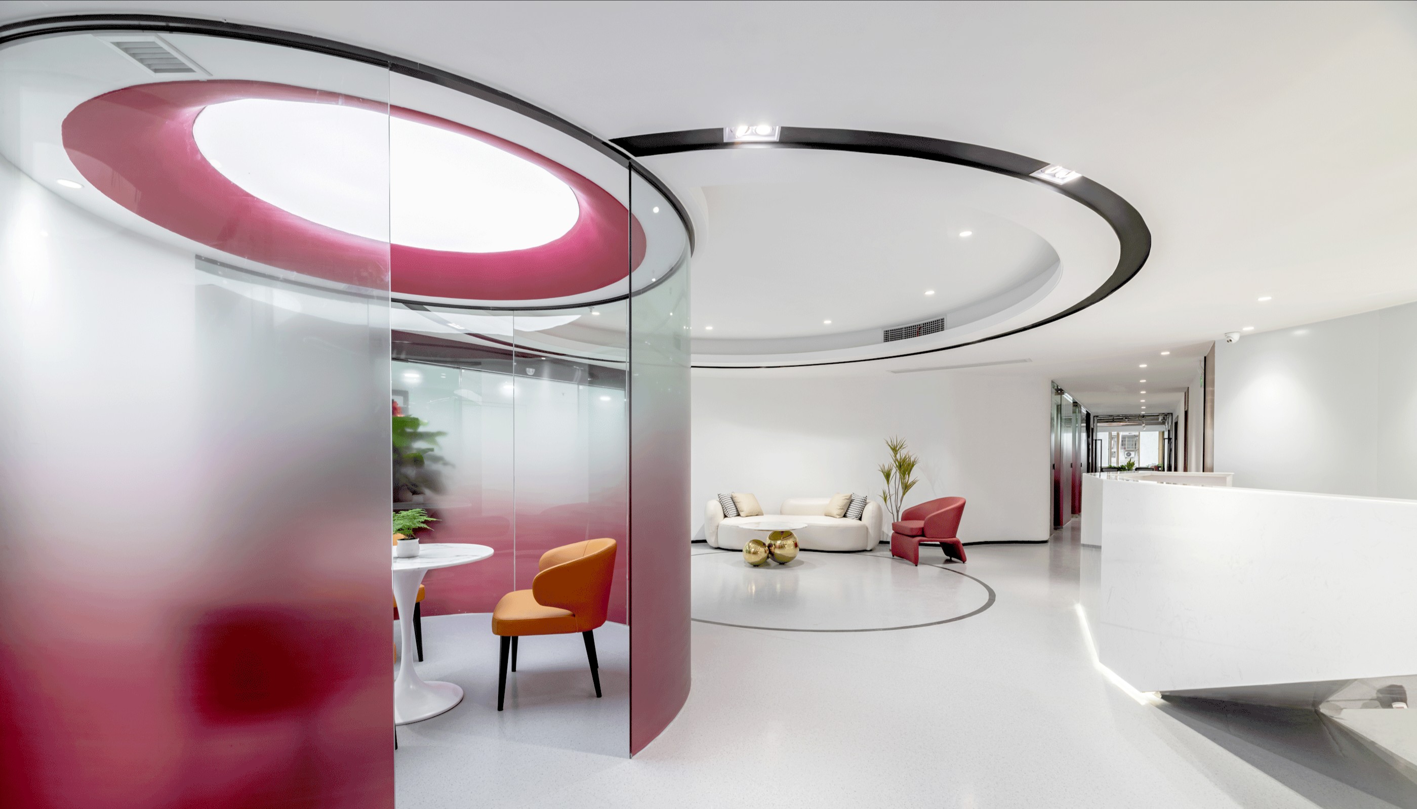 入口的细节,一进门的科技感,全景式交互让人瞬间沉浸其中,光以曲线的形式在天花游动。联结起空间的关系,同时运用弧形玻璃打造洽谈室,仿佛如遨游太空的船舱,提升空间的流动性和科技感。进门处的洽谈室和办公区的会议室均使用了渐变玻璃,颜色由紫红色向透明过渡,呼应罗丽芬LOGO。 开放办公区以自然感为主,给人以放松愉悦的办公环境,过道天花采用椭圆形透光膜照明,灯膜与地板的弧线相互呼应。来到多功能办公空间,办公IP以从事医美相关行业人群为主,开放的空间搭配轻巧的办公桌,可为后续培训或是聚会做出改变,空间元素上采用裸粉色加上具有女性代表的弧度,让空间更具柔美感。