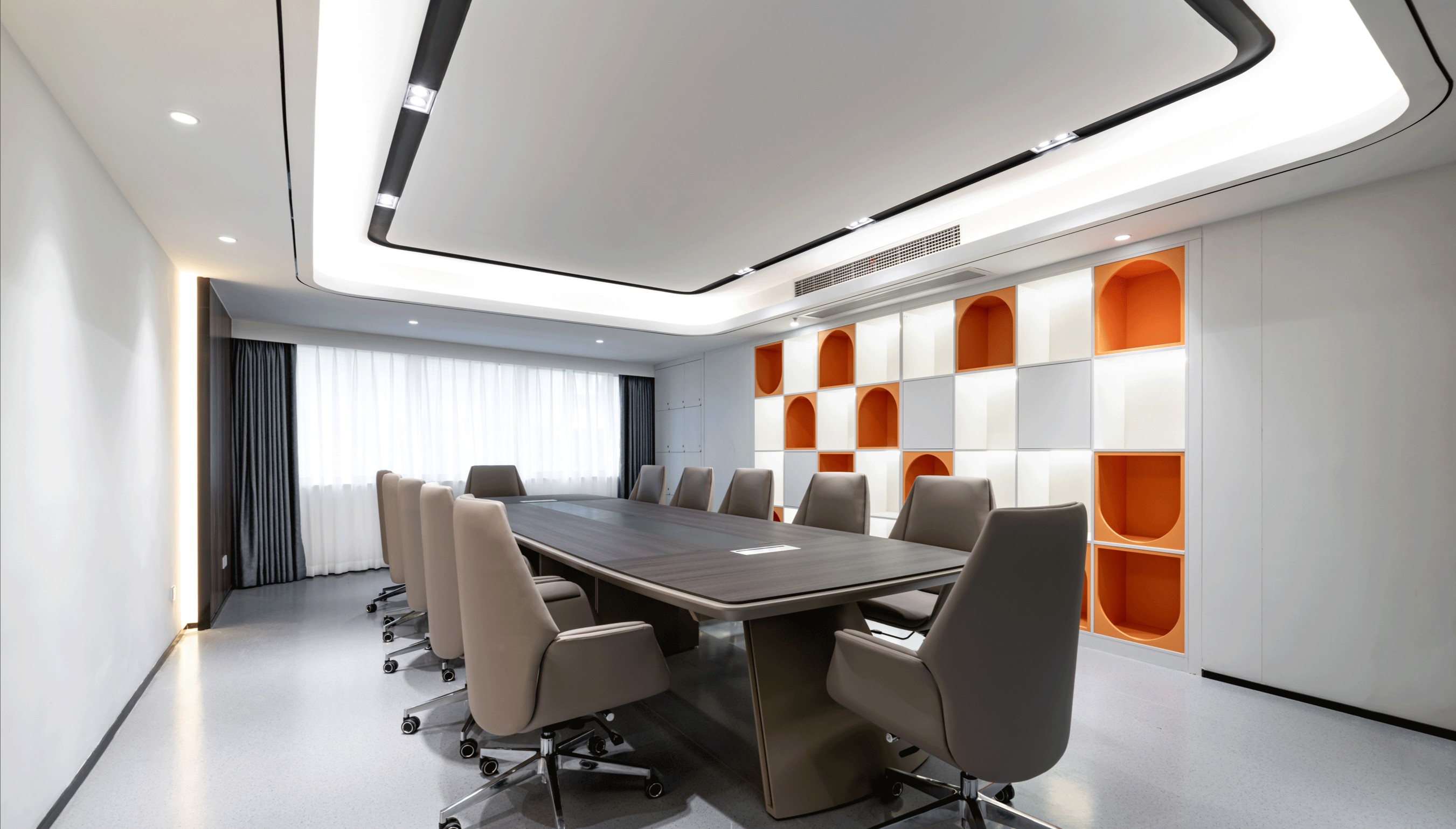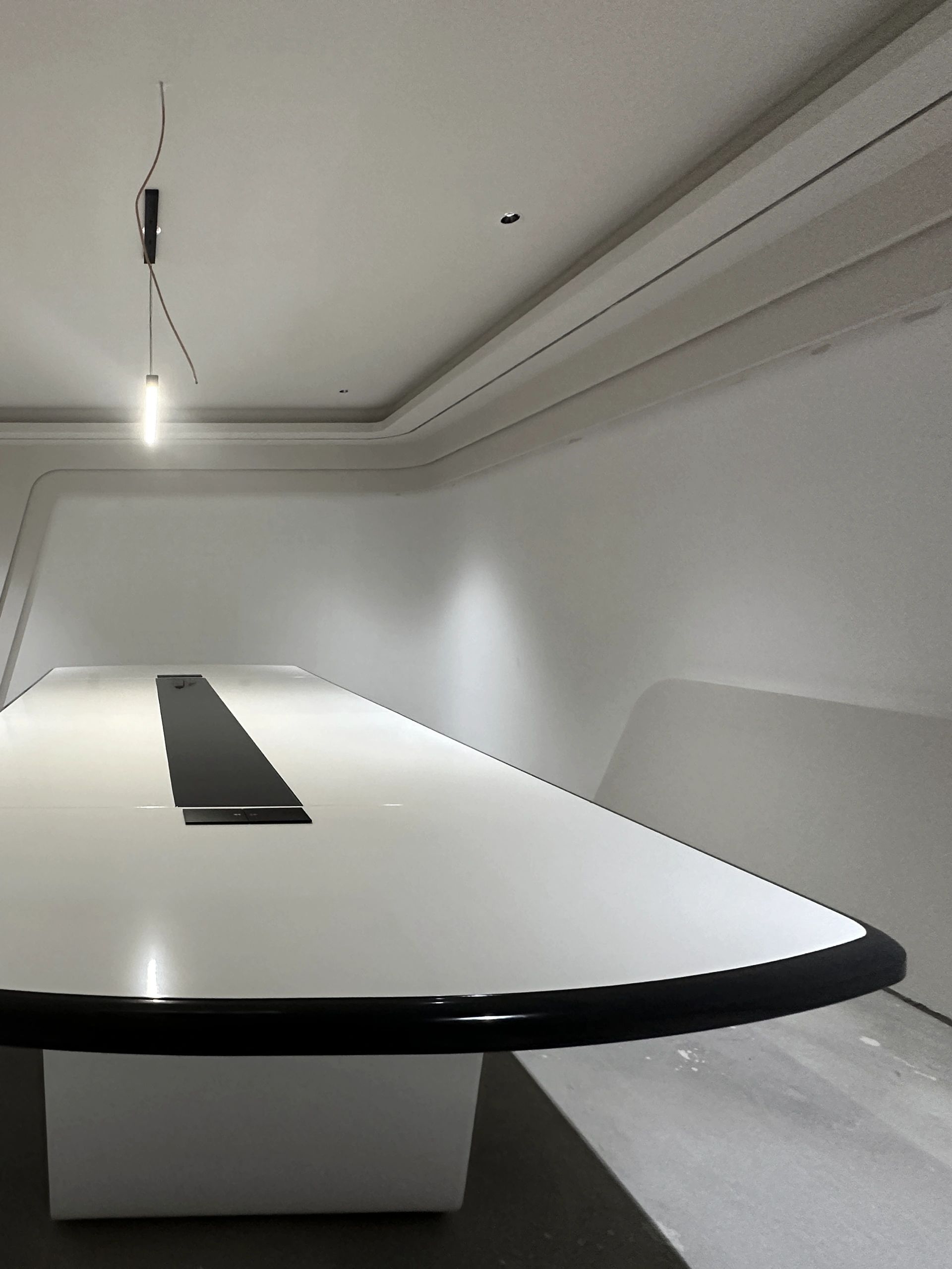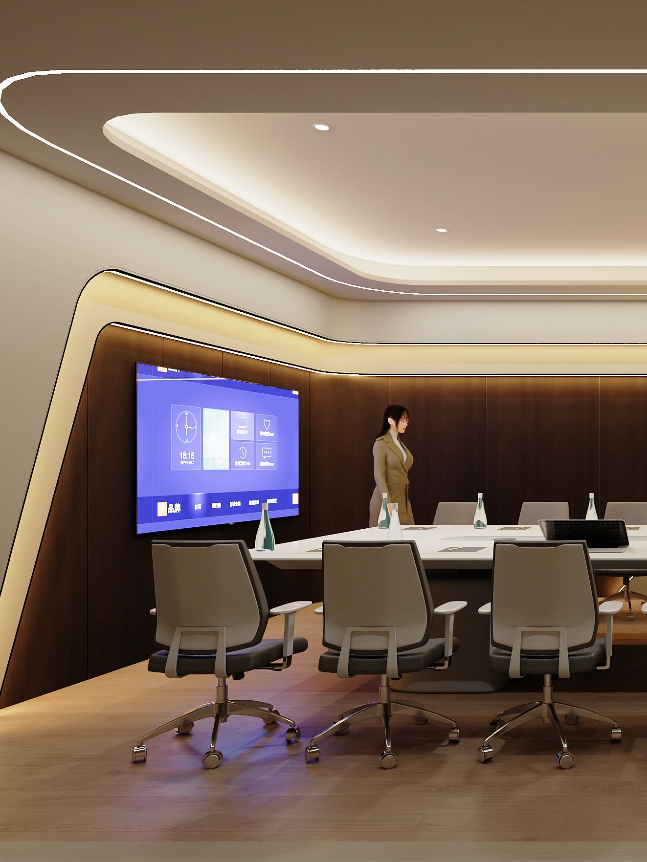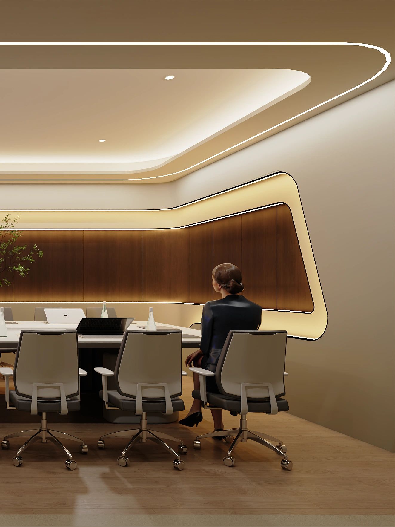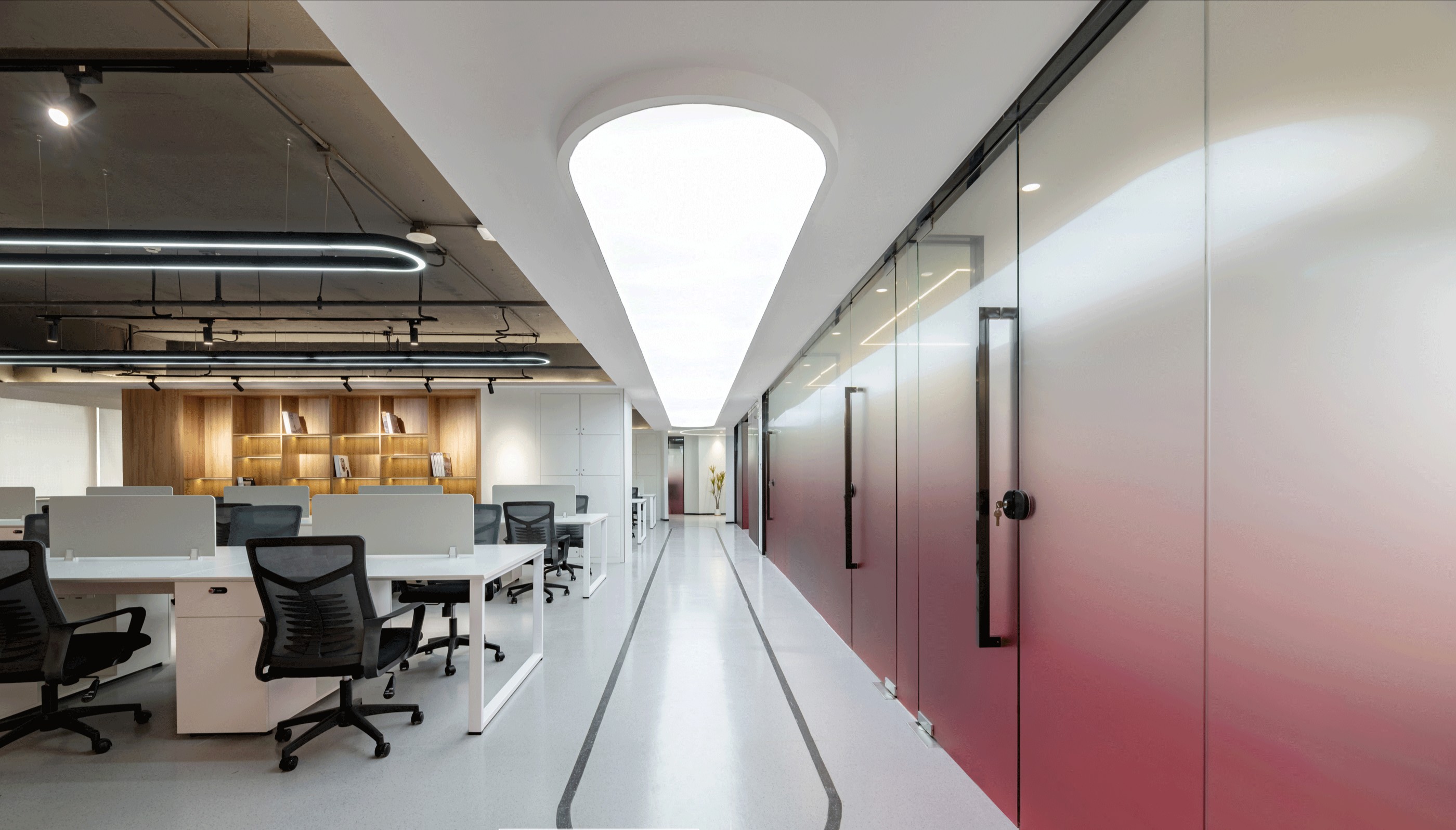 入口的细节,一进门的科技感,全景式交互让人瞬间沉浸其中,光以曲线的形式在天花游动。联结起空间的关系,同时运用弧形玻璃打造洽谈室,仿佛如遨游太空的船舱,提升空间的流动性和科技感。进门处的洽谈室和办公区的会议室均使用了渐变玻璃,颜色由紫红色向透明过渡,呼应罗丽芬LOGO。 开放办公区以自然感为主,给人以放松愉悦的办公环境,过道天花采用椭圆形透光膜照明,灯膜与地板的弧线相互呼应。来到多功能办公空间,办公IP以从事医美相关行业人群为主,开放的空间搭配轻巧的办公桌,可为后续培训或是聚会做出改变,空间元素上采用裸粉色加上具有女性代表的弧度,让空间更具柔美感。