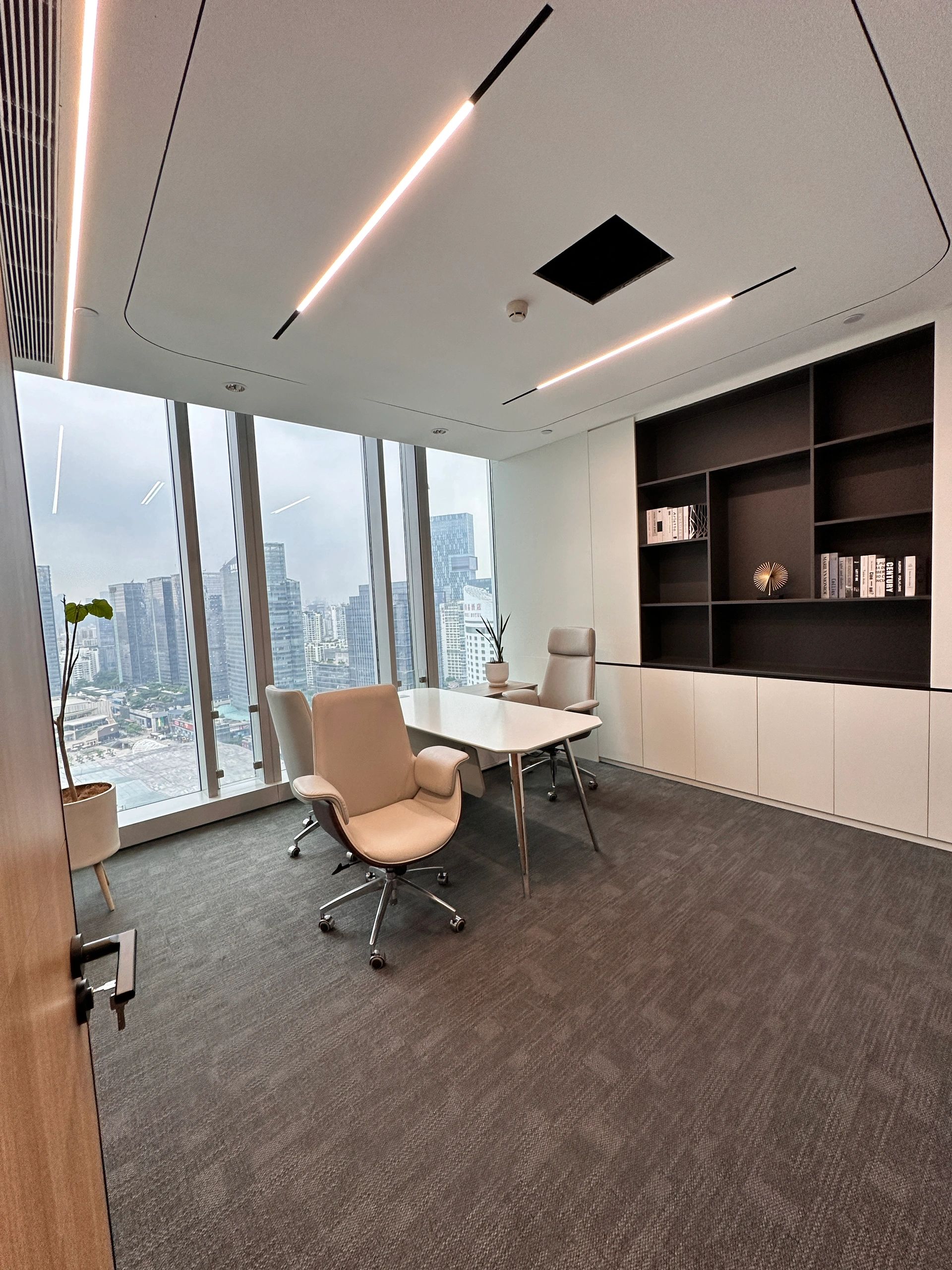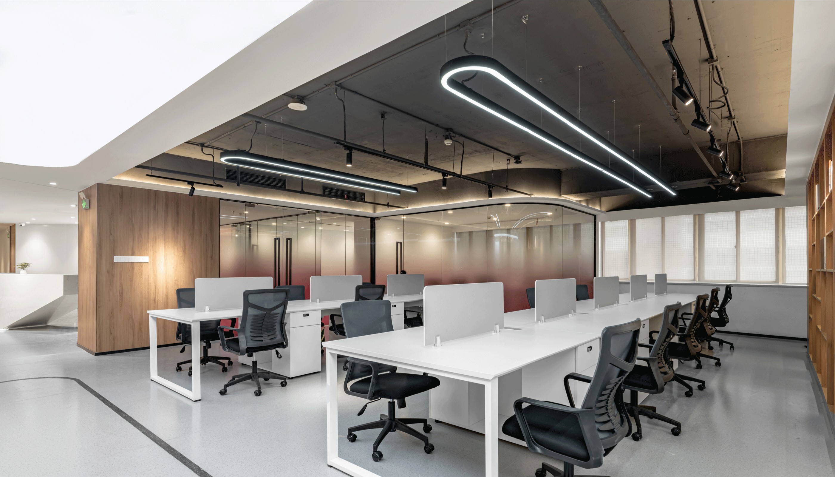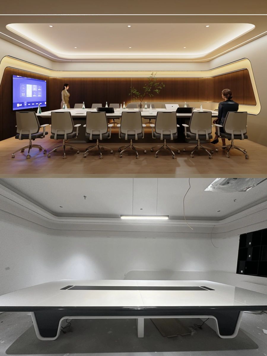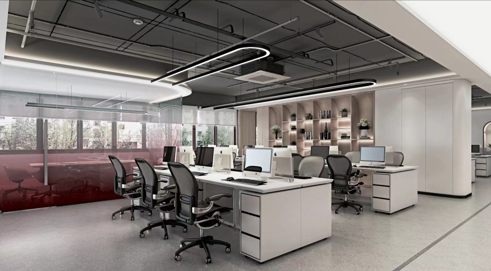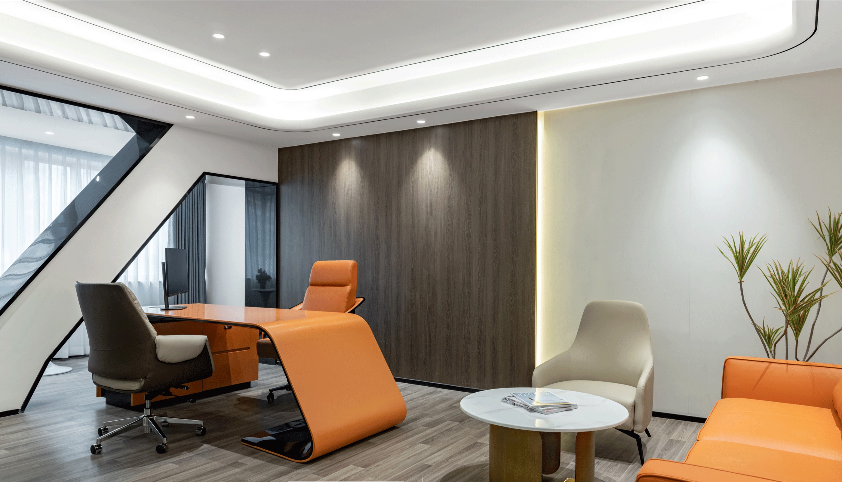 入口的细节,一进门的科技感,全景式交互让人瞬间沉浸其中,光以曲线的形式在天花游动。联结起空间的关系,同时运用弧形玻璃打造洽谈室,仿佛如遨游太空的船舱,提升空间的流动性和科技感。进门处的洽谈室和办公区的会议室均使用了渐变玻璃,颜色由紫红色向透明过渡,呼应罗丽芬LOGO。 开放办公区以自然感为主,给人以放松愉悦的办公环境,过道天花采用椭圆形透光膜照明,灯膜与地板的弧线相互呼应。来到多功能办公空间,办公IP以从事医美相关行业人群为主,开放的空间搭配轻巧的办公桌,可为后续培训或是聚会做出改变,空间元素上采用裸粉色加上具有女性代表的弧度,让空间更具柔美感。