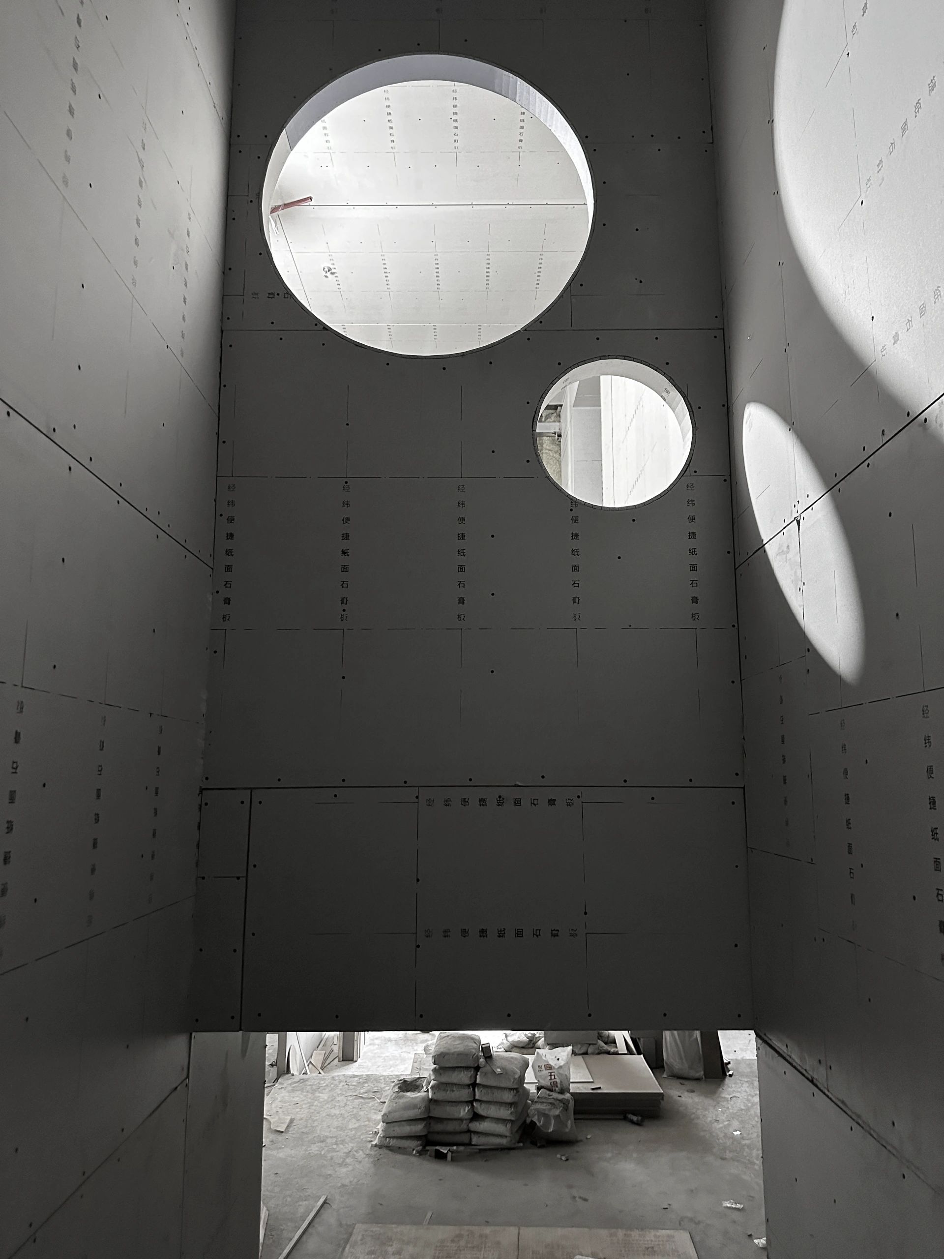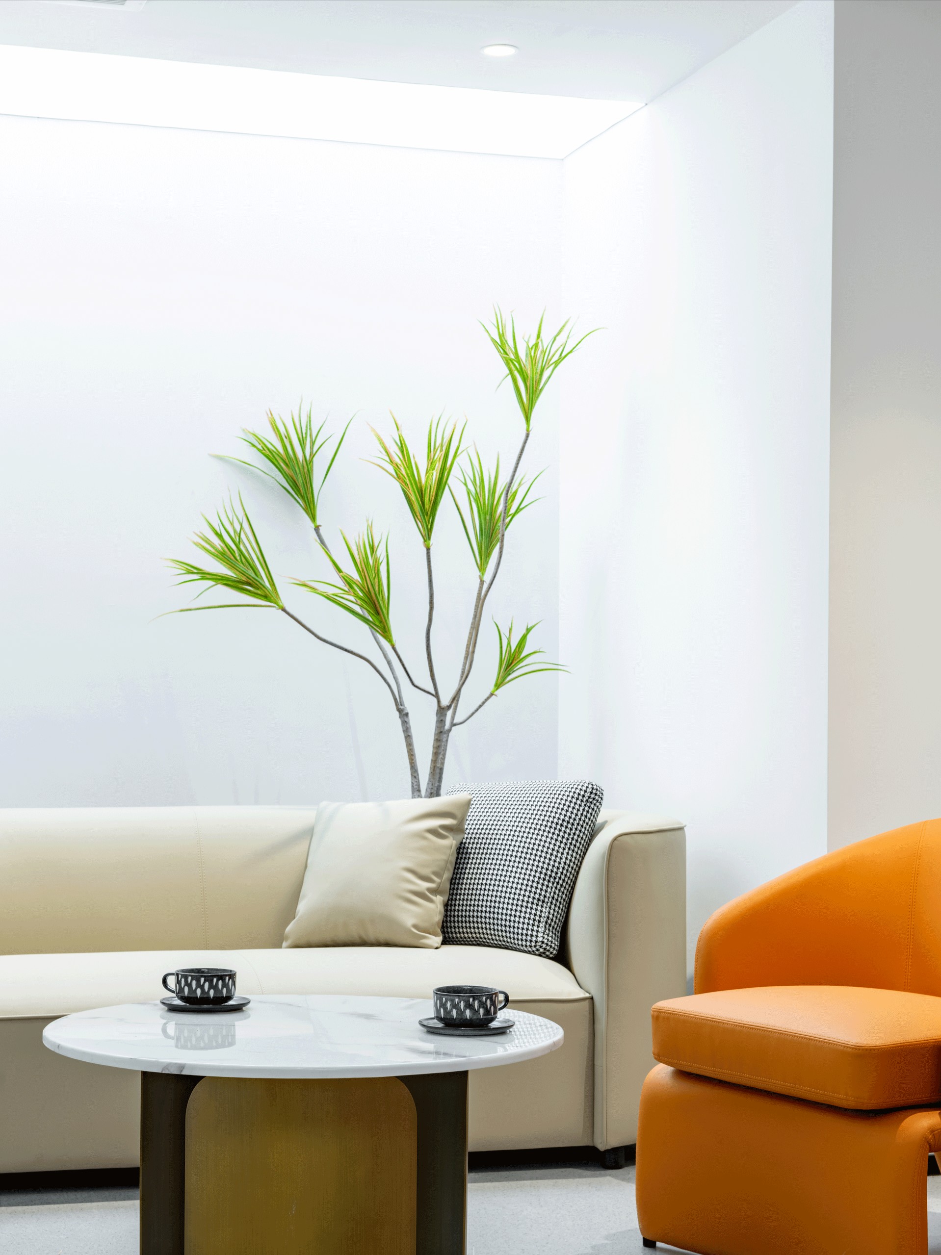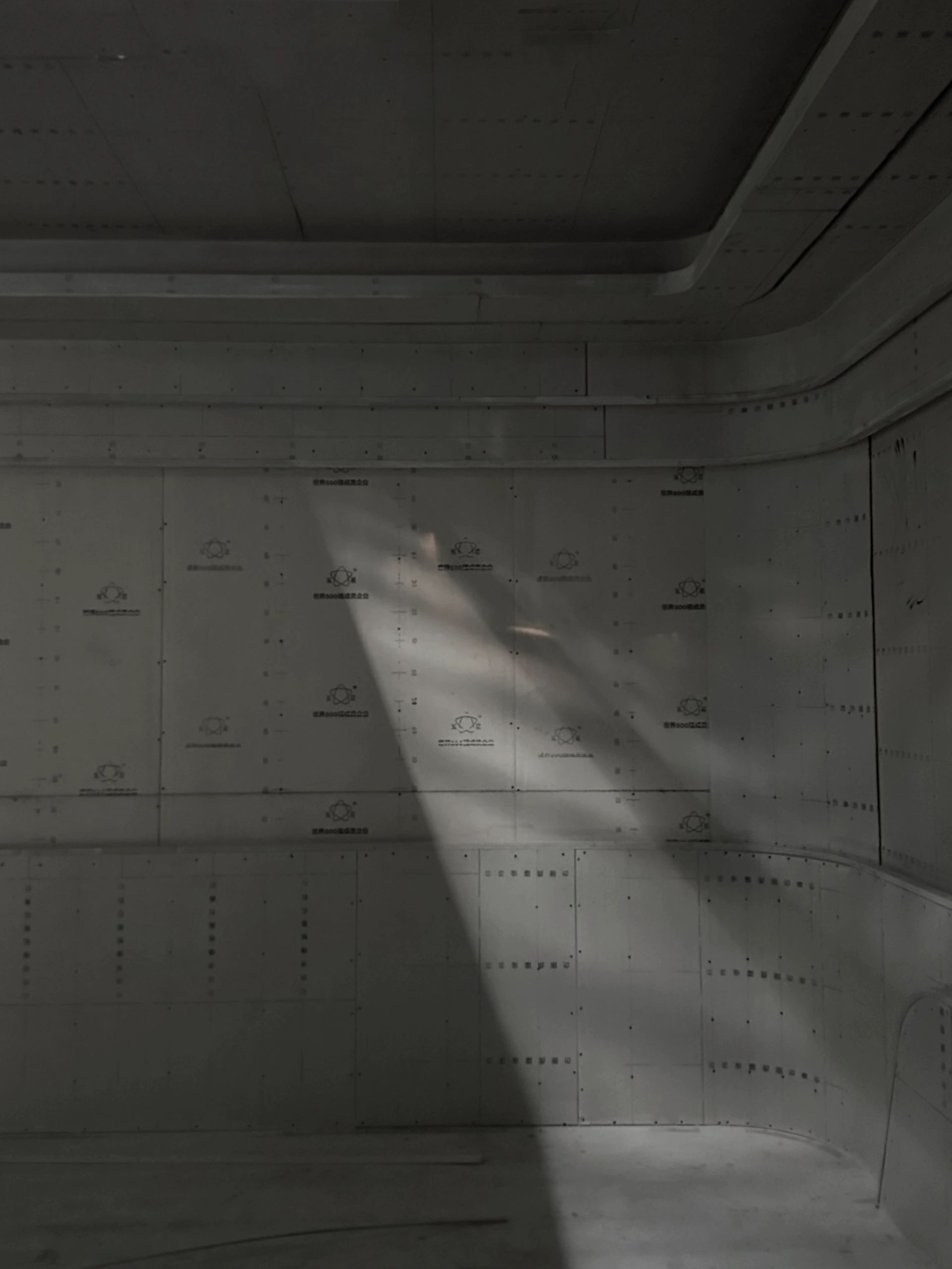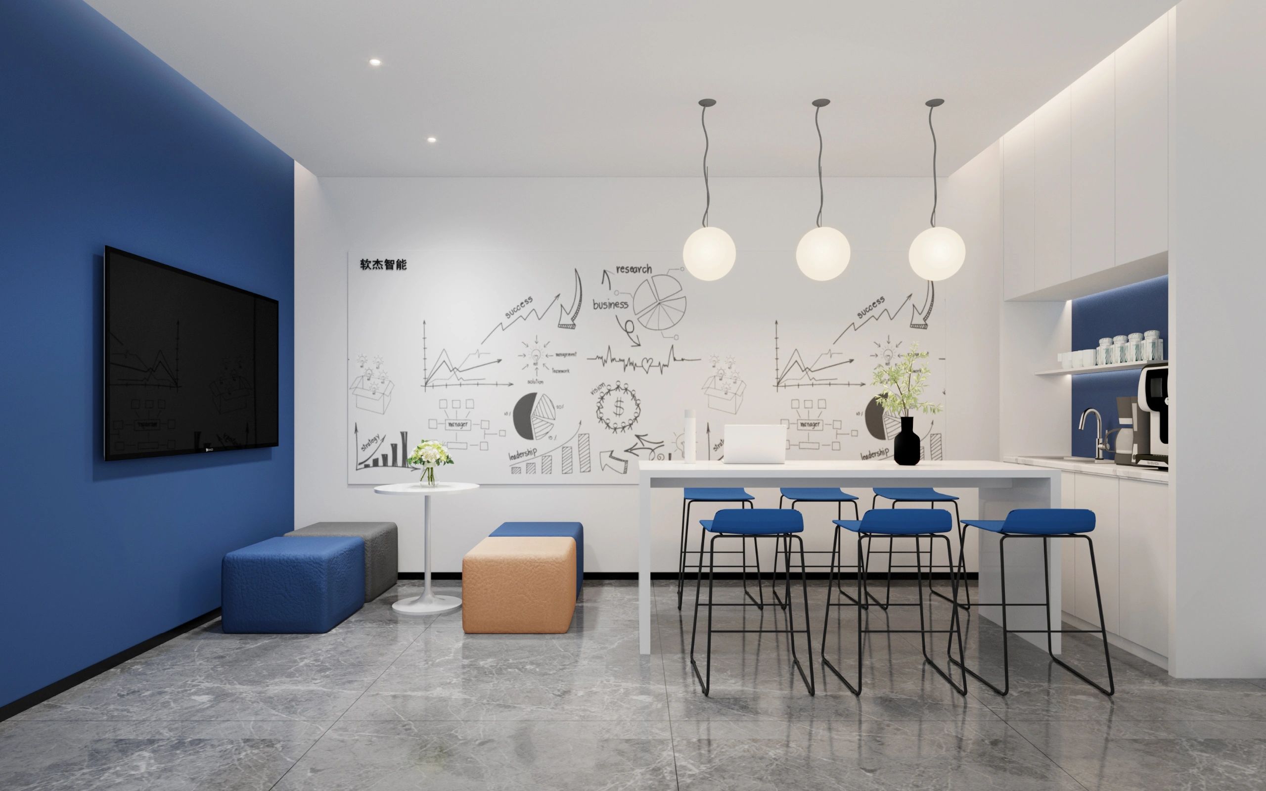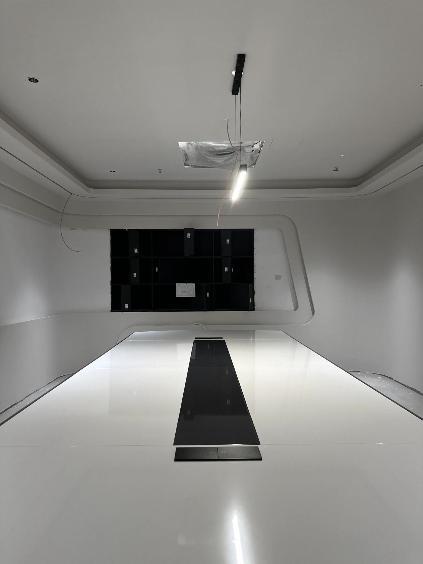 入口的细节,一进门的科技感,全景式交互让人瞬间沉浸其中,光以曲线的形式在天花游动。联结起空间的关系,同时运用弧形玻璃打造洽谈室,仿佛如遨游太空的船舱,提升空间的流动性和科技感。进门处的洽谈室和办公区的会议室均使用了渐变玻璃,颜色由紫红色向透明过渡,呼应罗丽芬LOGO。 开放办公区以自然感为主,给人以放松愉悦的办公环境,过道天花采用椭圆形透光膜照明,灯膜与地板的弧线相互呼应。来到多功能办公空间,办公IP以从事医美相关行业人群为主,开放的空间搭配轻巧的办公桌,可为后续培训或是聚会做出改变,空间元素上采用裸粉色加上具有女性代表的弧度,让空间更具柔美感。