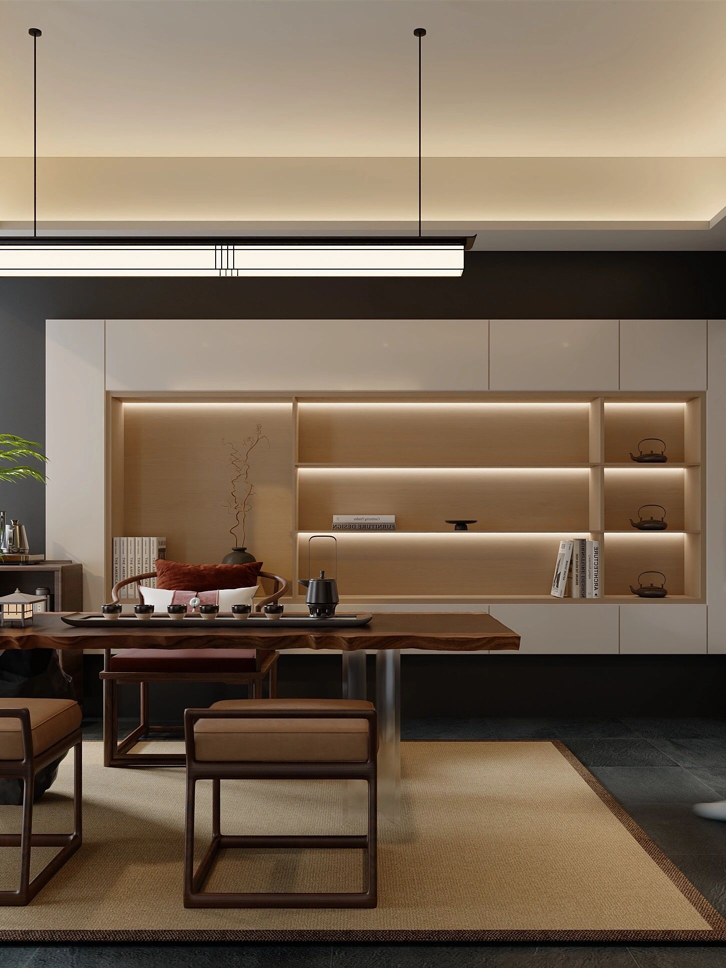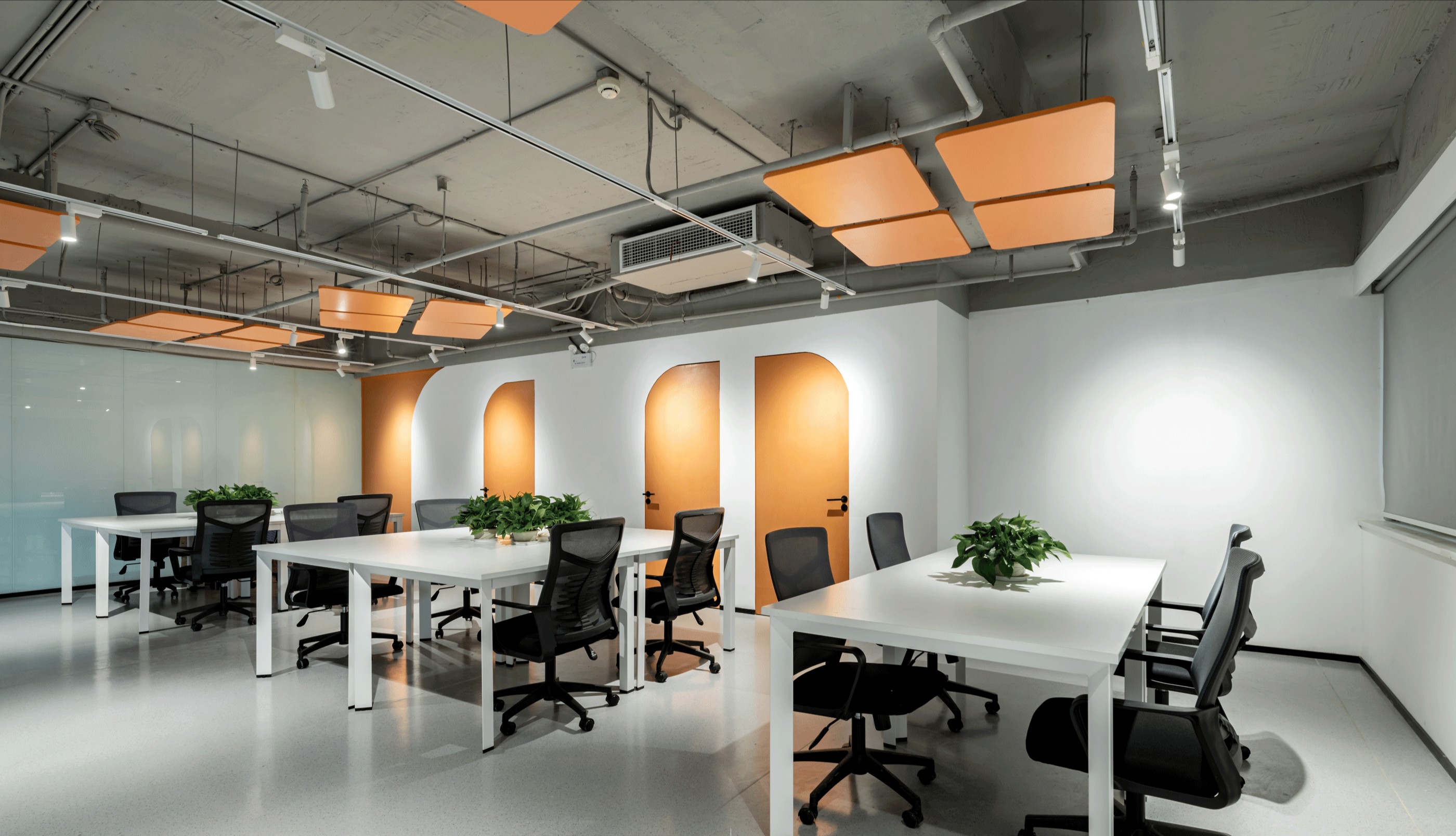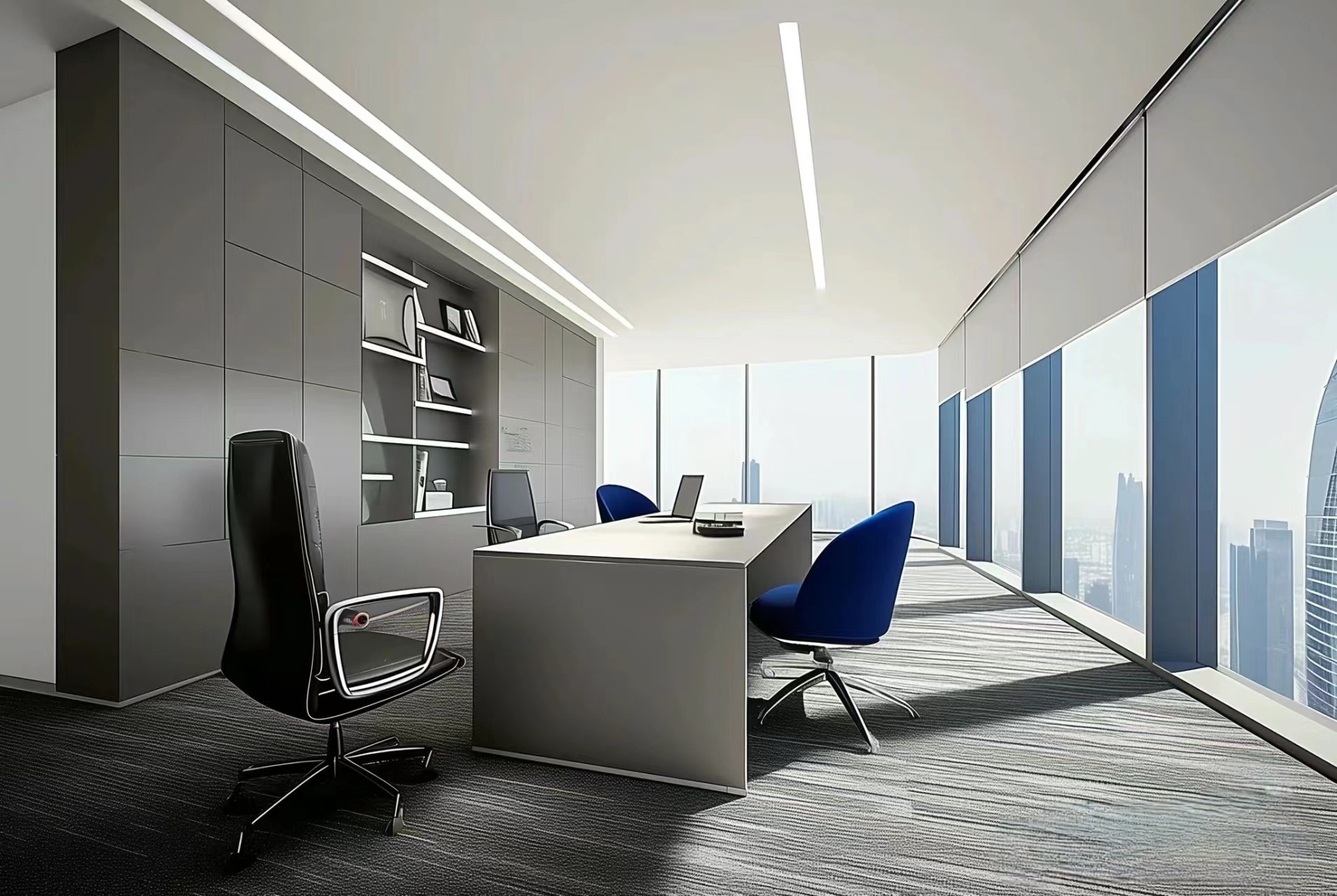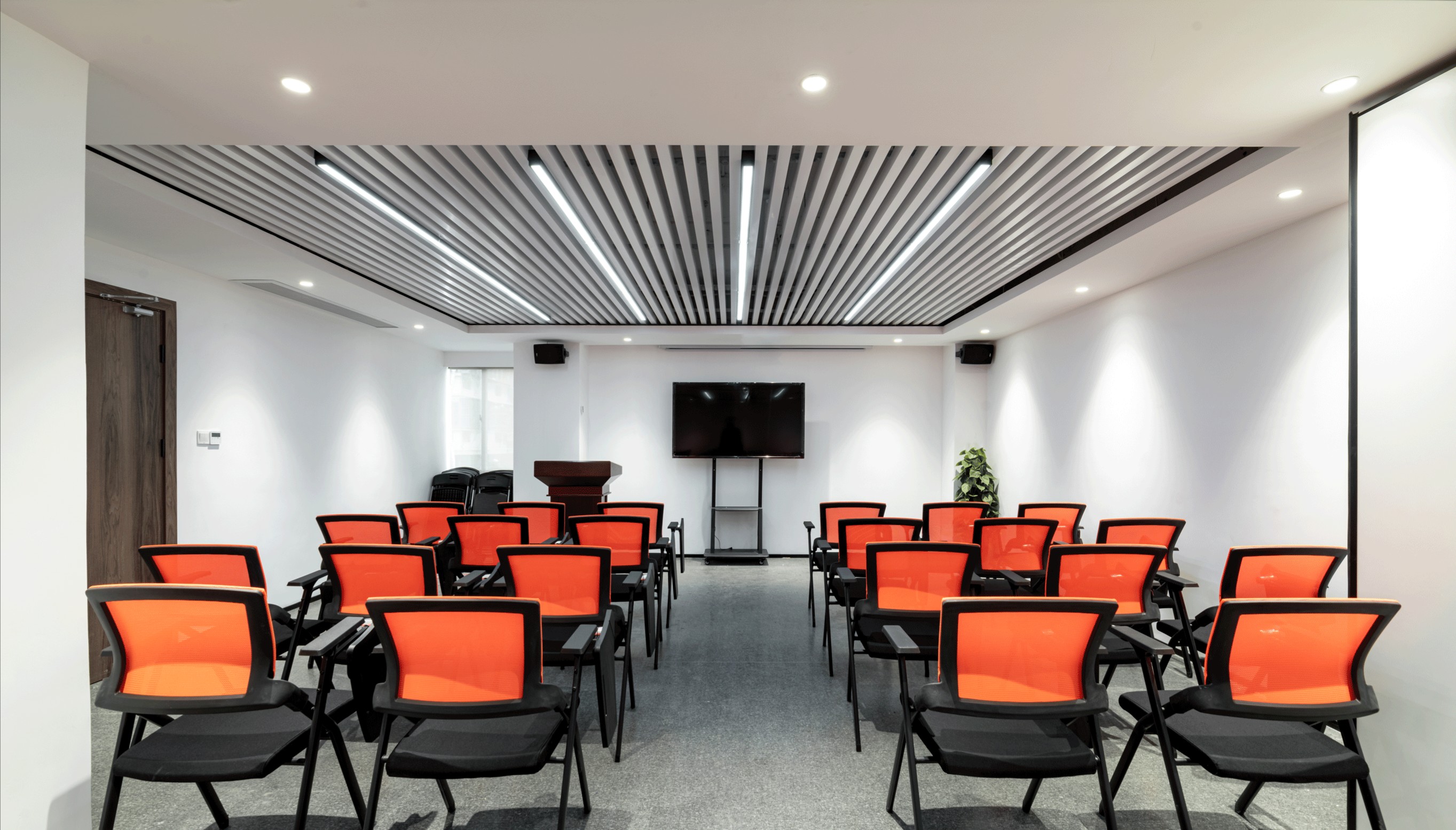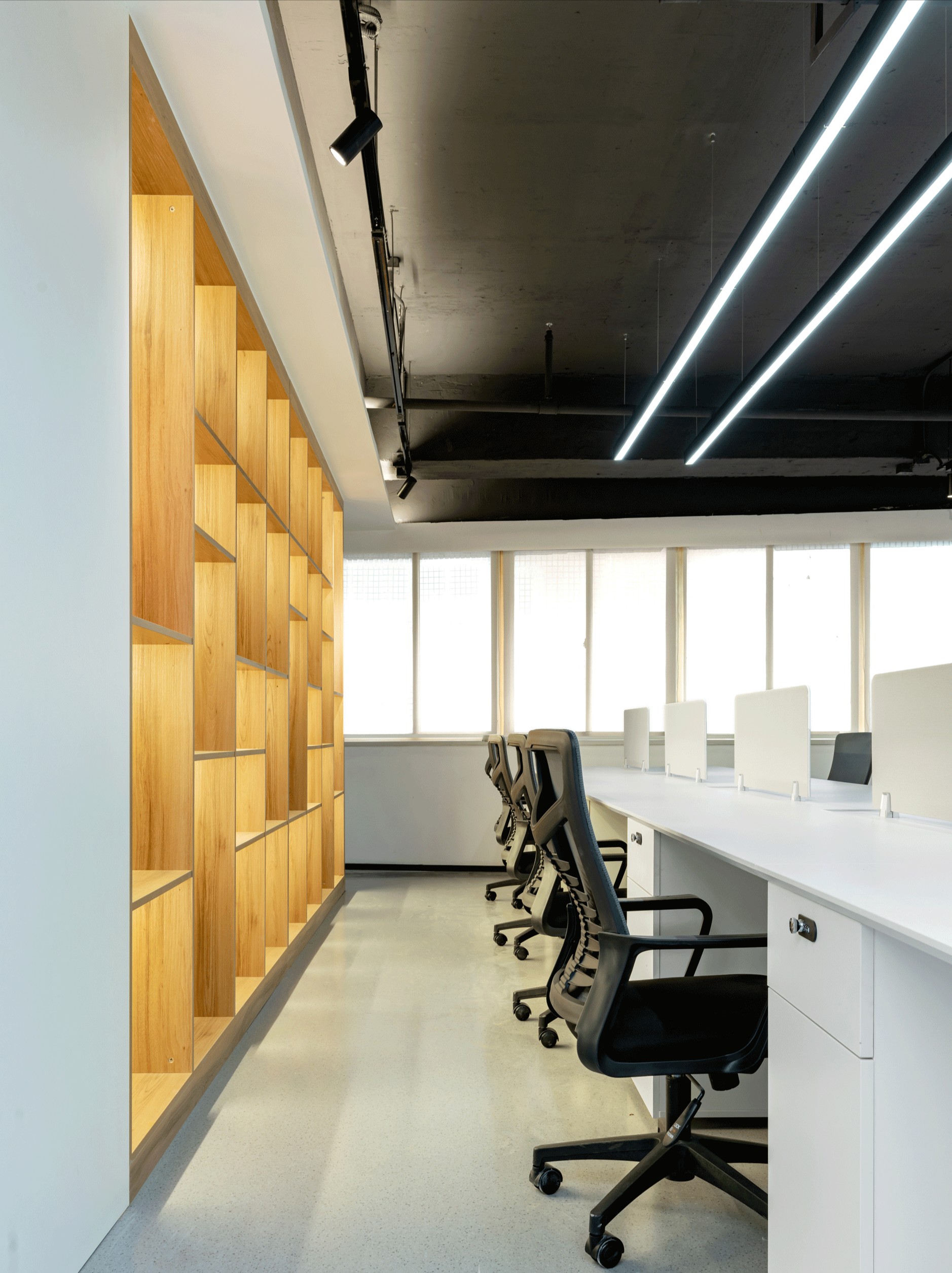 入口的细节,一进门的科技感,全景式交互让人瞬间沉浸其中,光以曲线的形式在天花游动。联结起空间的关系,同时运用弧形玻璃打造洽谈室,仿佛如遨游太空的船舱,提升空间的流动性和科技感。进门处的洽谈室和办公区的会议室均使用了渐变玻璃,颜色由紫红色向透明过渡,呼应罗丽芬LOGO。 开放办公区以自然感为主,给人以放松愉悦的办公环境,过道天花采用椭圆形透光膜照明,灯膜与地板的弧线相互呼应。来到多功能办公空间,办公IP以从事医美相关行业人群为主,开放的空间搭配轻巧的办公桌,可为后续培训或是聚会做出改变,空间元素上采用裸粉色加上具有女性代表的弧度,让空间更具柔美感。