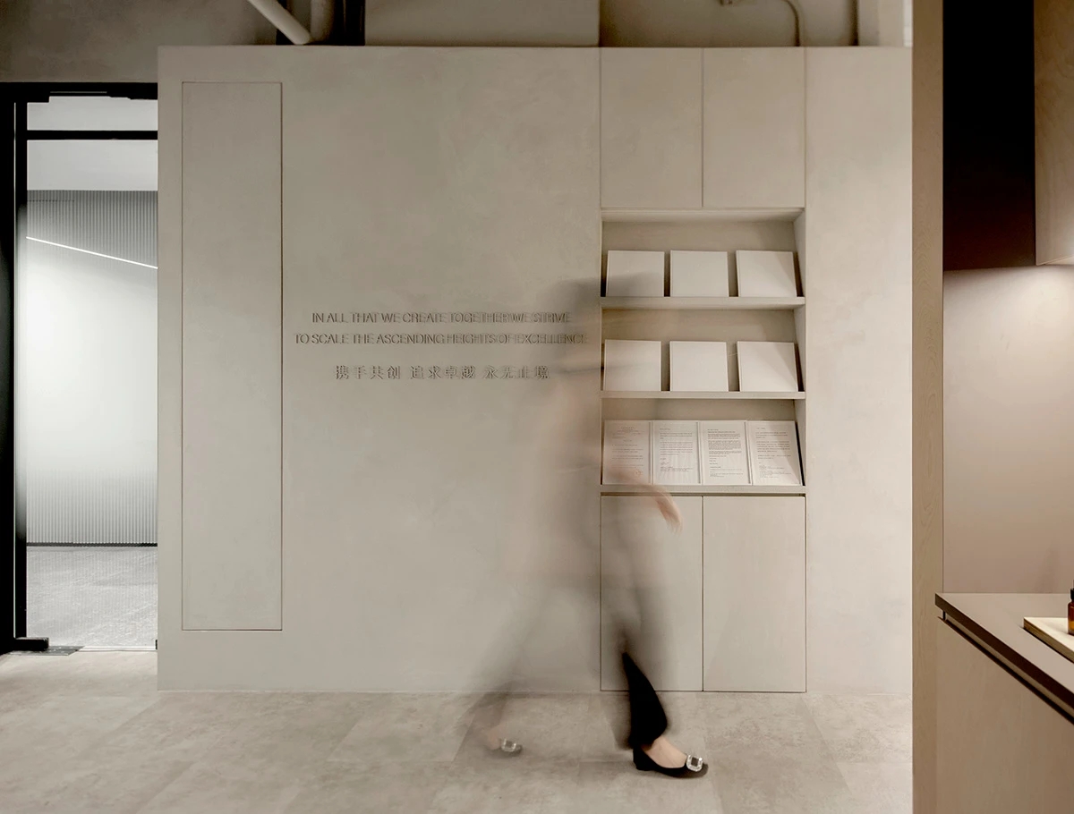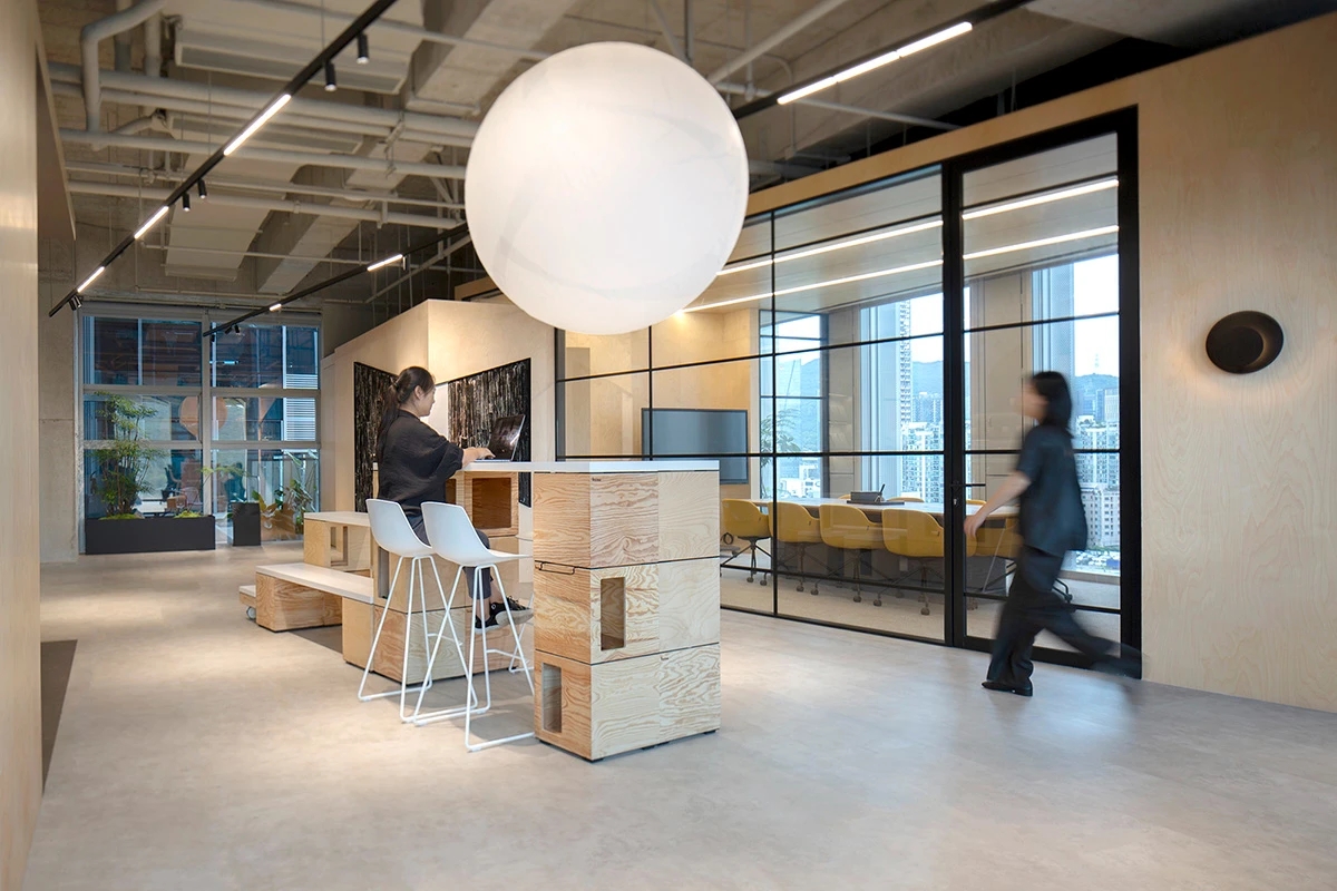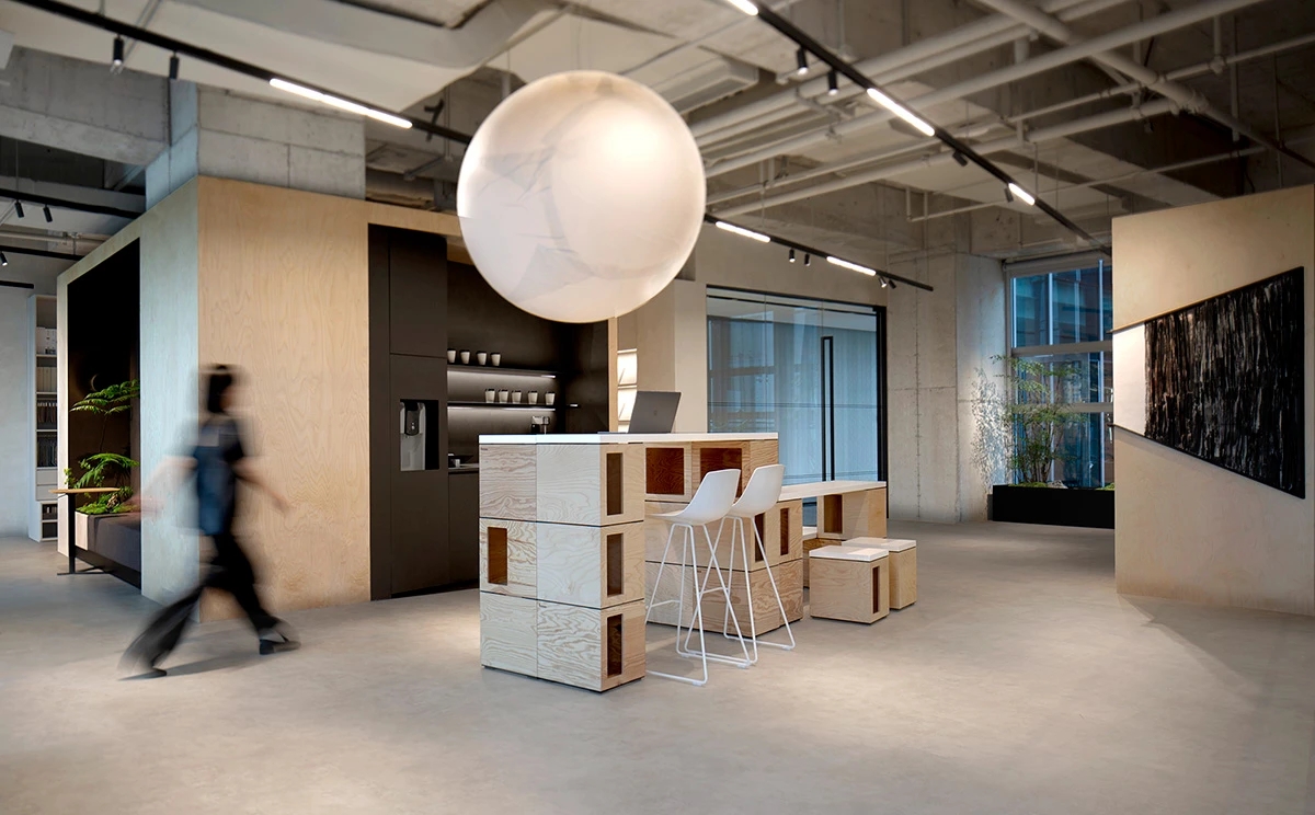开放式布局增进流动和连通感。会议室位于幕墙旁边,开放式咖啡吧及材料室位于正中央。不同高度的体量加强了空间的纵深感与延展性。开敞灵活的中央区域以超大的“月球”灯为中心,配备模块化家具,可进行多种灵活组装,而舒适的休闲区和壁龛则为团队协作提供了非正式的舒适空间。