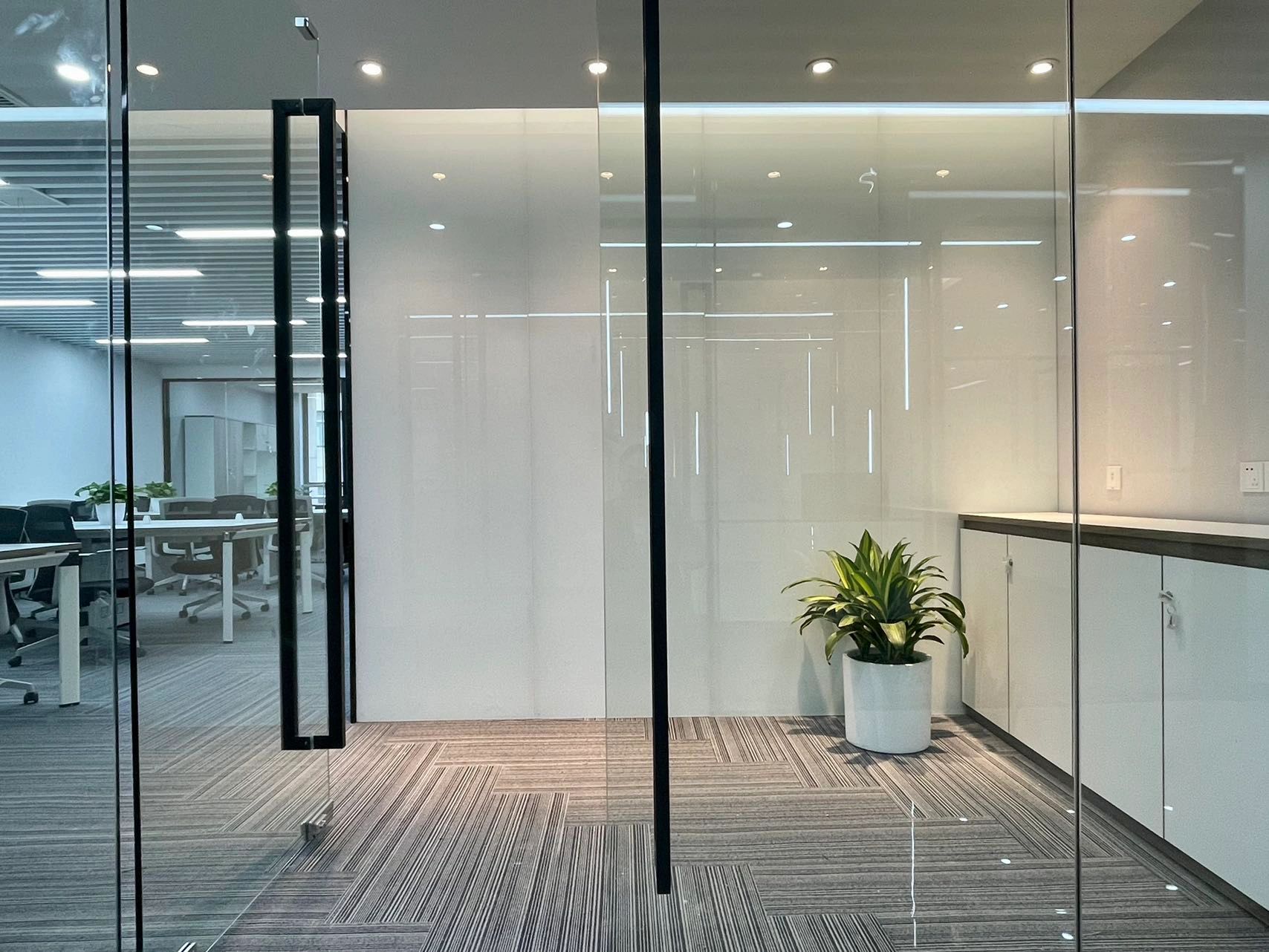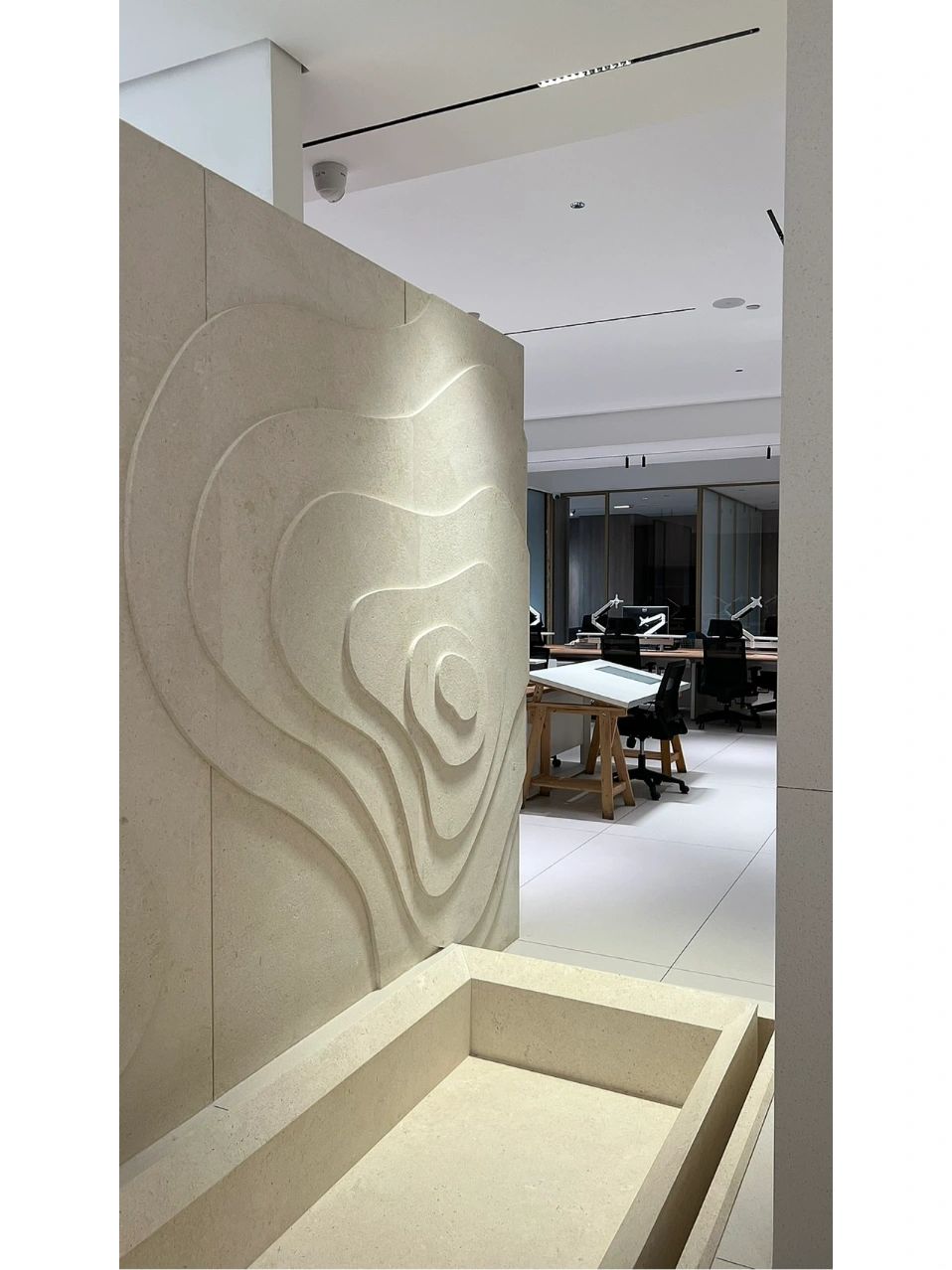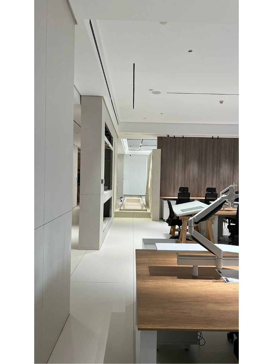 开放式布局增进流动和连通感。会议室位于幕墙旁边,开放式咖啡吧及材料室位于正中央。不同高度的体量加强了空间的纵深感与延展性。开敞灵活的中央区域以超大的“月球”灯为中心,配备模块化家具,可进行多种灵活组装,而舒适的休闲区和壁龛则为团队协作提供了非正式的舒适空间。