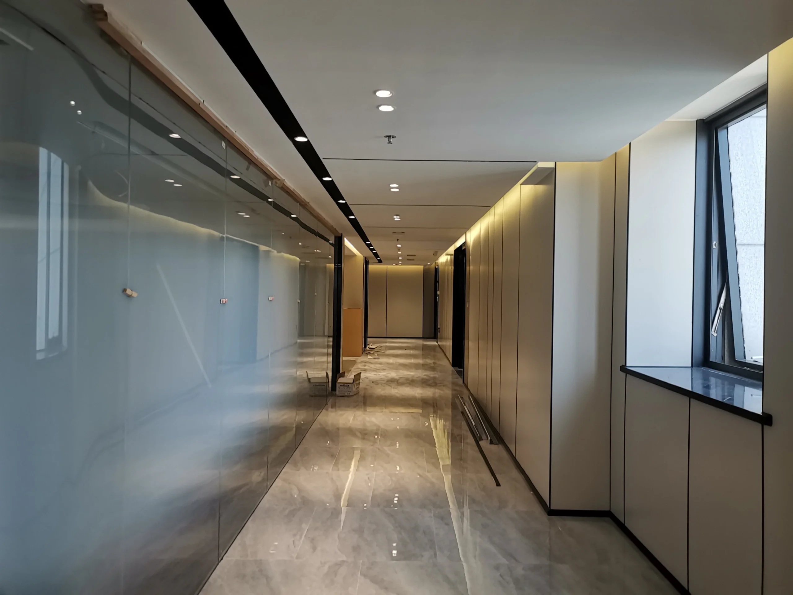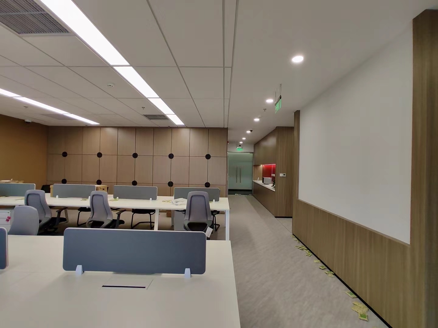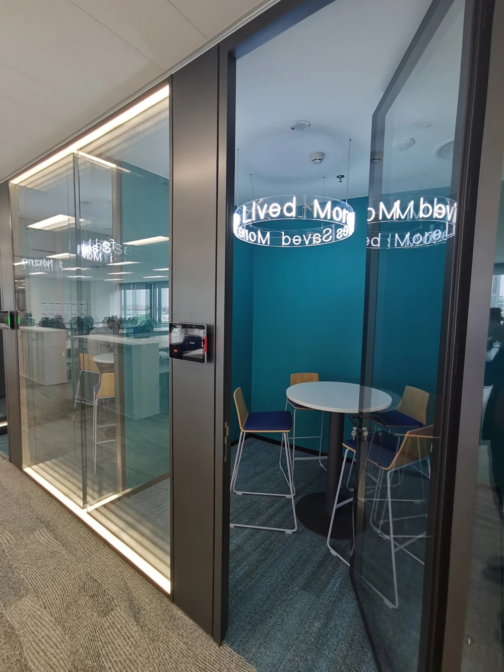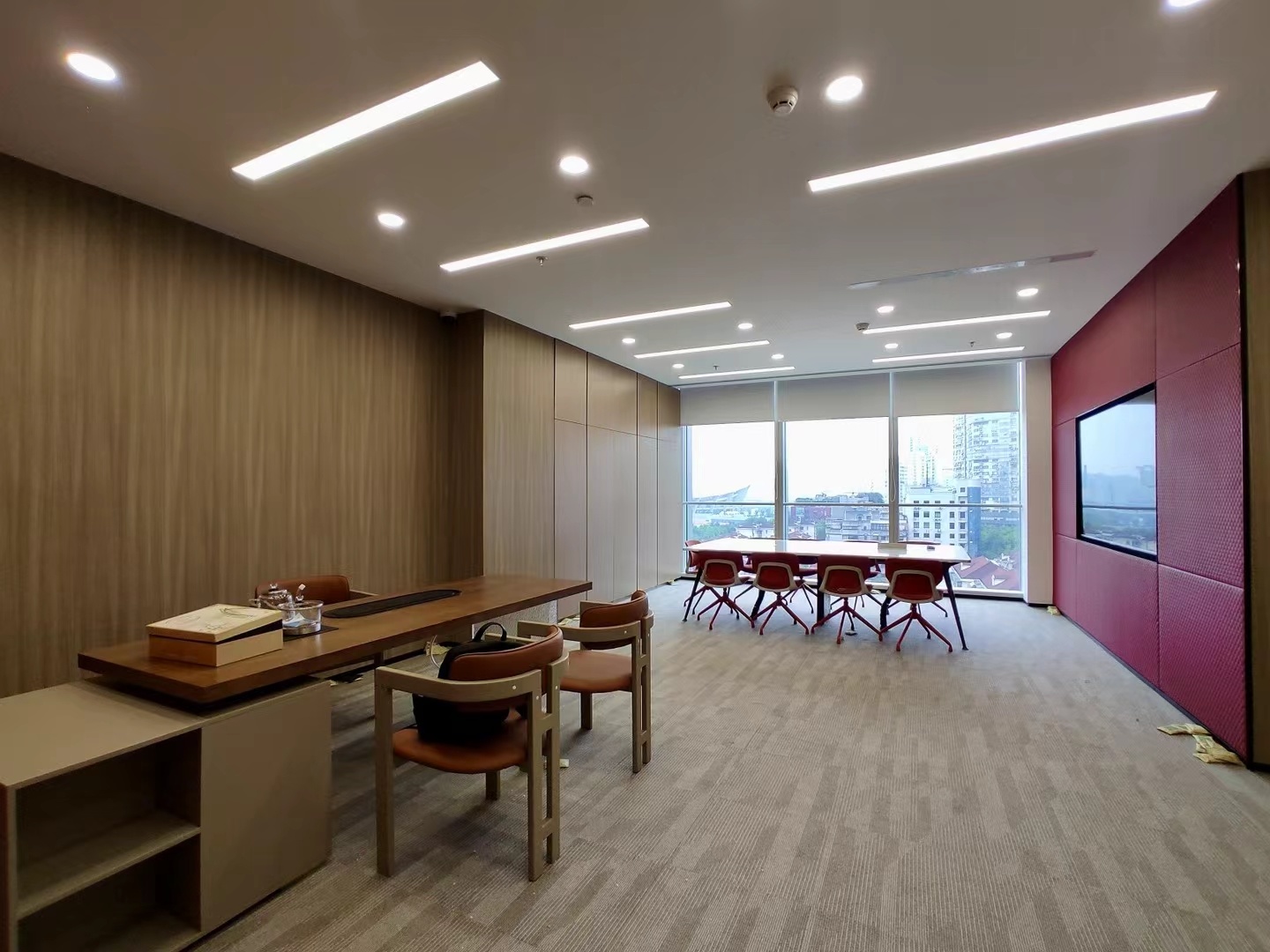 在接待前厅左右两边各设置了一个大会议室,其中一个是现代酷灰的可二合一的会议室,另一个是稳重优雅的行政会议室。感谢成品隔断供应商卡莱斯卓的紧密配合和支持,在设计师的要求下,把LED灯带嵌入了双层玻璃隔断中。让整个会议室区域看上去充满科技感!
