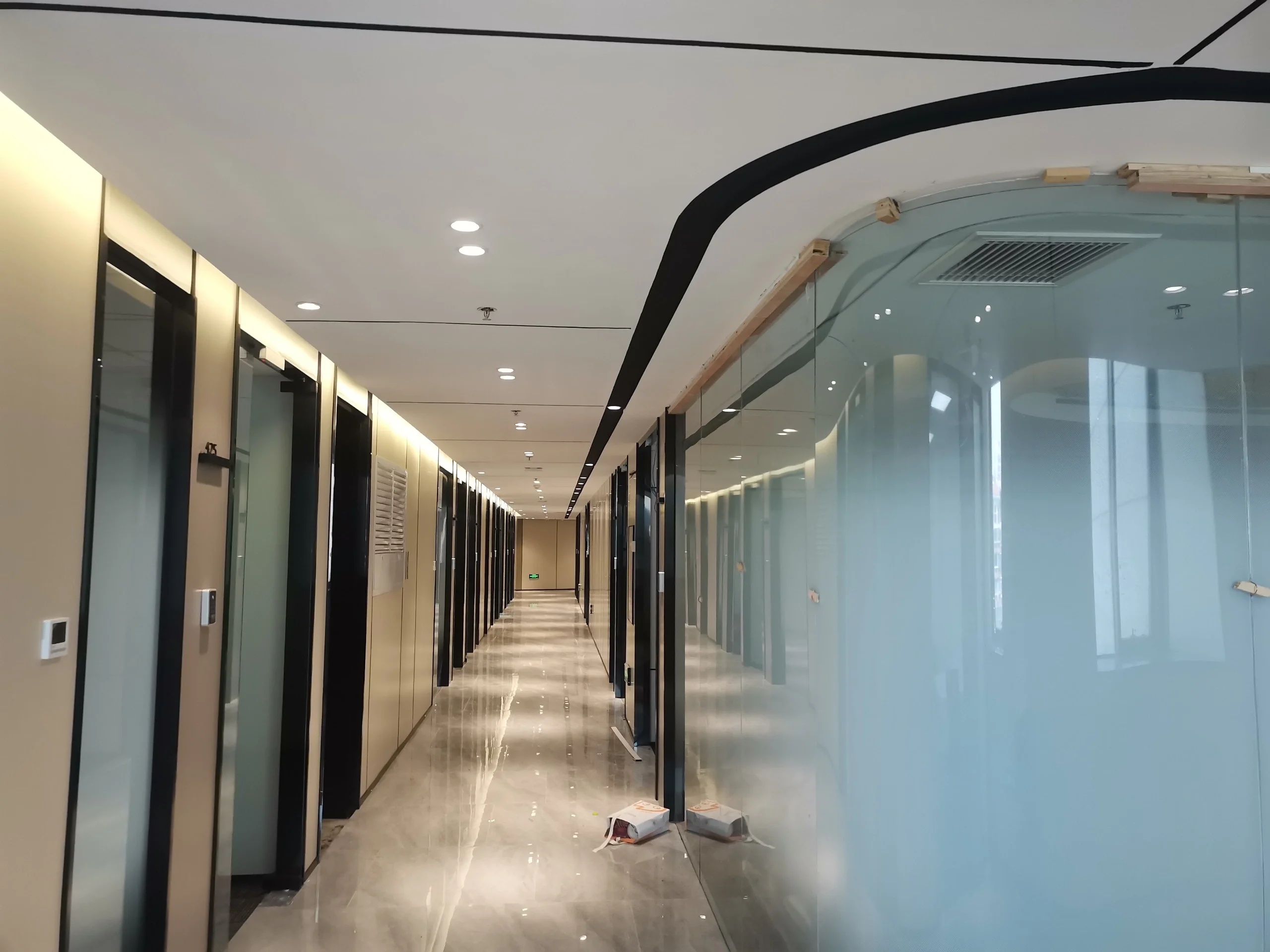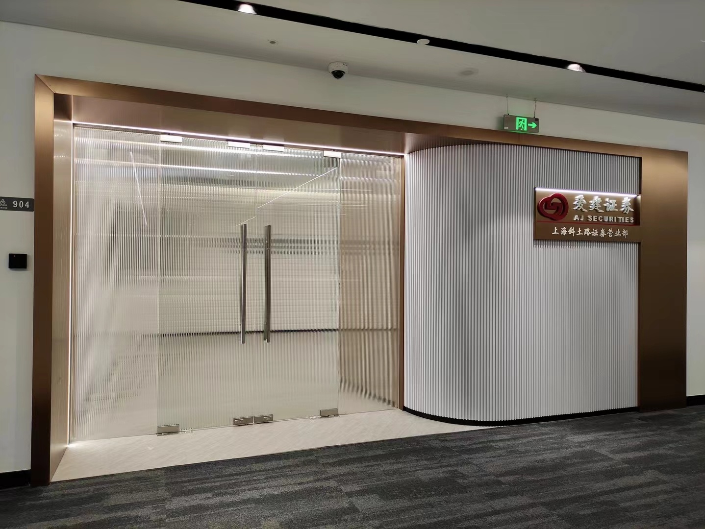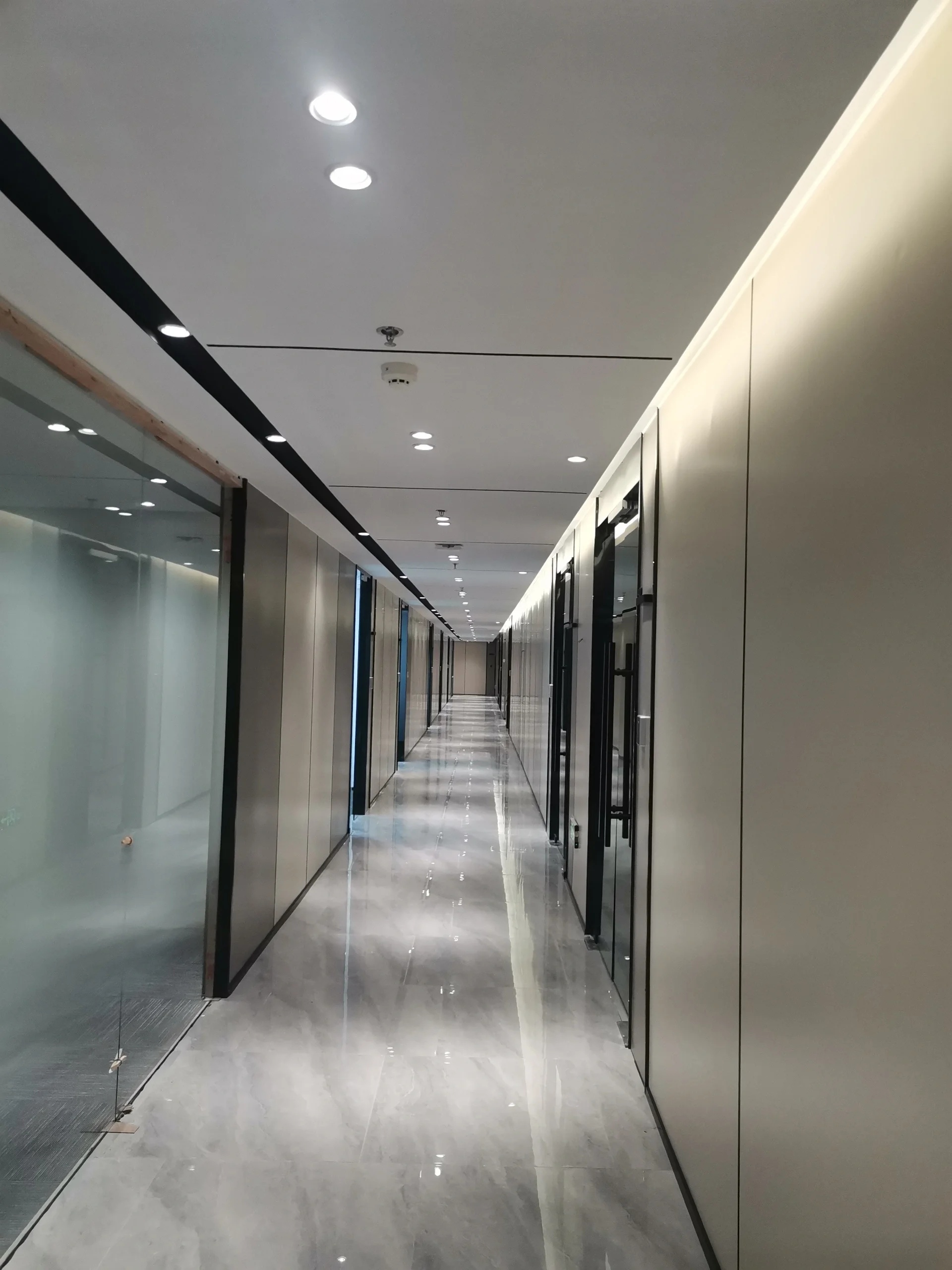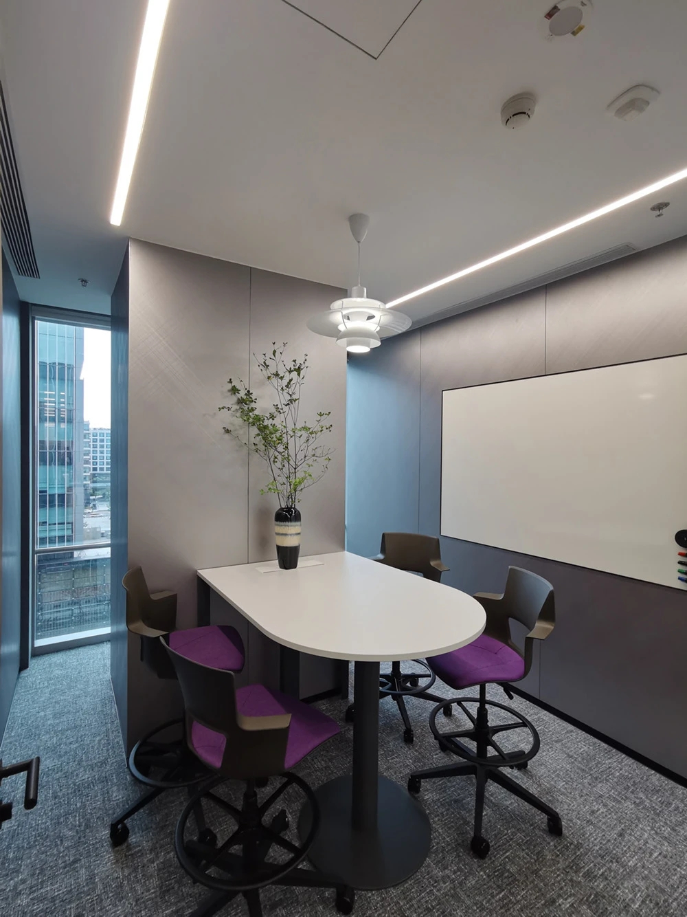 在接待前厅左右两边各设置了一个大会议室,其中一个是现代酷灰的可二合一的会议室,另一个是稳重优雅的行政会议室。感谢成品隔断供应商卡莱斯卓的紧密配合和支持,在设计师的要求下,把LED灯带嵌入了双层玻璃隔断中。让整个会议室区域看上去充满科技感!