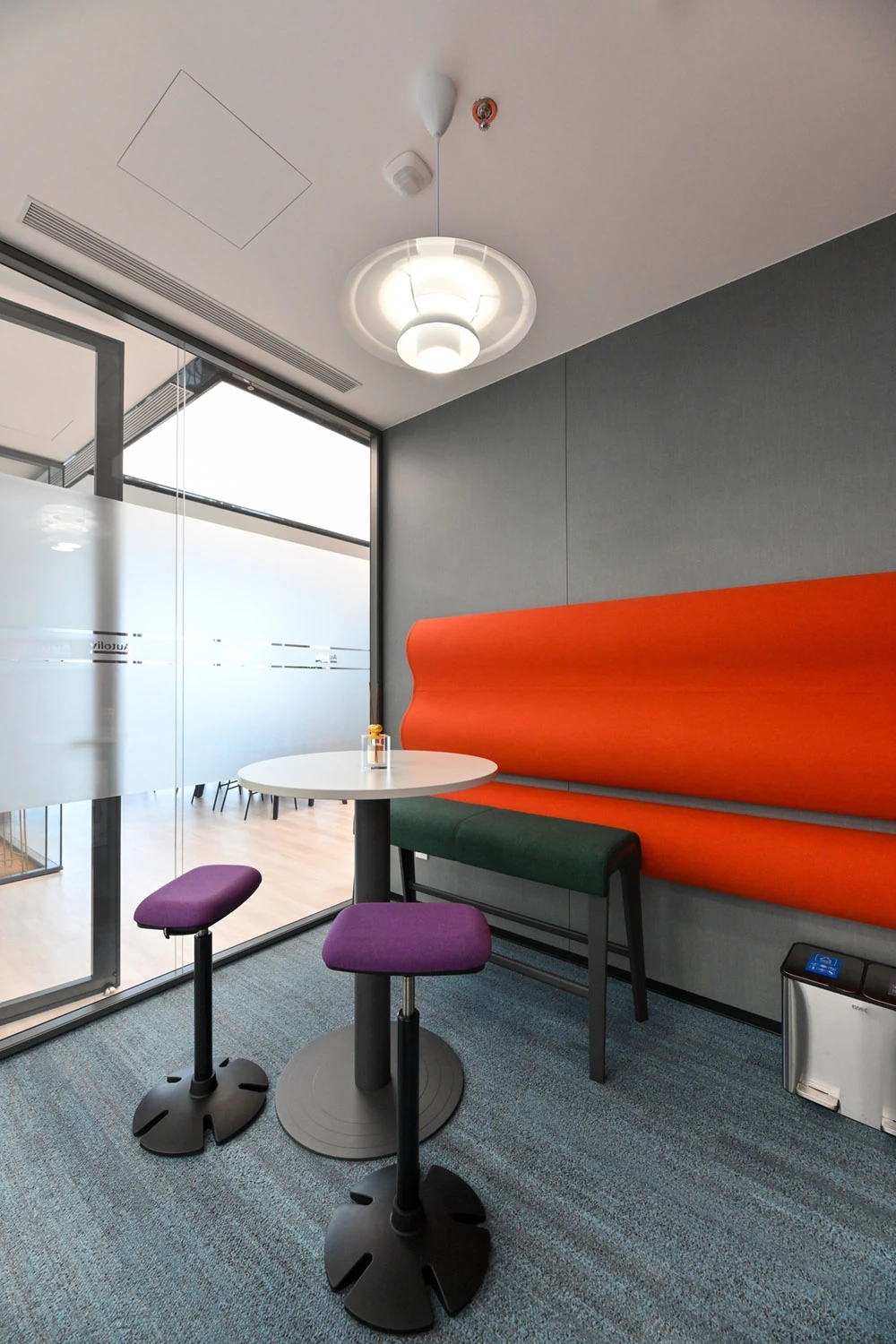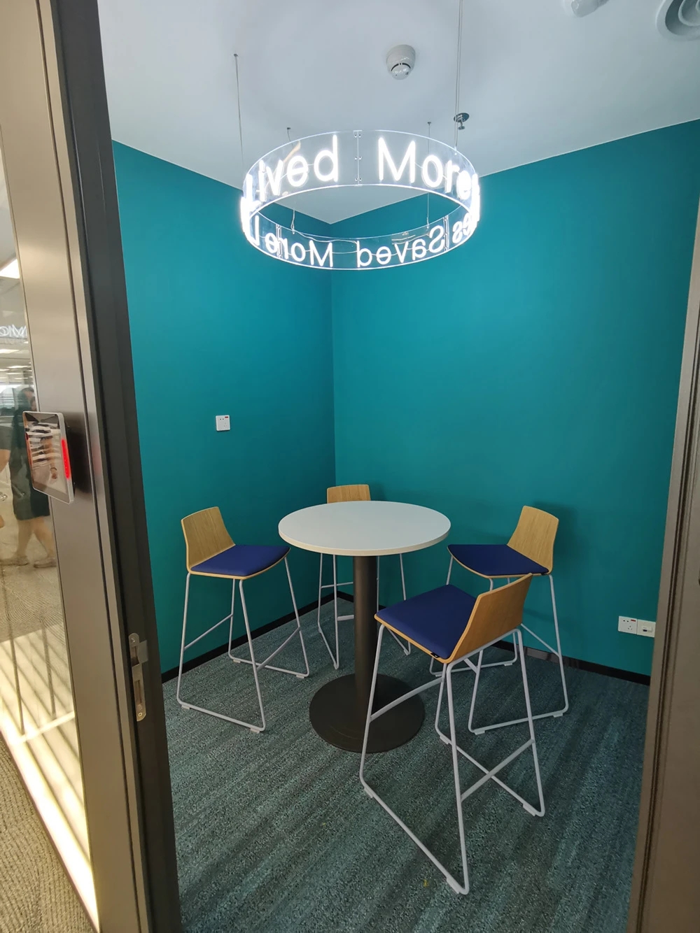 这个项目最好玩的就是各个不同主题的会议室设计。在接待前厅弧型墙的背面,设计师利用其和员工区所剩下的一点不规则区域,规划出了4间小巧,酷炫灰和孔雀绿主题色彩的小型面试间、会议室。另外在大培训区外有一个头脑风暴款的STAND UP会议室。在管理区域,还有一个汽车主题的汇报型会议室,采用了某豪车品牌的后排老板座位做会议室家具。