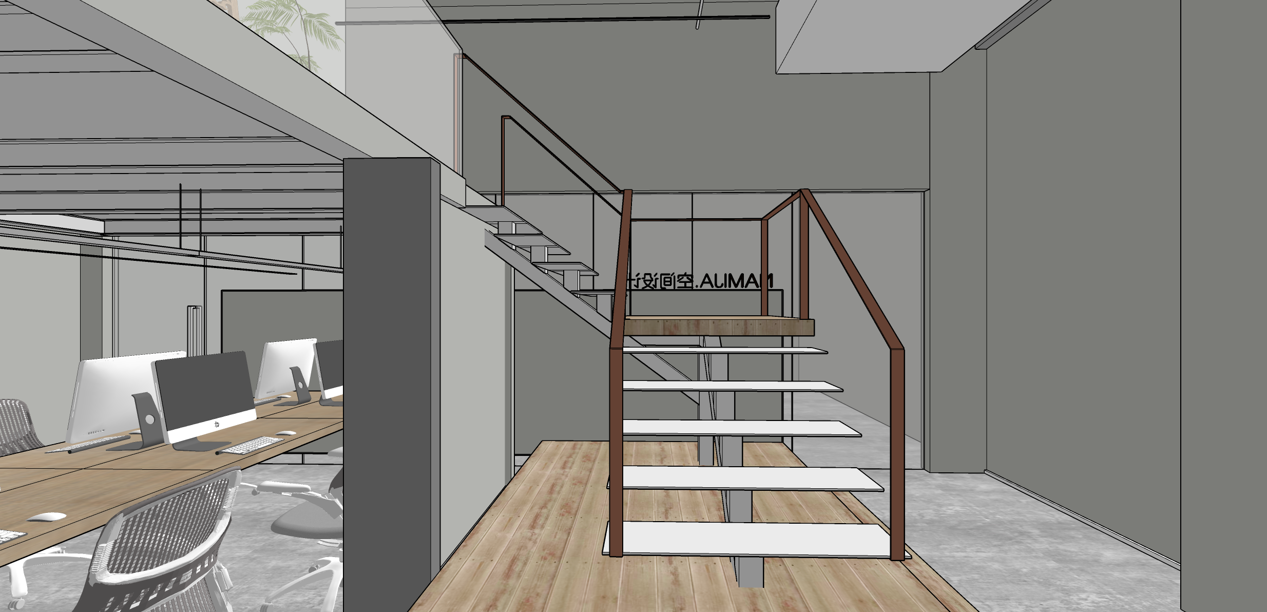 设计师引用几何建筑元素,使空间美学达到极致,在二楼空间做跳色的空间点缀,让进入者在精神层面更容易进入工作氛围。工作室入口右侧是钢结构楼梯,进入二层的会议兼商务接待/休闲功能的区域。多功能的复合布局满足了日常的使用需求,让空间价值实现最大化。木作的家具陈设呈现在艺术漆地面之上,延续现代简约风格,选材和用色皆和空间设计概念表达有着一定的关联。这里兼顾了办公、待客、小型讨论的多样化用途,此外还置入相应的配套支撑,强化舒适度与便利性。