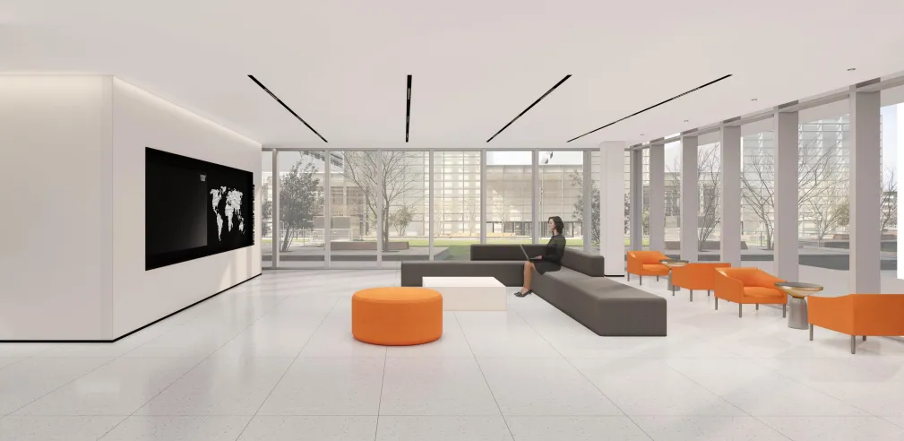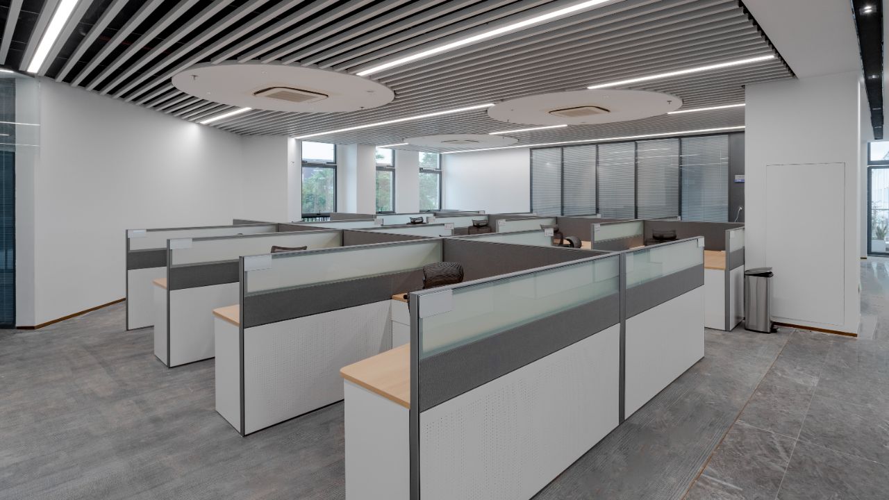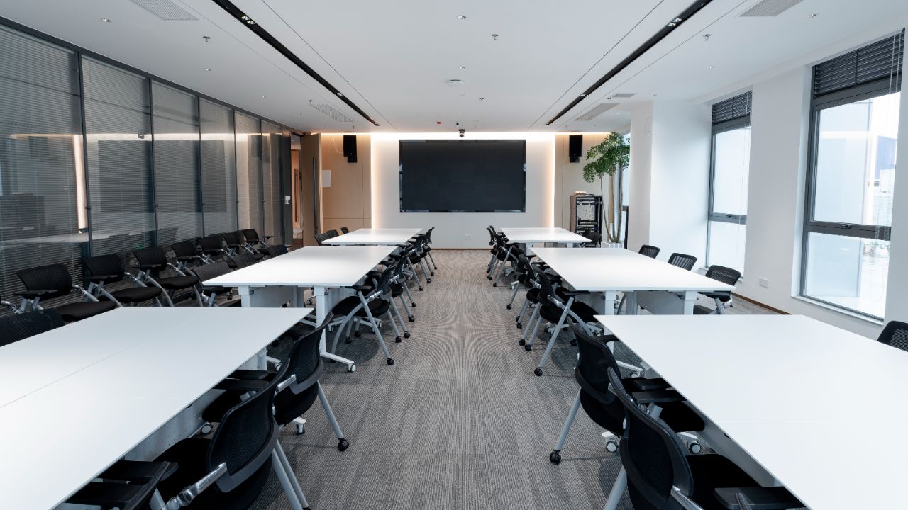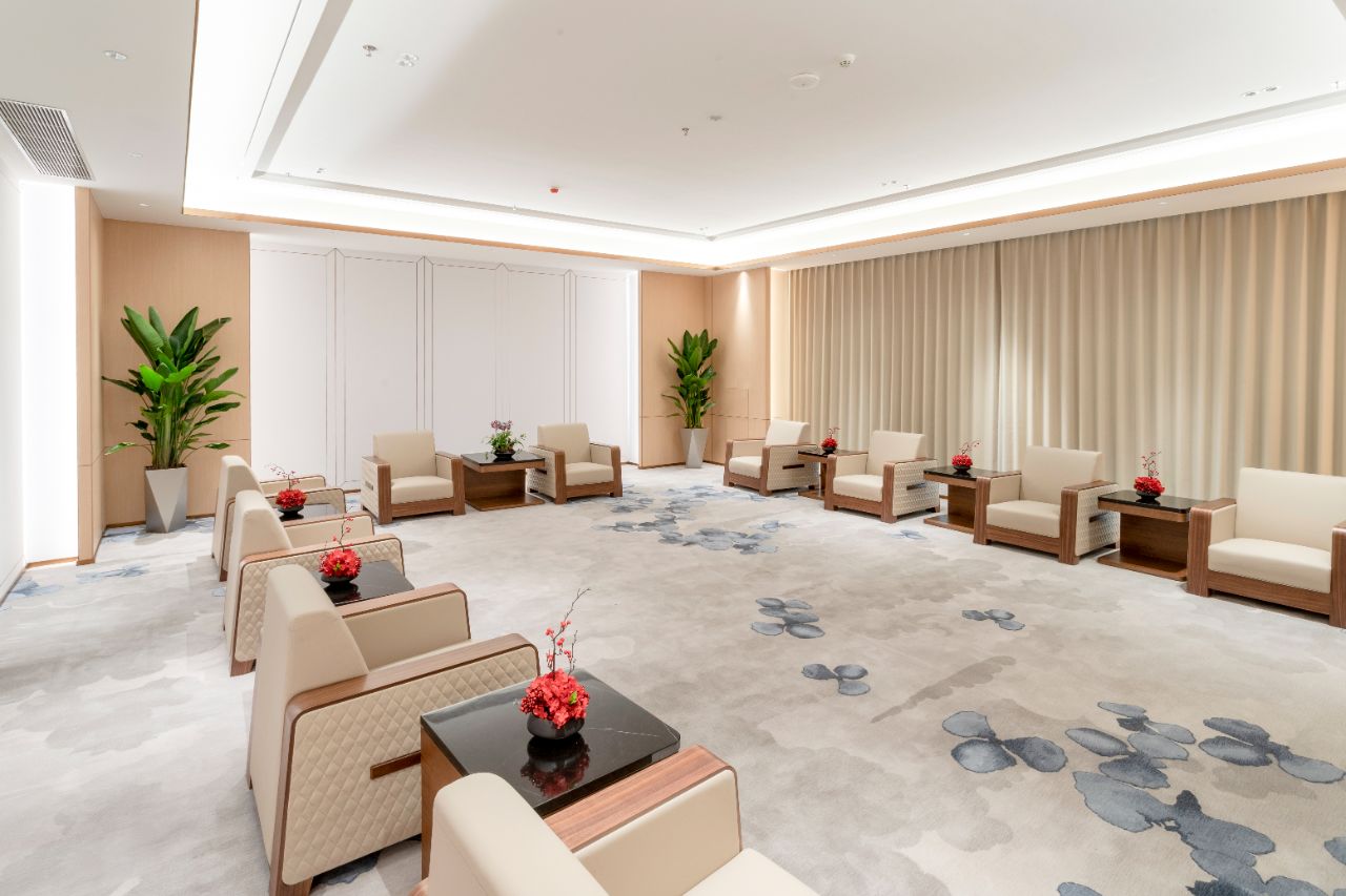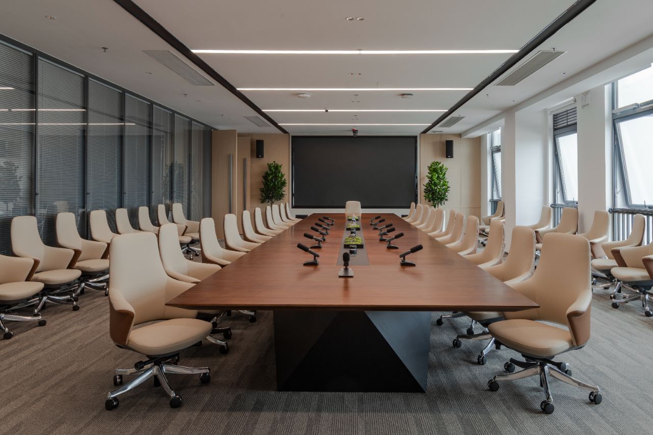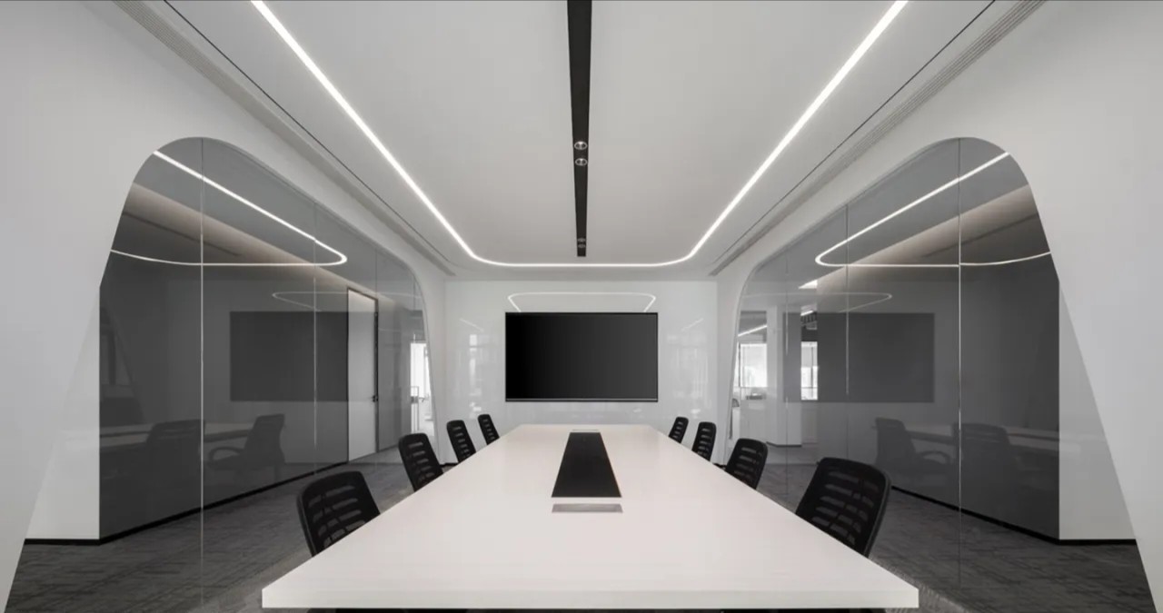 3F大会议室采用弧形玻璃隔断创新设计打破封闭,营造通透宽敞氛围其独特弧形元素增添视觉层次与动态美感尽显现代办公新风尚