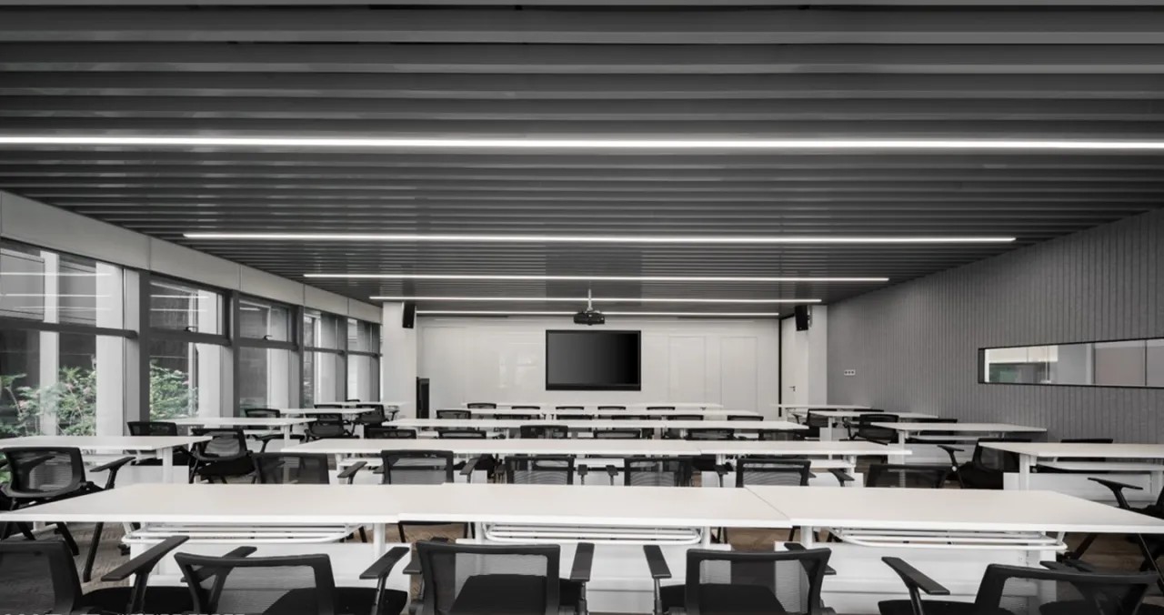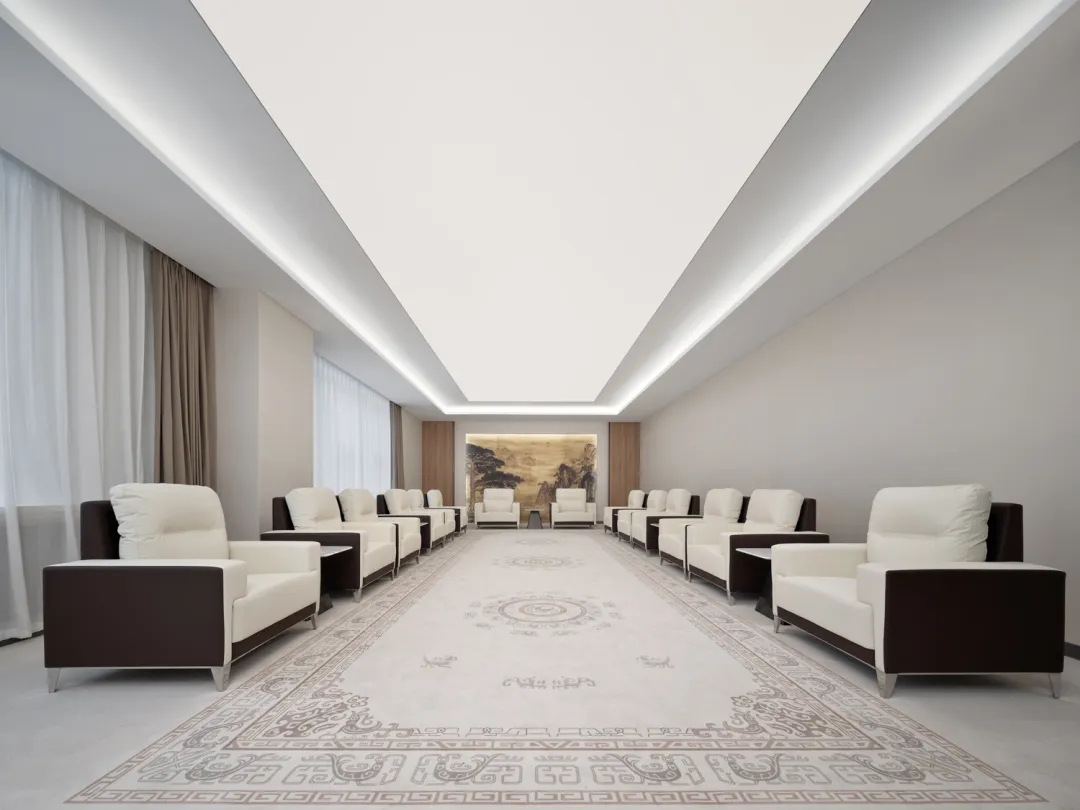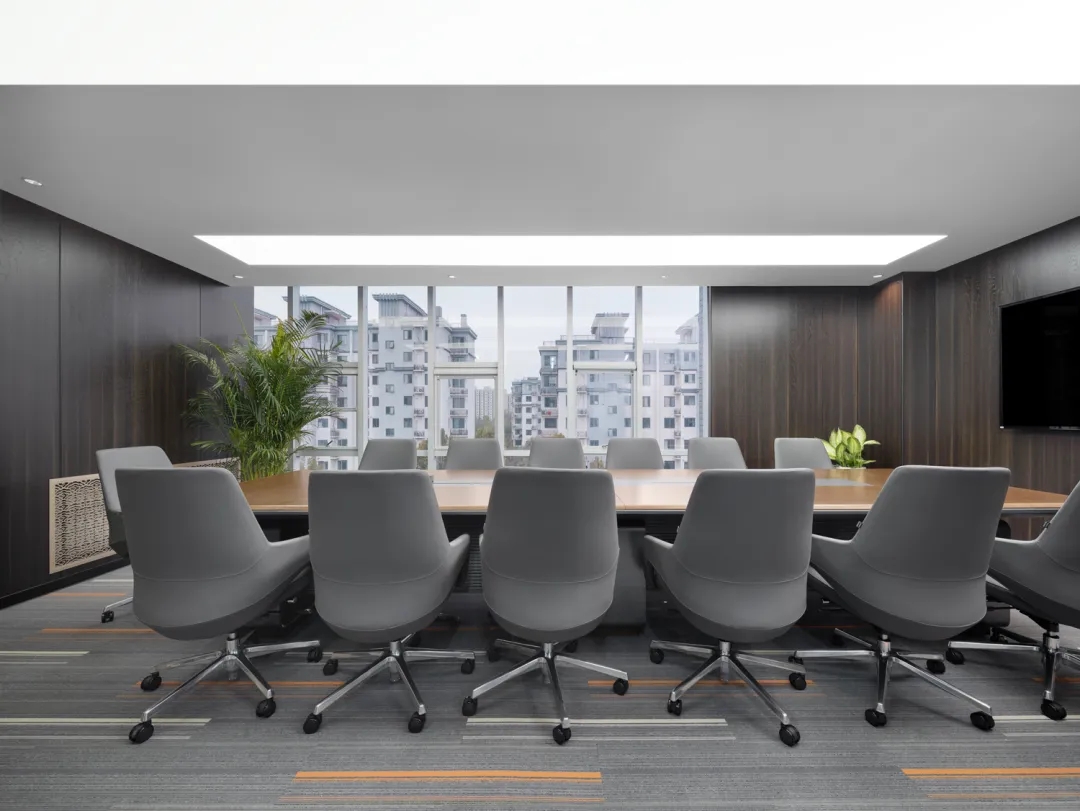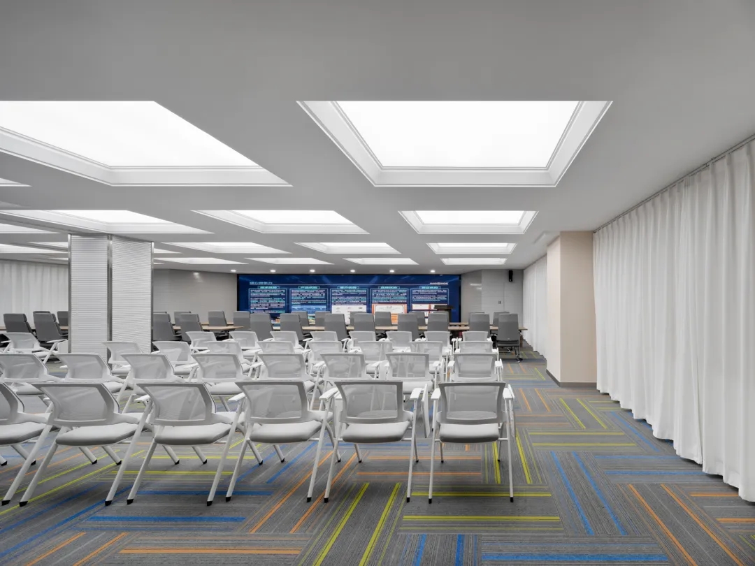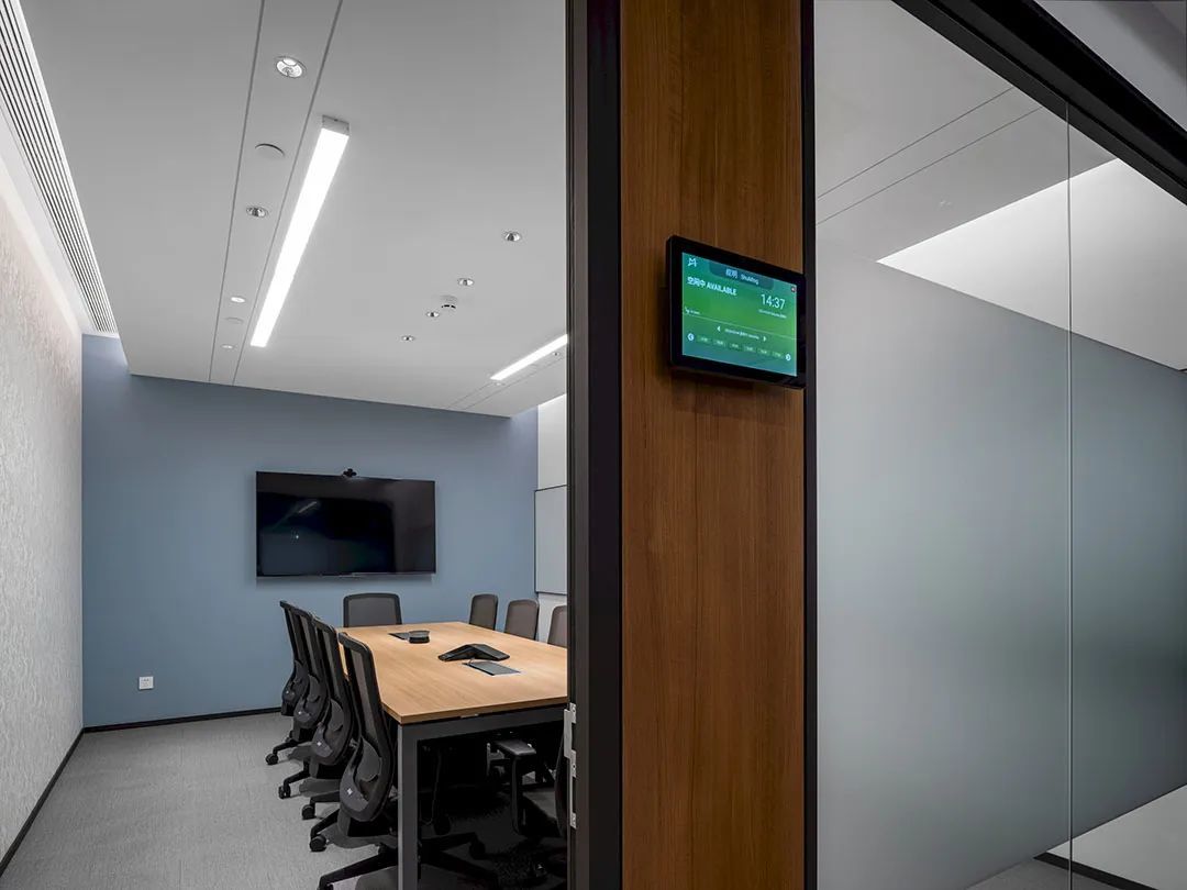 培训室墙面则采用吸音材料毛毡以极佳的降噪效果将办公空间的舒适体验达到平衡与统一侧面视窗打破常规布局更显环境通透