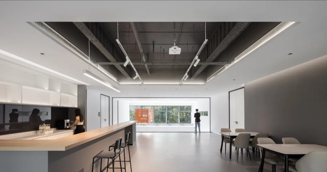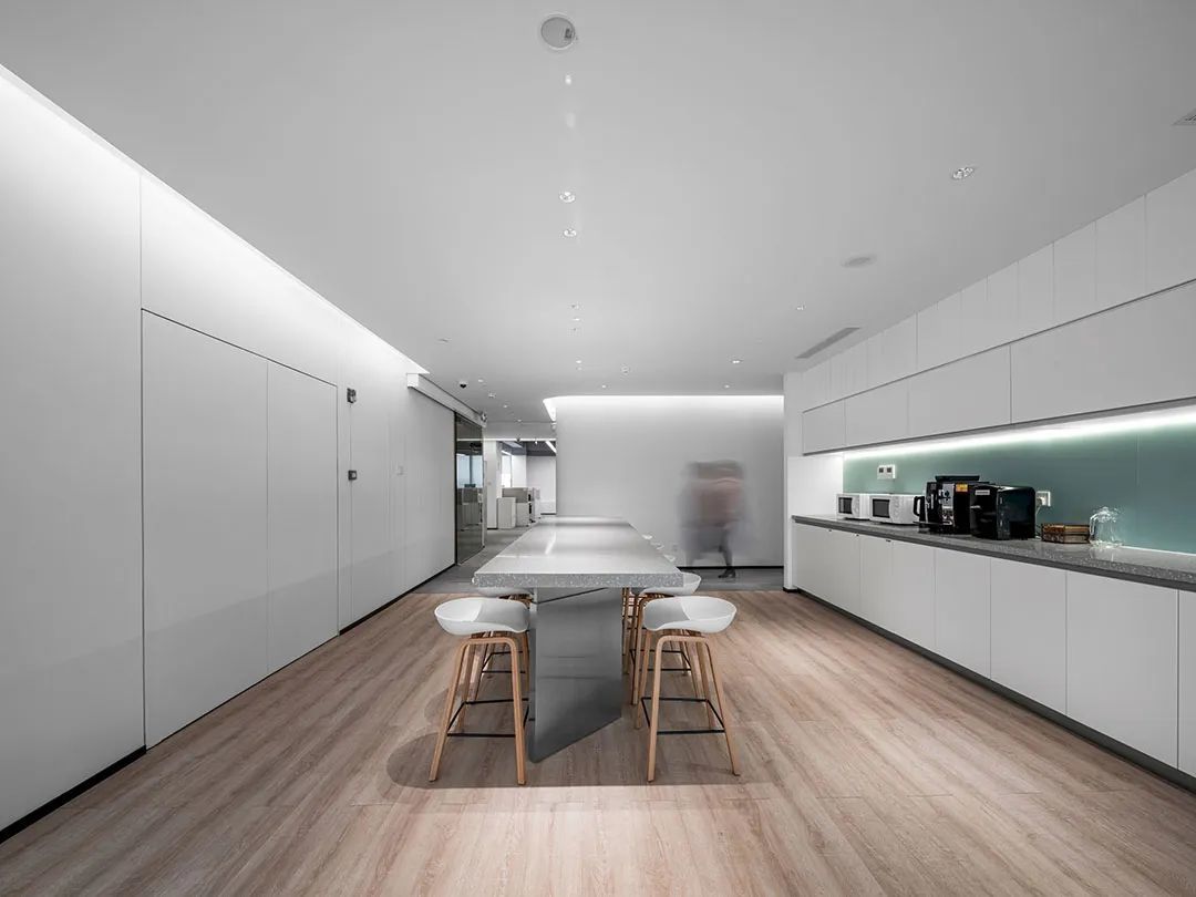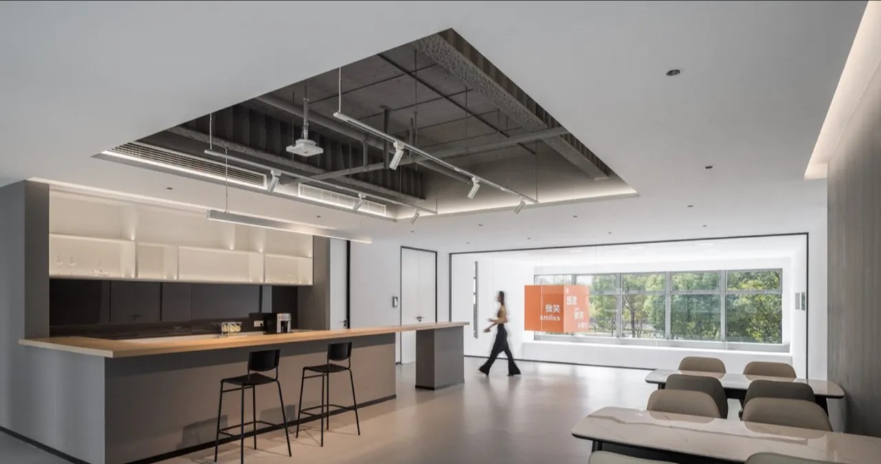 2F灰白配色更显空间通透中岛吧台设计搭配活动家具使得空间更灵活多样茶歇烘焙皆宜,高效灵活转换侧面大视窗自然引入吊装企业标语装置展现企业愿景
