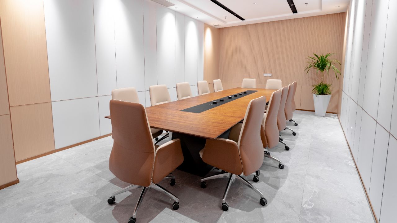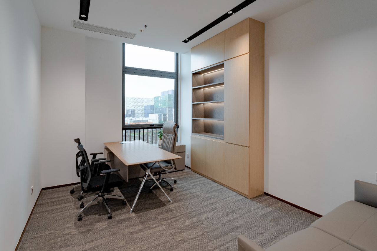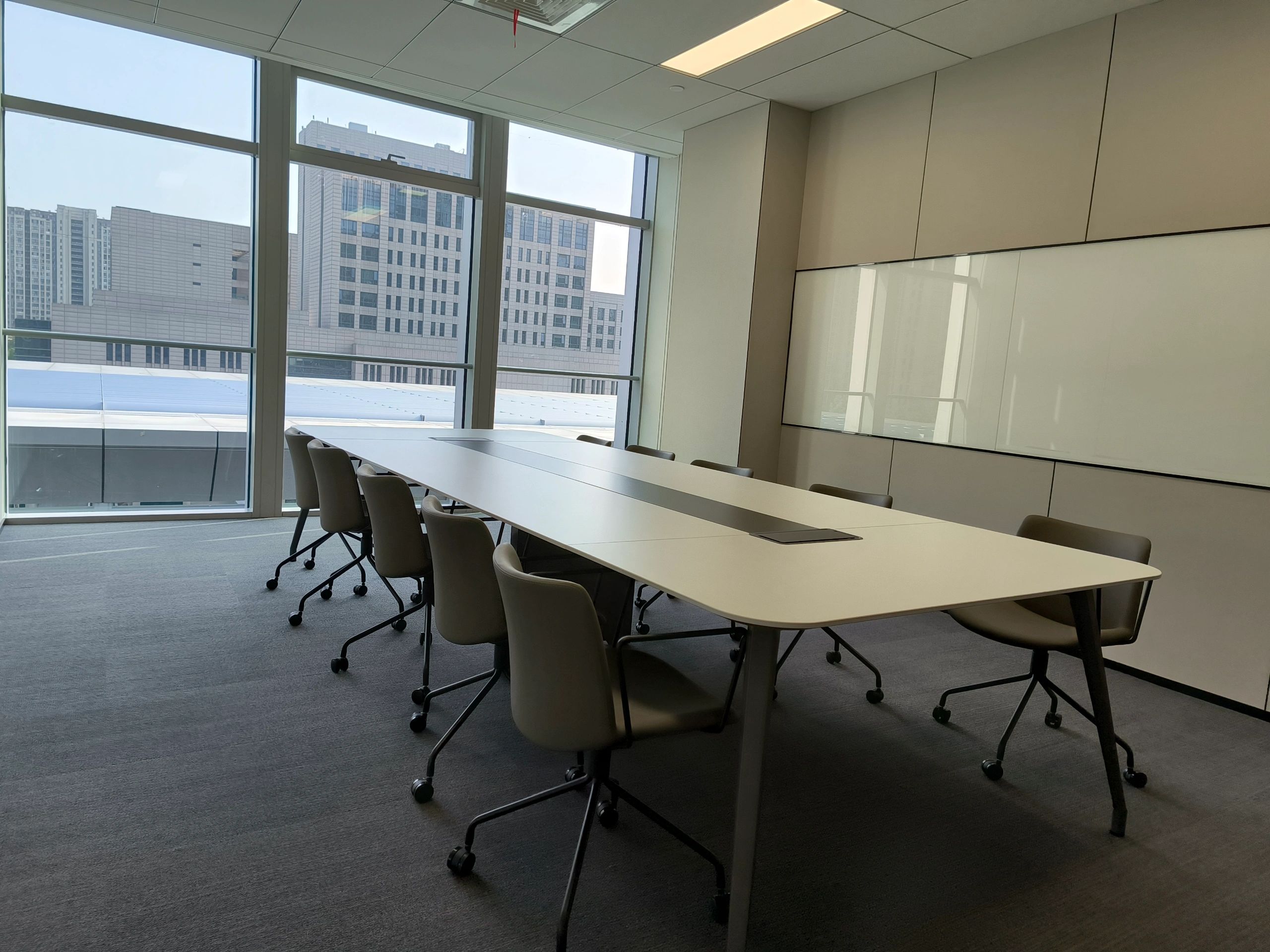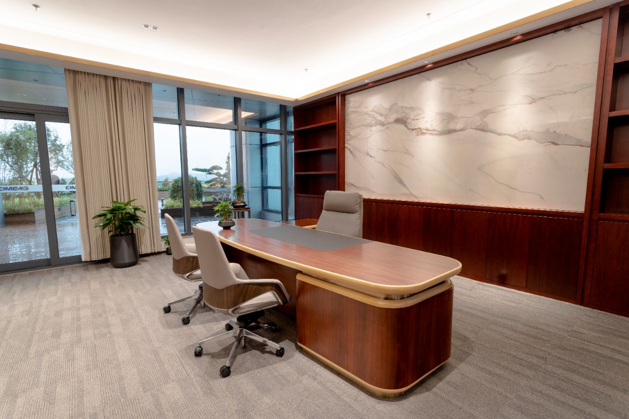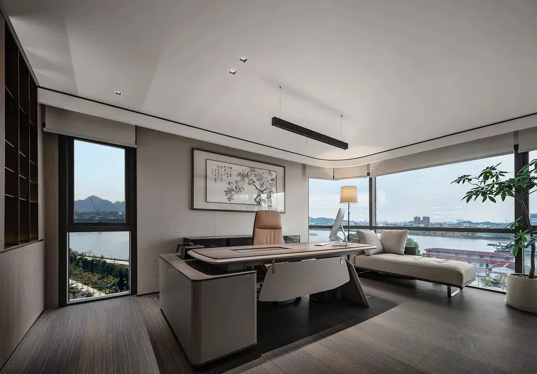 会议室内部采用了高品质的会议桌和舒适的会议椅,配备了智能化的会议设备,如投影仪、智能音响等。 总经理室作为公司决策的核心区域,其设计装修自然体现了尊贵与权威的象征。室内装饰以简约大气为主,运用高级材料和精致工艺,营造出一种低调的奢华感。
