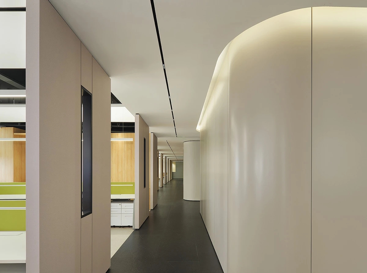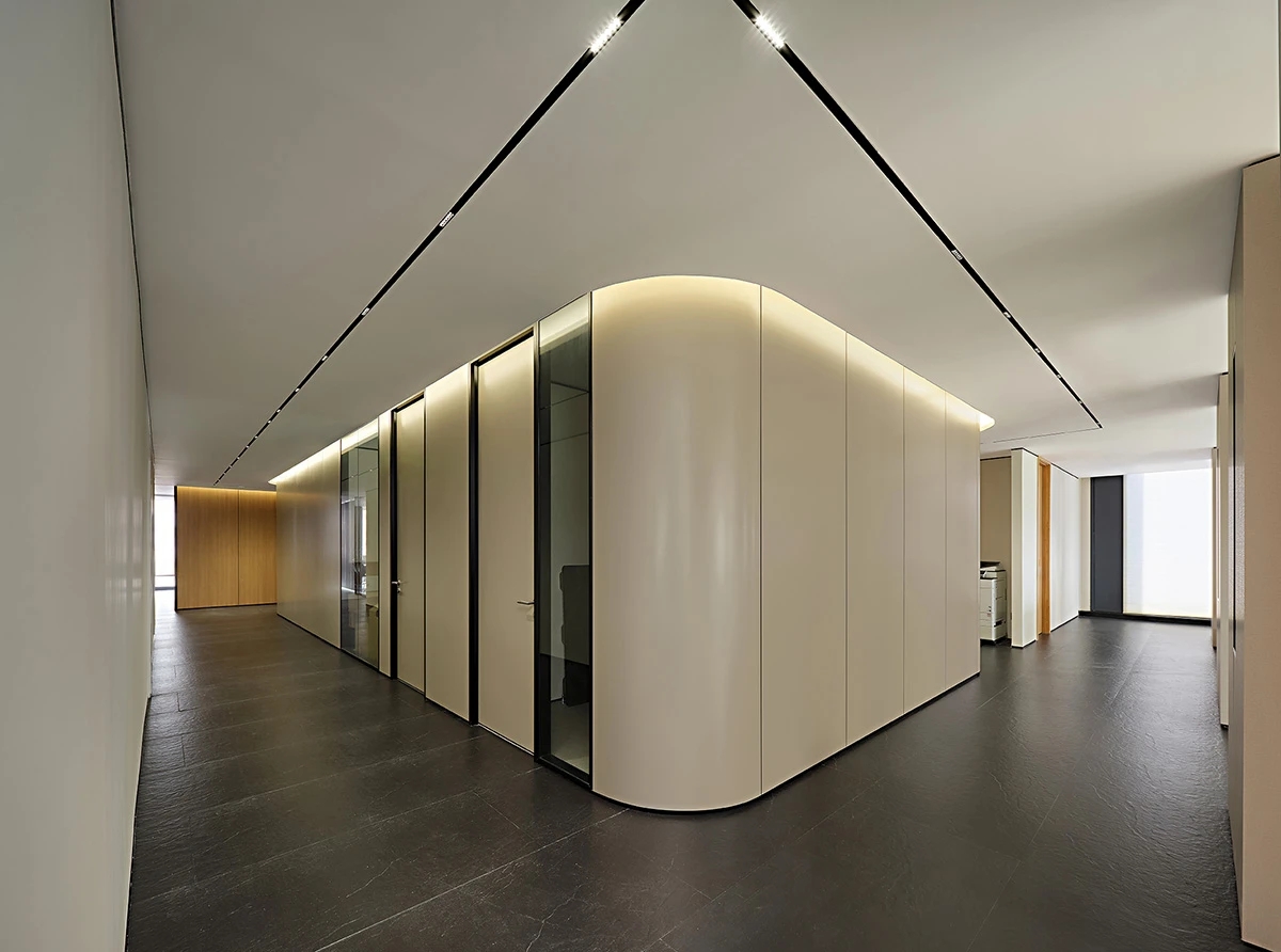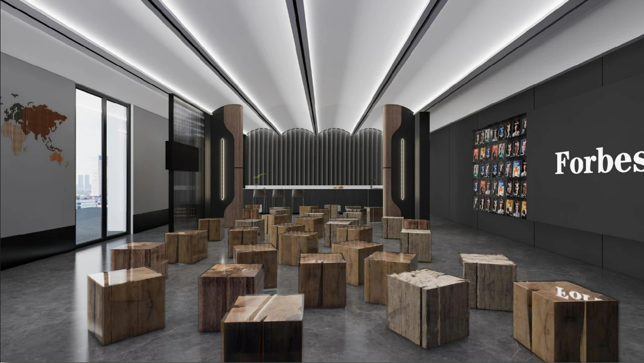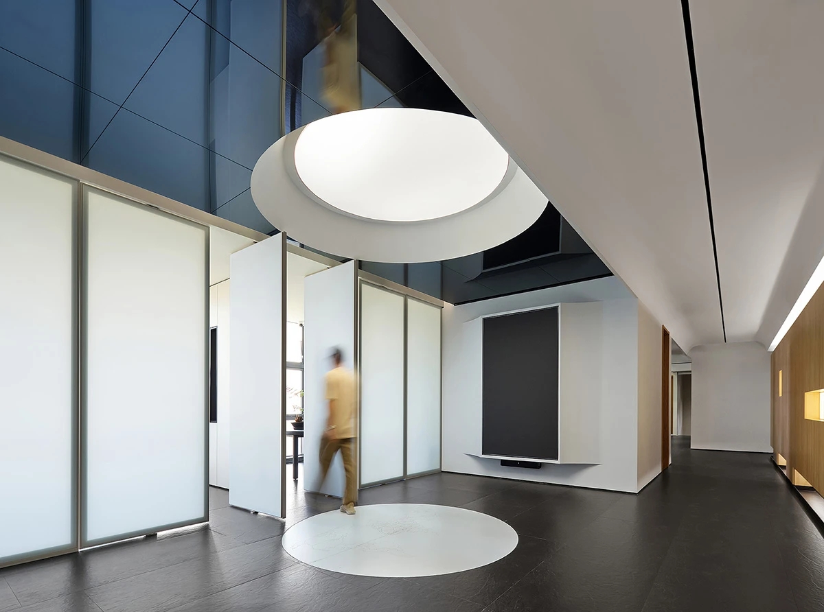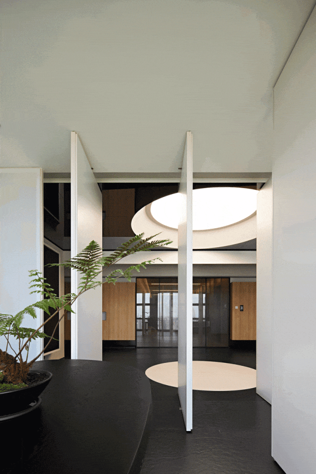 对办公空间进行重新定义,潜心探索设计的无限可能性,用前卫的想法将过去传统的办公需求与未来现代相结合,不断碰撞后产生新的极富生命力的办公空间。在此空间中,对空间进行重构,打破传统大堂使用的局限性,将大堂,前台以及洽谈区结合,开放式空间的设计最大化的利用了空间,兼具功能与美观性,开阔明亮,塑造一种灵动之感。旋转隔断的应用,打破了固有空间的局限性,动静结合,曲线与直线,方形与圆形的交响呼应,营造空间氛围的同时,给空间创造了更多的延展和可能性。通过对材料语言和空间形态的精简,打造一个”简洁,透明化,动静结合”的复合型空间!