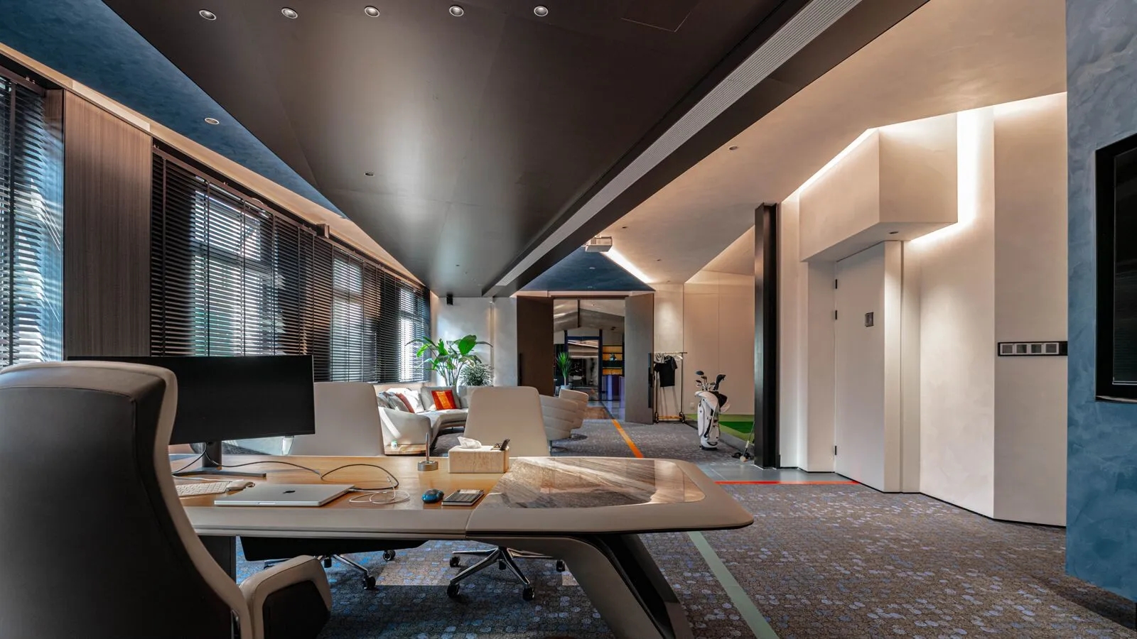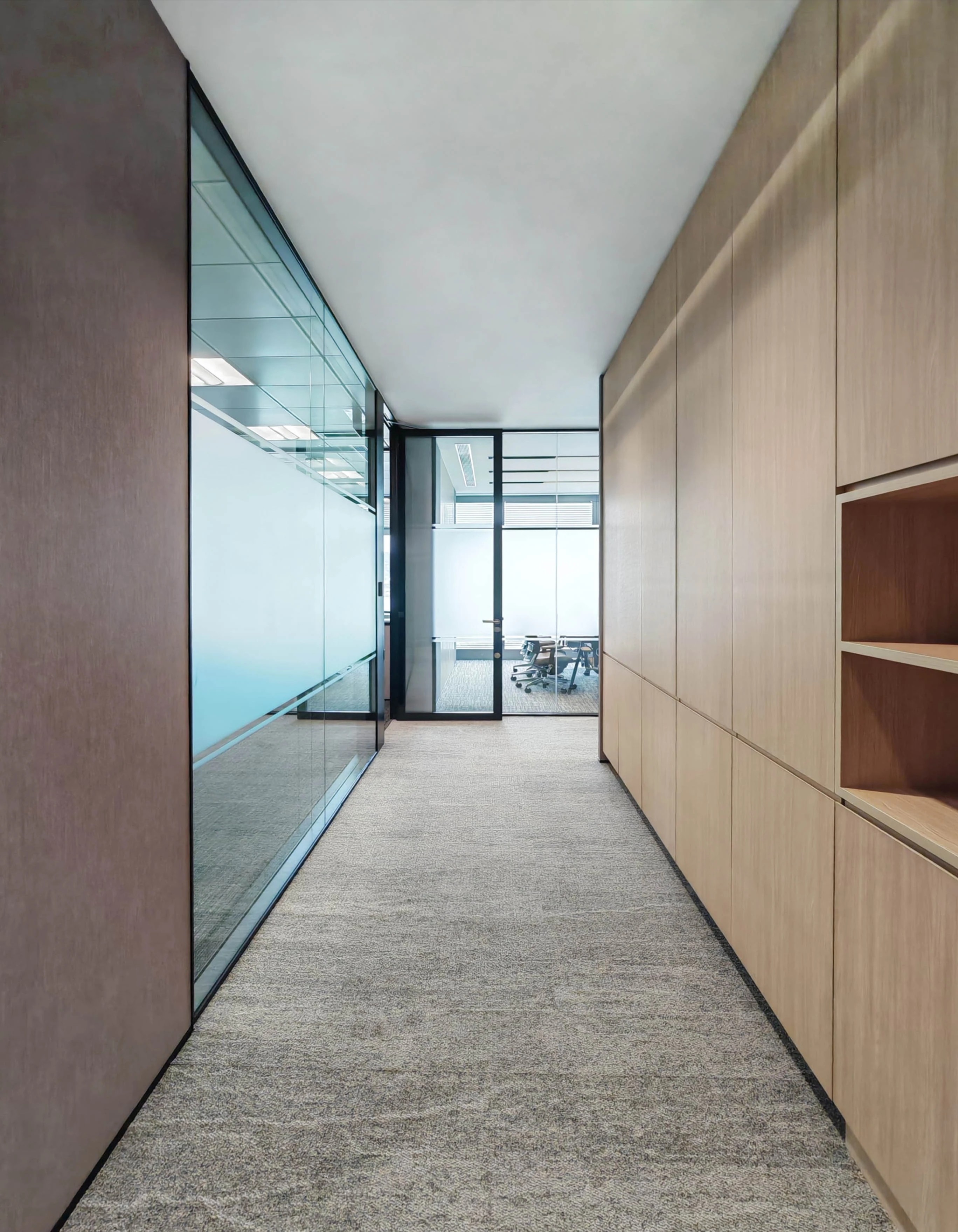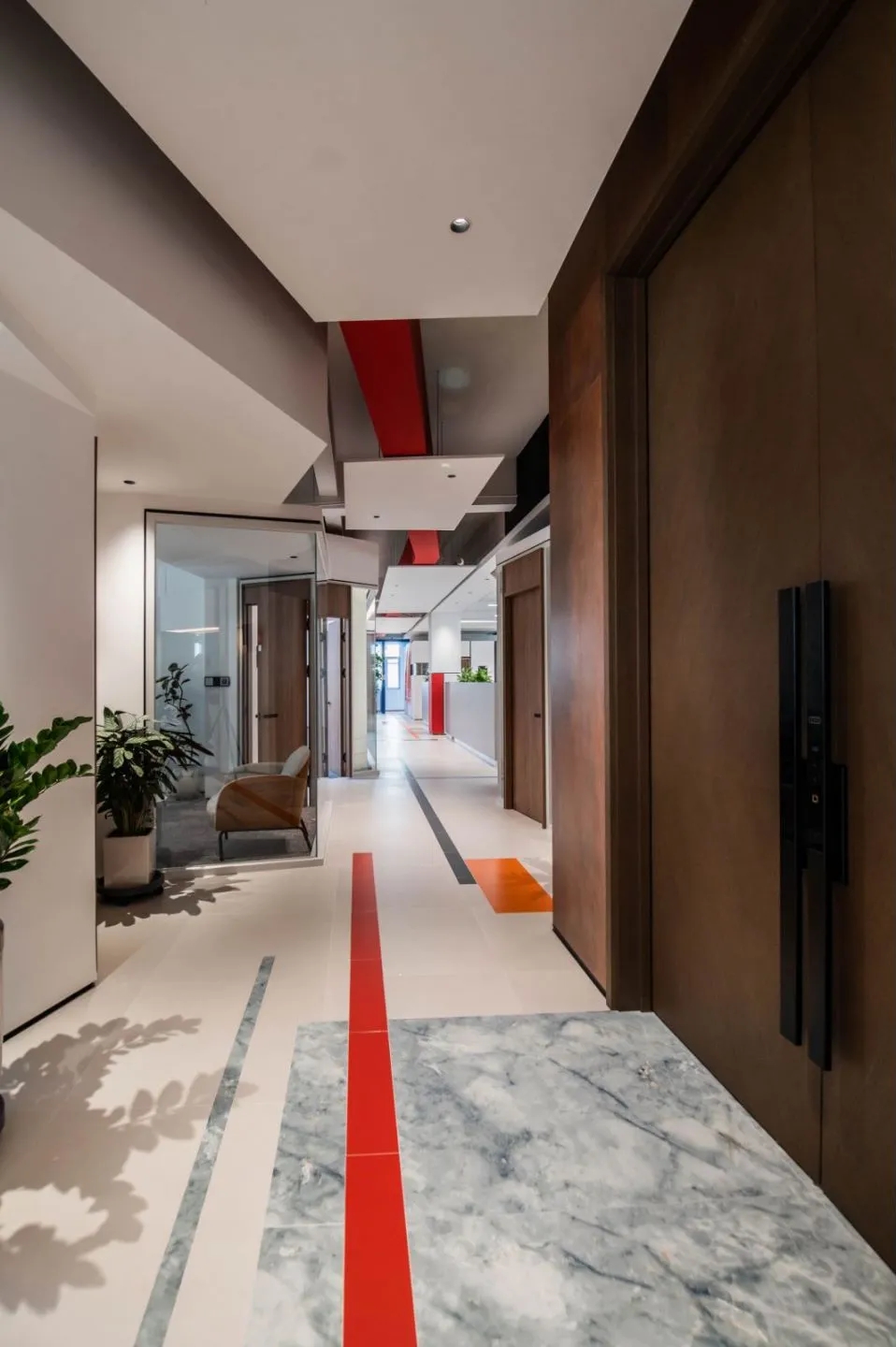 本项目以国际化、年轻化的设计理念,其简洁、清晰的线条和纯粹、高效的动能,带来了一种全新的工作体验,感受现代都市的时尚气息。设计上以白色为基调,营造出简洁、明亮的氛围,白色墙面和浅色地板不仅提升了空间的亮度,还增强了视觉上的宽敞感。走廊、公共区采用蓝色和红色的结合,颜色的碰撞使空间效果更为立体,在视觉上的冲击力能够有效减轻压力,促进创造性思维,鼓励每个人发挥创造力。有效扩展视觉空间,减少心理负担。色彩跳跃是次办公空间的一大亮点,在保持整体色调简洁明快的基础上,同局部色彩的鲜明对比和跳跃,为空间注入了活力和动感。利用颜色和功能性的布局,创造出一个既美观又实用的工作环境,这种设计不仅符合现代职场的需求,更为员工打造一个更加宜人的工作空间。让灵感与思维随时产生碰撞。动线设计采用开放性、指引性的原则,尽量避免封闭空间、采用开放式布局,通过标识、灯光等引导员工移动。在方圆之间取得平衡自然律动,为人与空间建立联系,利用此动线巧妙地将人引入空间内部。合理的动线设计和科学的色彩搭配不仅能提高办公空间的流动性,还能提升员工的工作效率和满意度,促进不同部门之间的交流与互动。