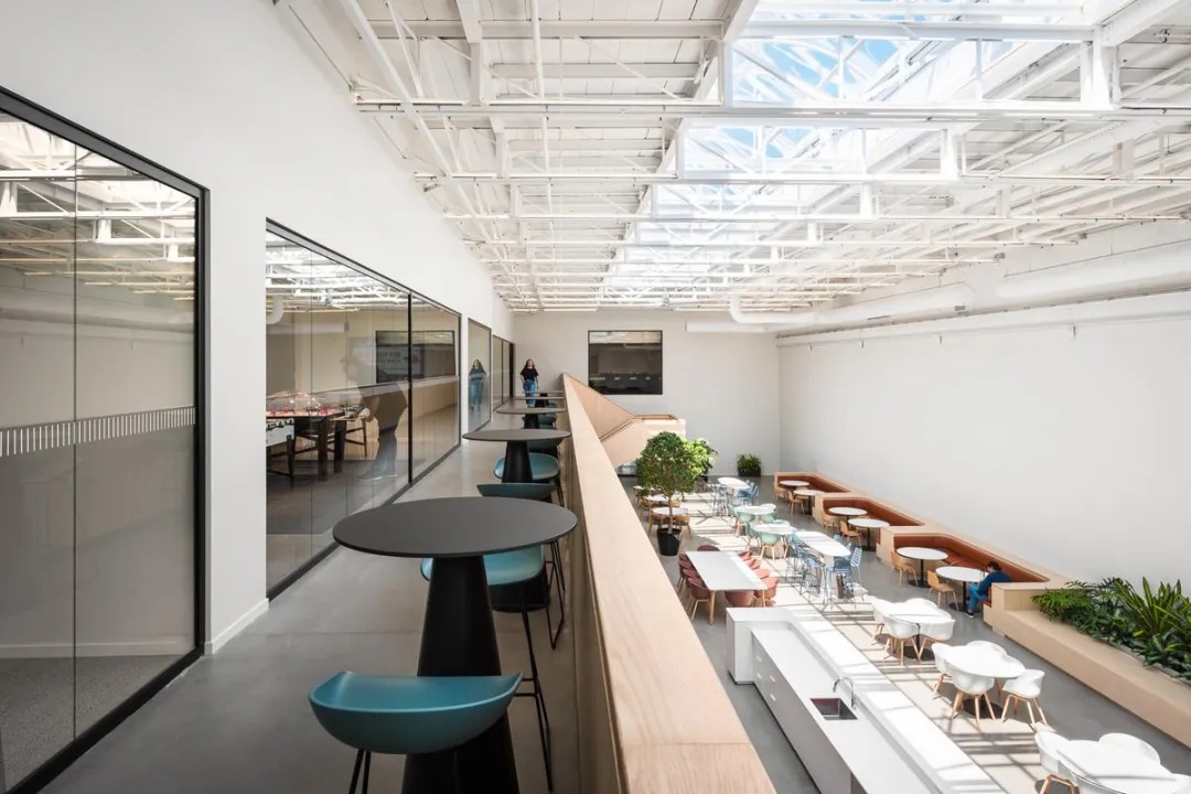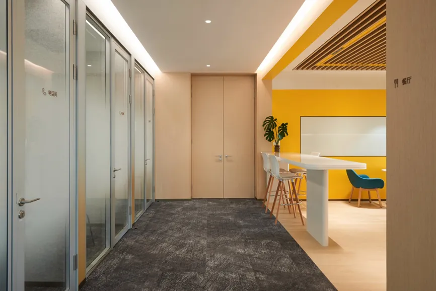 进入更私密的区域,餐厅是空间的另一个亮点。主色调为明亮的黄色,它不仅充满活力,更是在员工繁忙工作间隙中放松心情的理想空间。每一个区域都有其独特的功能与风格,这是我们在设计中尤其强调的,一个灵活多变、适应不同需求的空间设计理念。
