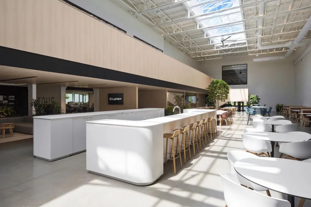 餐厅设计明亮而温馨,黄色墙面与木质吊顶的搭配增添了活力和自然感。中间的白色吧台简洁,配合两把高脚椅,为员工提供了一个轻松的休憩场所。大长桌和围绕的木椅适合多人同时用餐或进行小组交流,体现了功能性与美感的结合。餐厅内还配备了完善的厨房设备,包括冰箱、微波炉和水槽,满足了员工日常需求,整体氛围友好舒适,有助于团队互动和放松。
