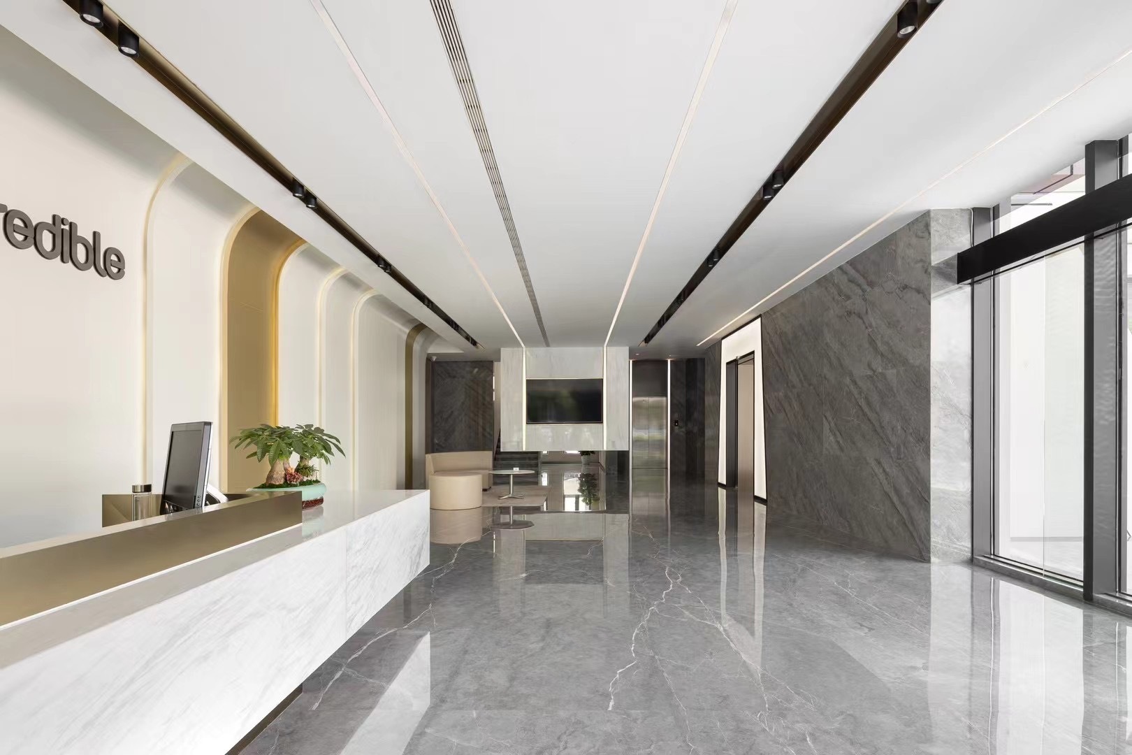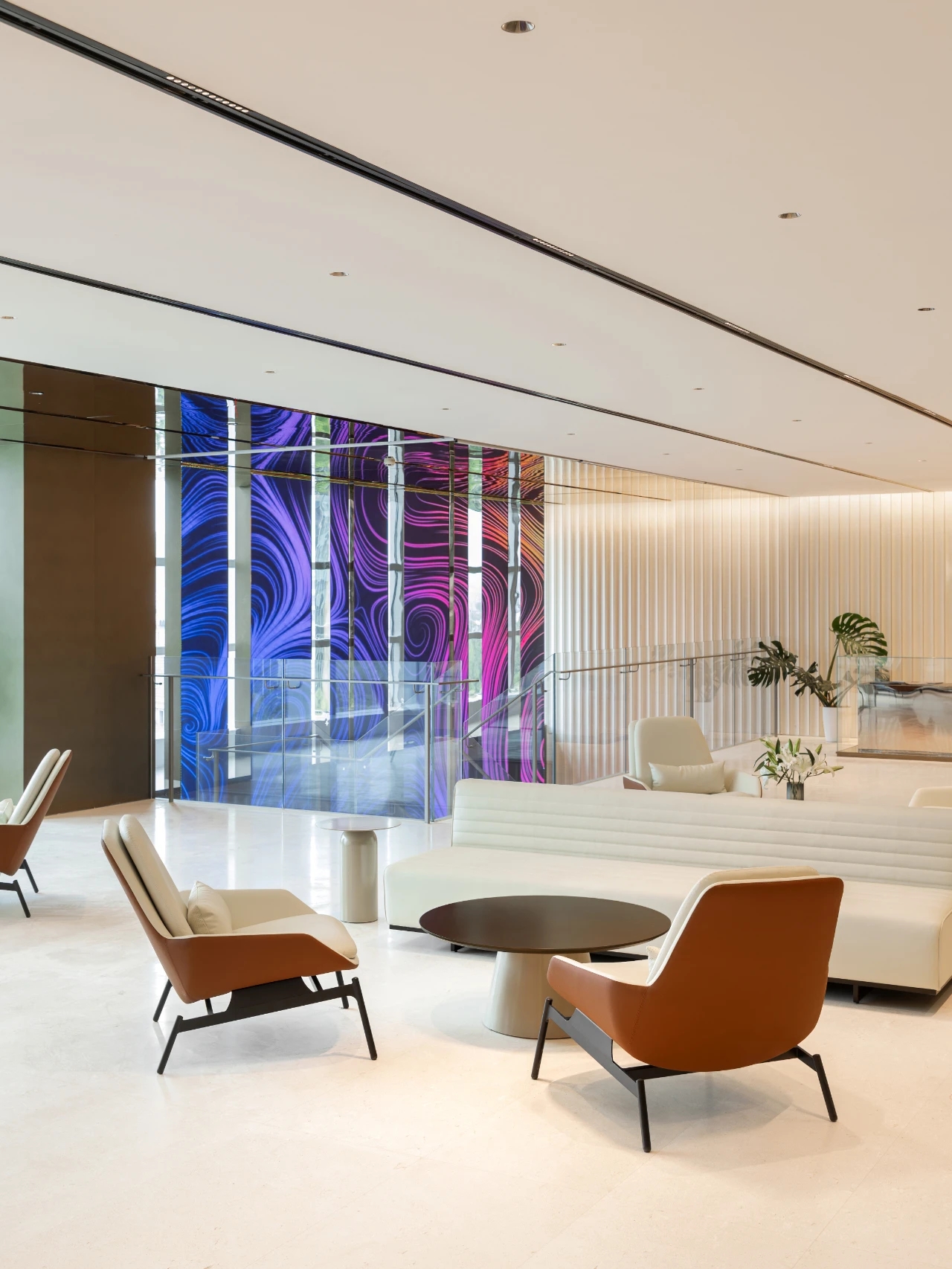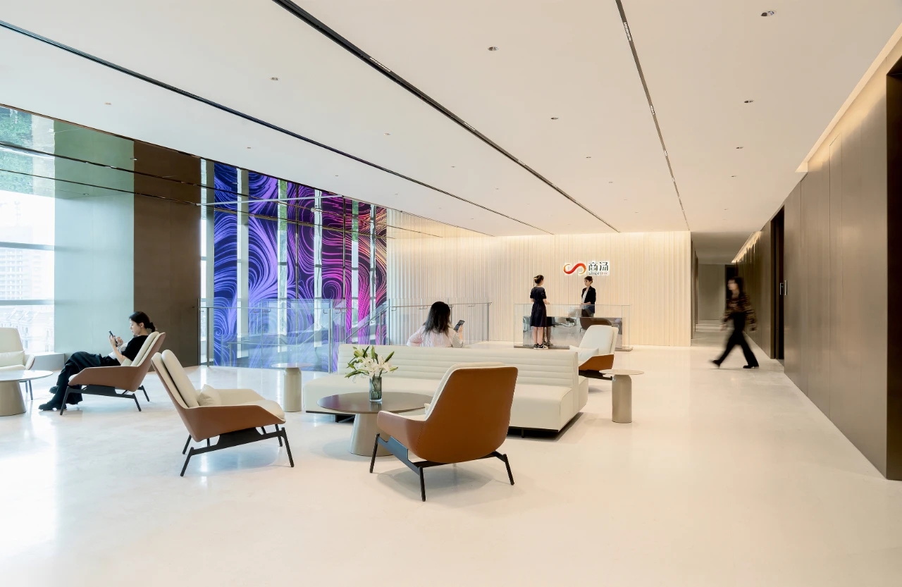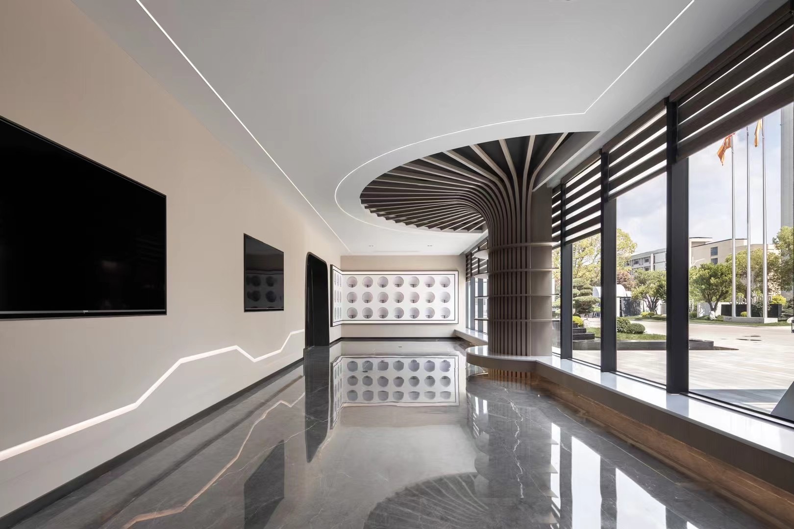 到达接待中心,映入眼帘的是温润的米色波浪石材。空间底色优雅怡人,大面仿色的金属材质勾勒出企业的风骨。结合灯光及软装设计,呈现出优雅精致、充满人文主义气息的企业形象。