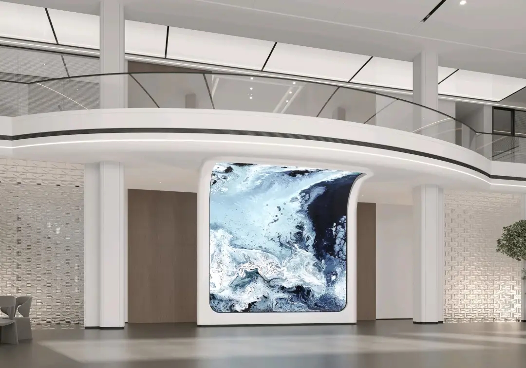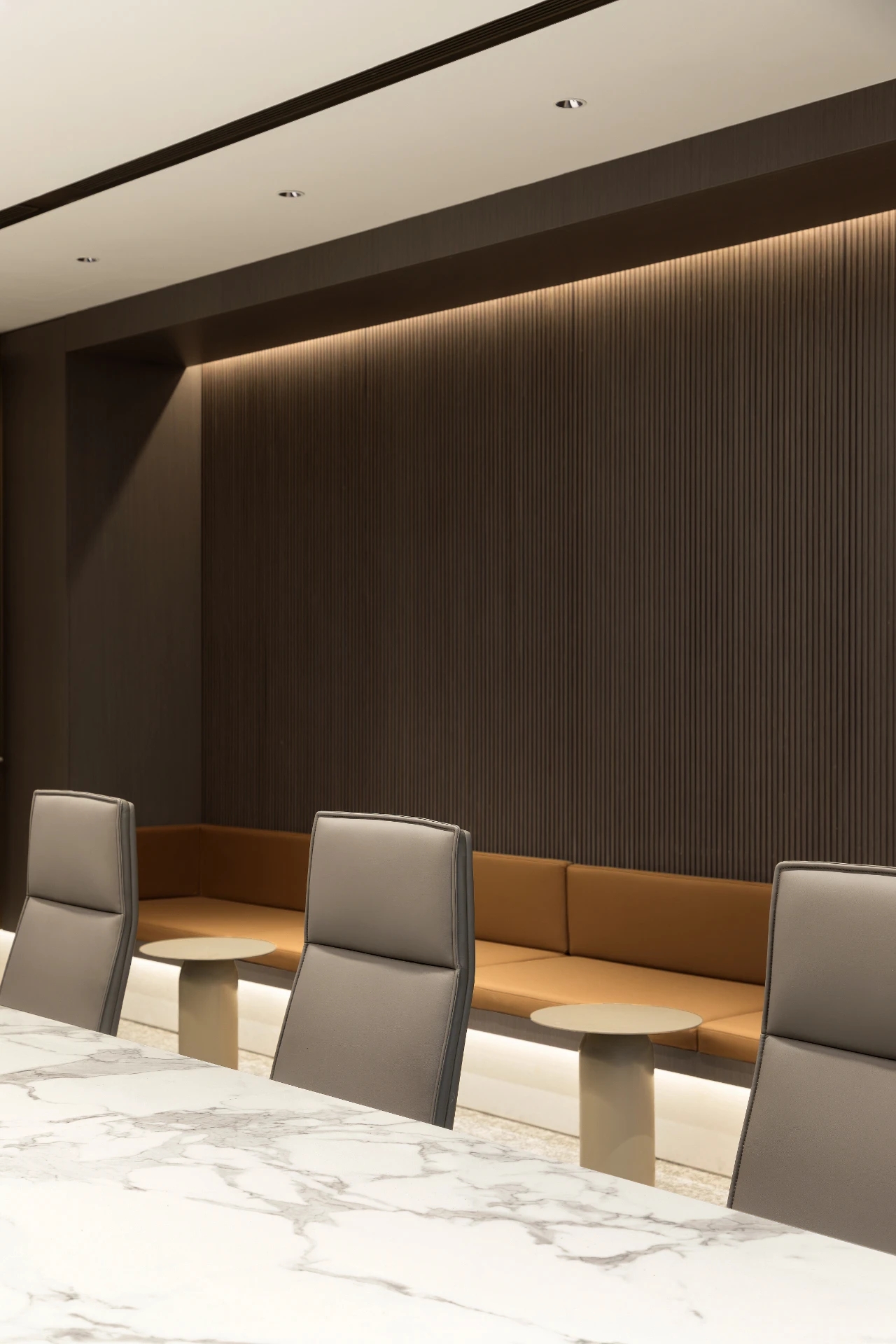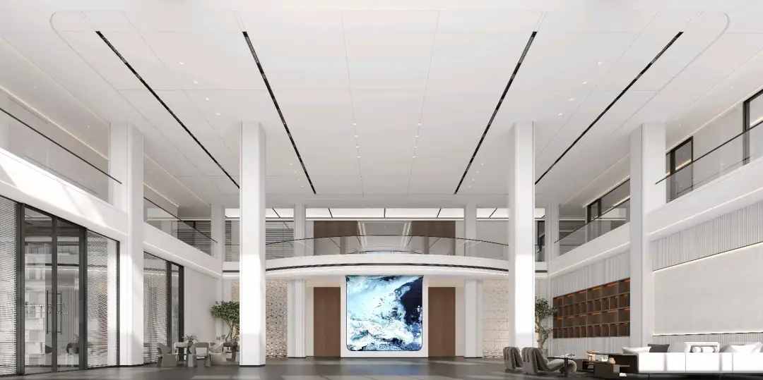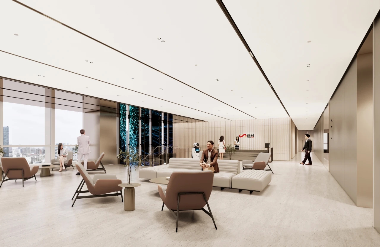 到达接待中心,映入眼帘的是温润的米色波浪石材。空间底色优雅怡人,大面仿色的金属材质勾勒出企业的风骨。结合灯光及软装设计,呈现出优雅精致、充满人文主义气息的企业形象。