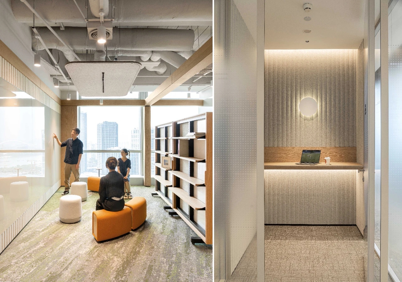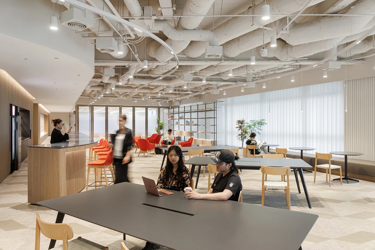 围绕水吧台,FTA设计通过灵活可变的玻璃隔断,将协作、培训、沙龙、市集等多场景“联动”,创造全新“共振”的工作生活体验:高弹性的空间策略,提供灵活的工作和社交环境,满足不同类型的活动需求;更多场景可能性,增强员工的归属感和创造力,激发企业活力。