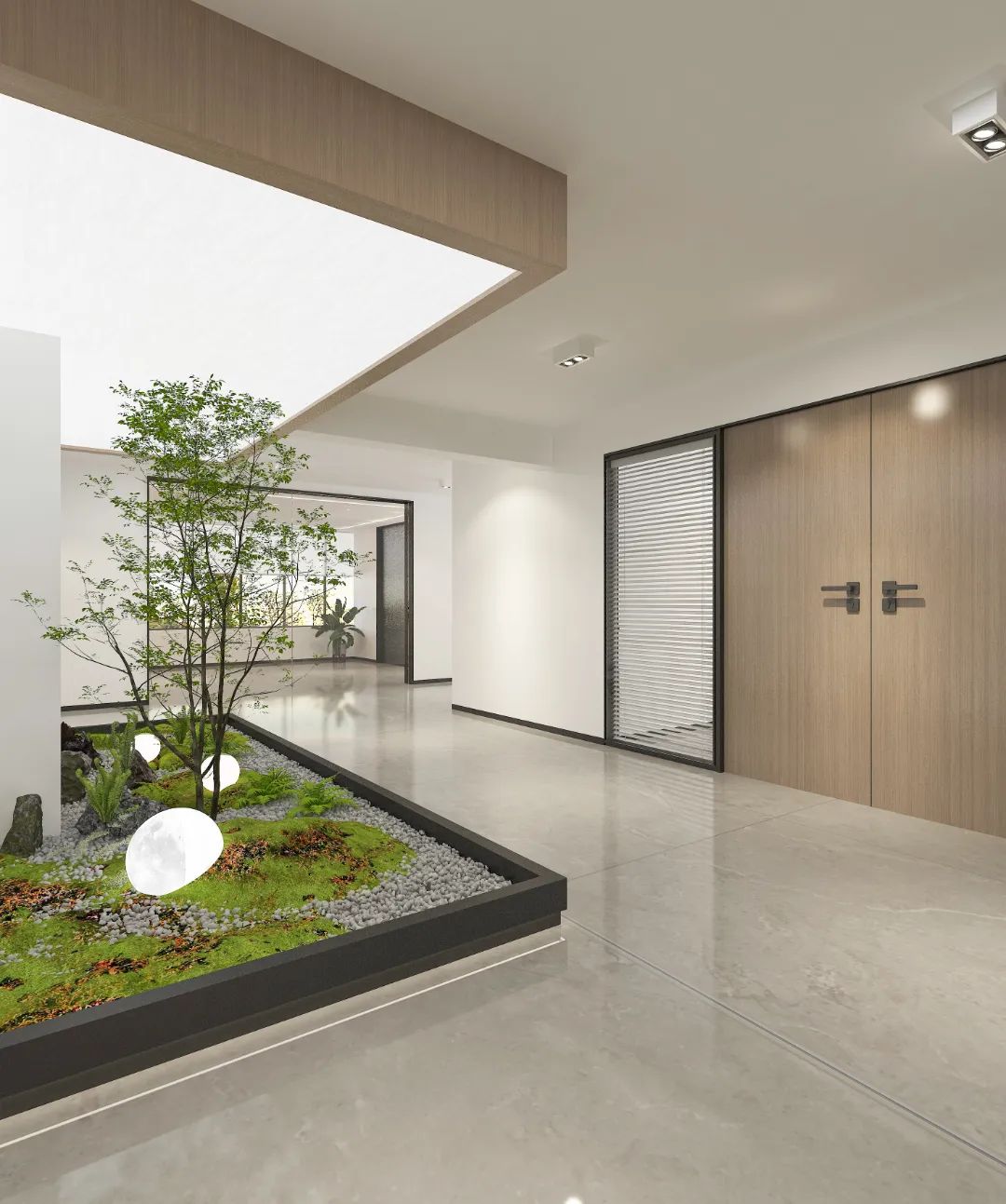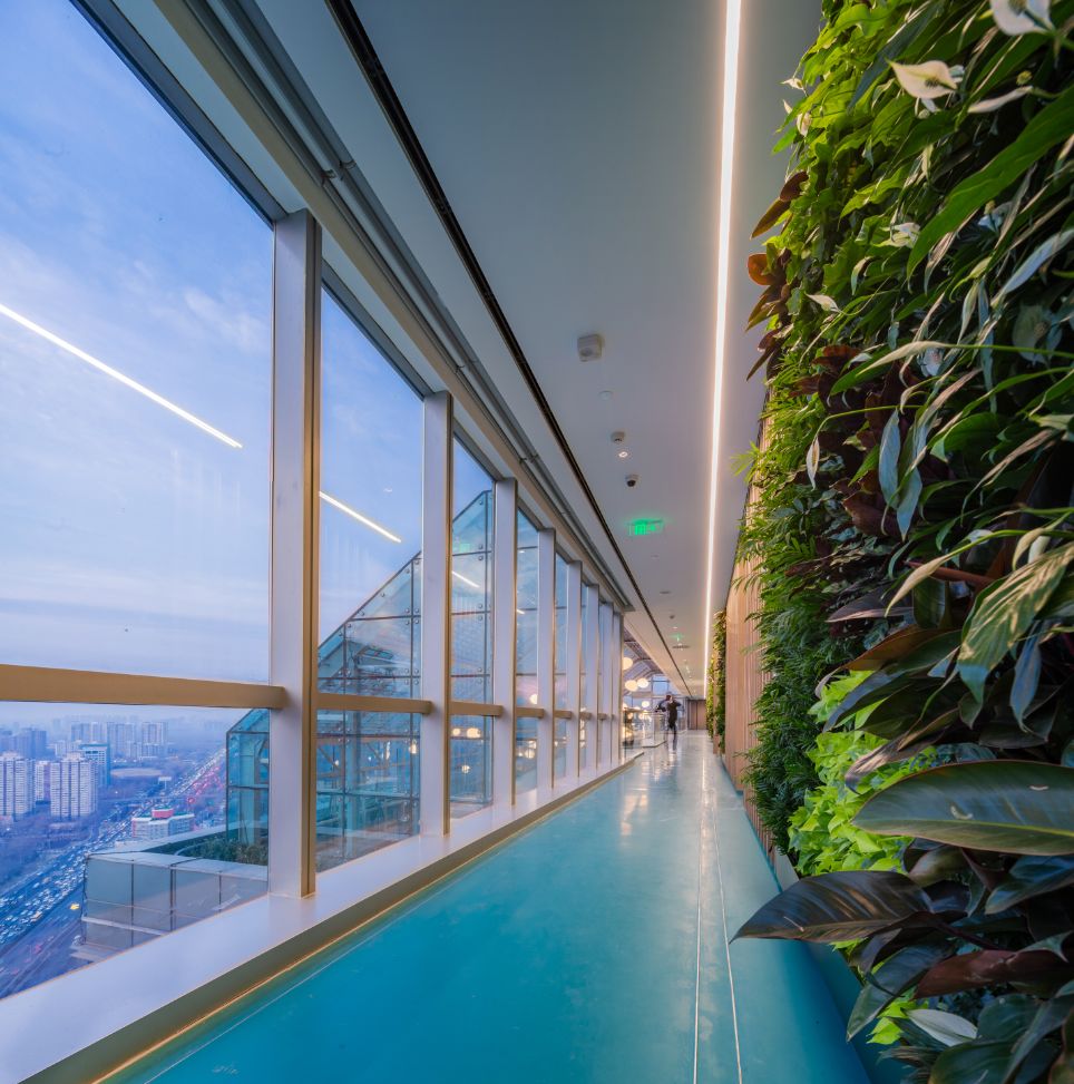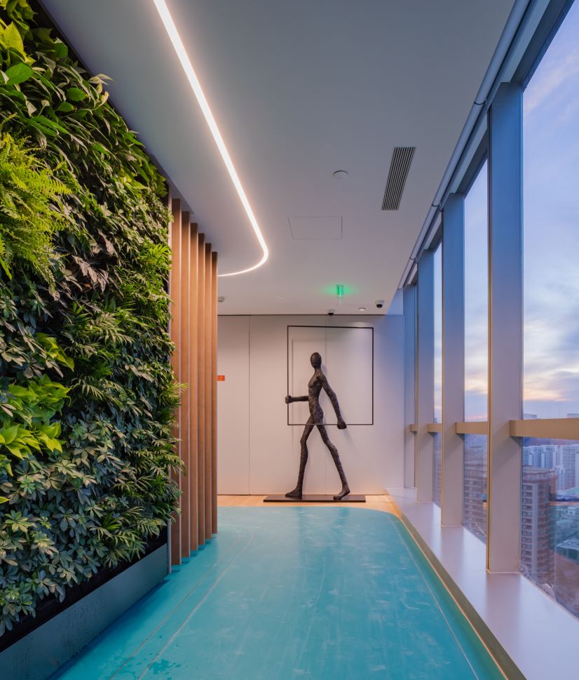 垂直空间的创意利用面对5.2米高的开阔空间,我们采取了垂直扩展策略,巧妙地增设夹层,不仅最大化了空间利用率,还便于俯瞰生产区,提升监控效率。通高位置边缘一圈被规划为开放的工作区,可根据员工的需求和项目的变化进行调整,多元灵活。在“回”字行过道转角处,仿真微生物景观成为空间中的艺术品。在电梯厅等候区,隐形门巧妙地融入logo墙,增强了空间的连贯性。而真·景观绿植盆栽则与logo墙形成对望。