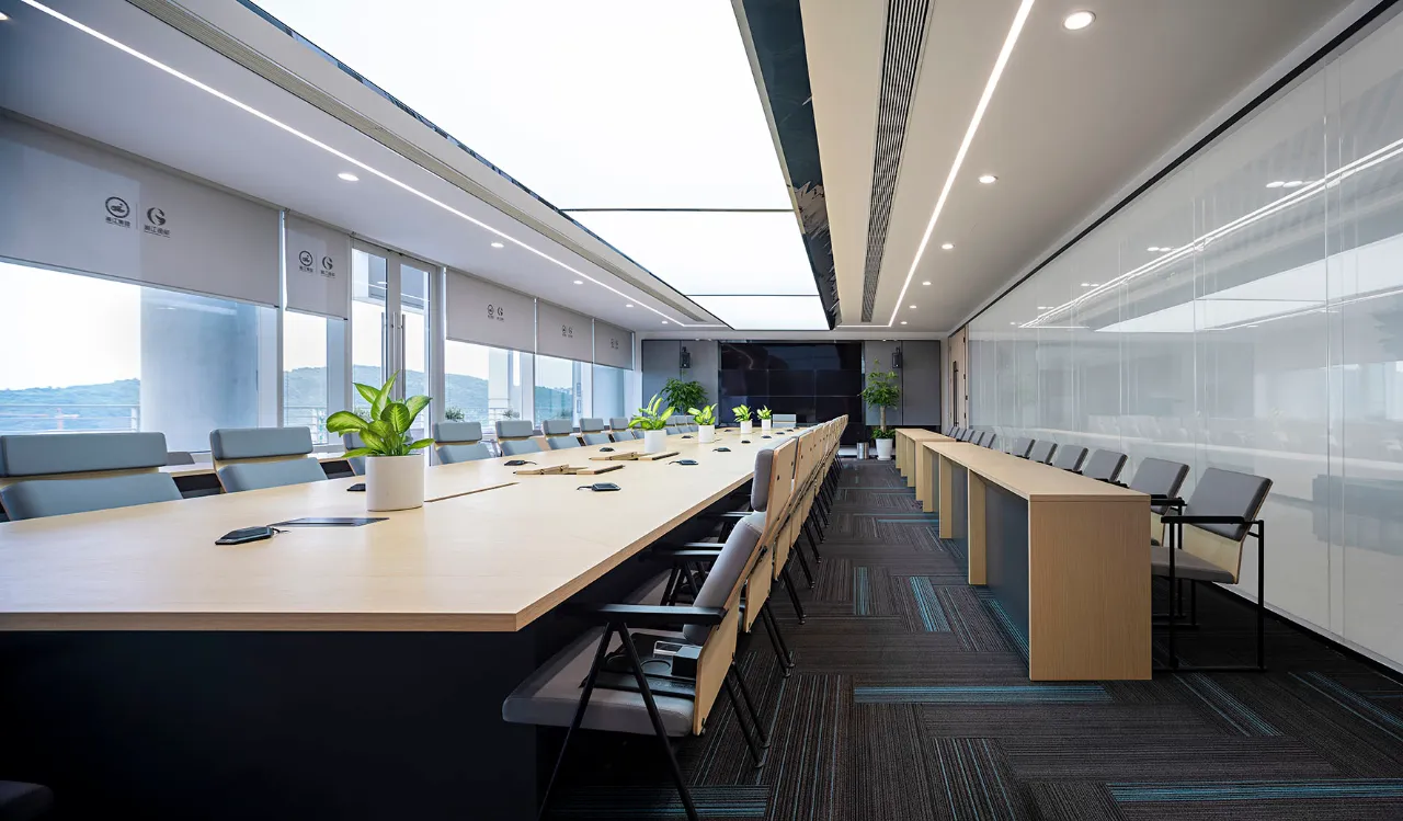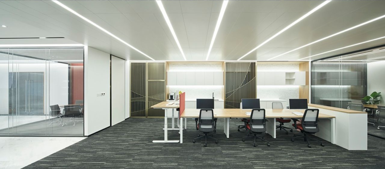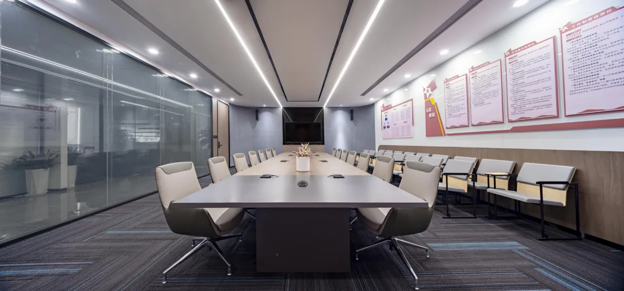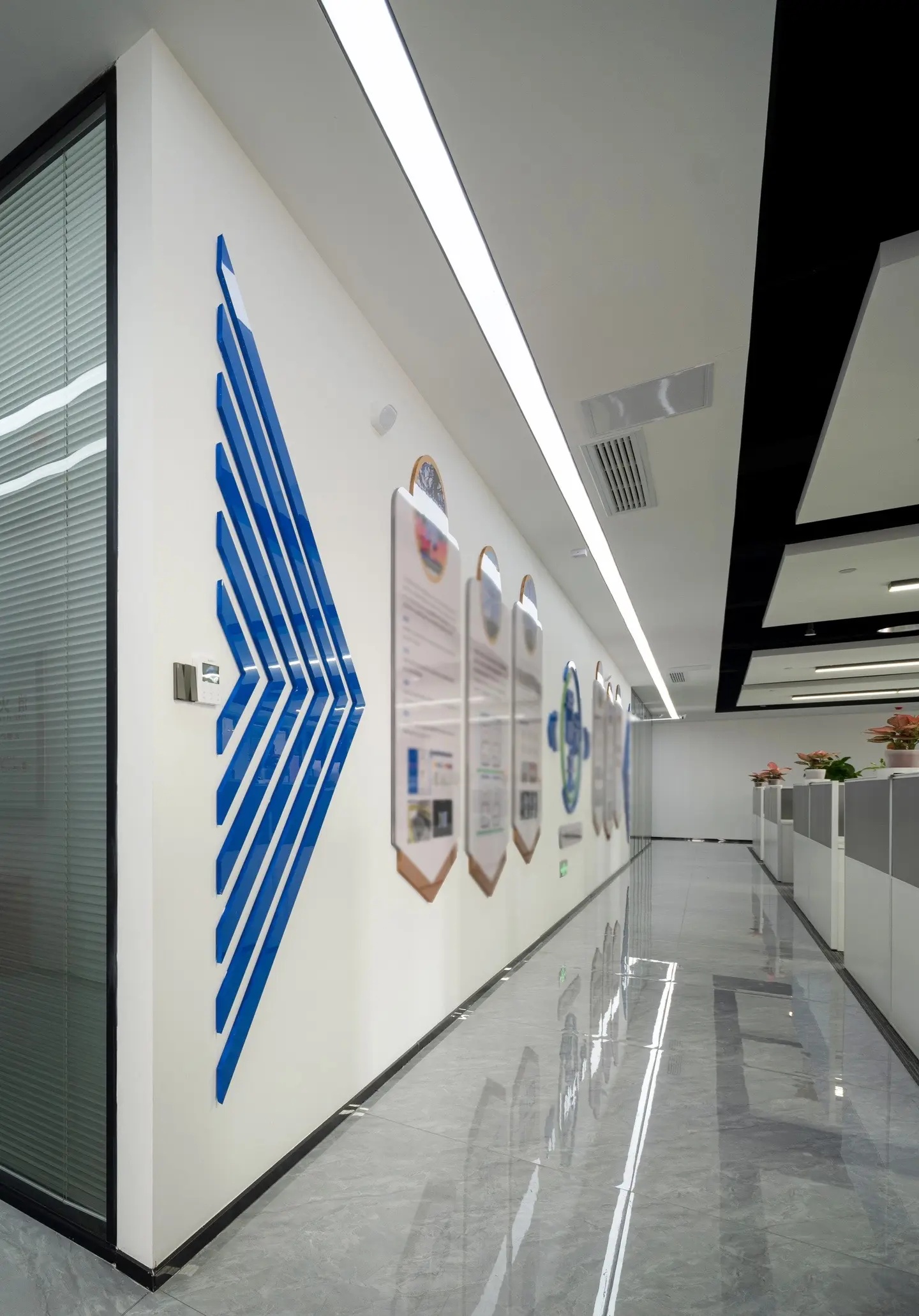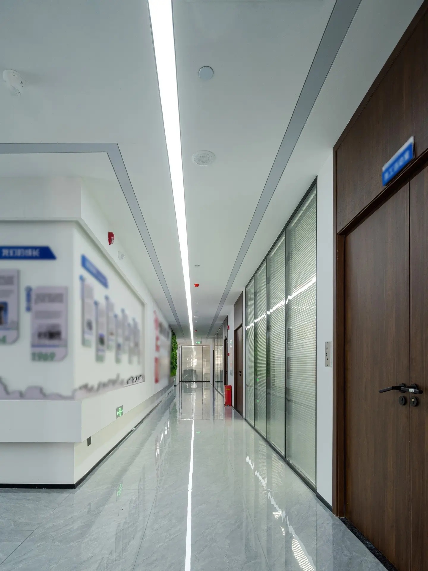 浅木色办公家具和皮质班椅的搭配,让空间整体氛围更加年轻时尚。嵌入式线性灯与金属材质的运用让空间更具科技感,打破了传统国企形象给人的刻板印象,同时又平衡了稳重感与严肃性。