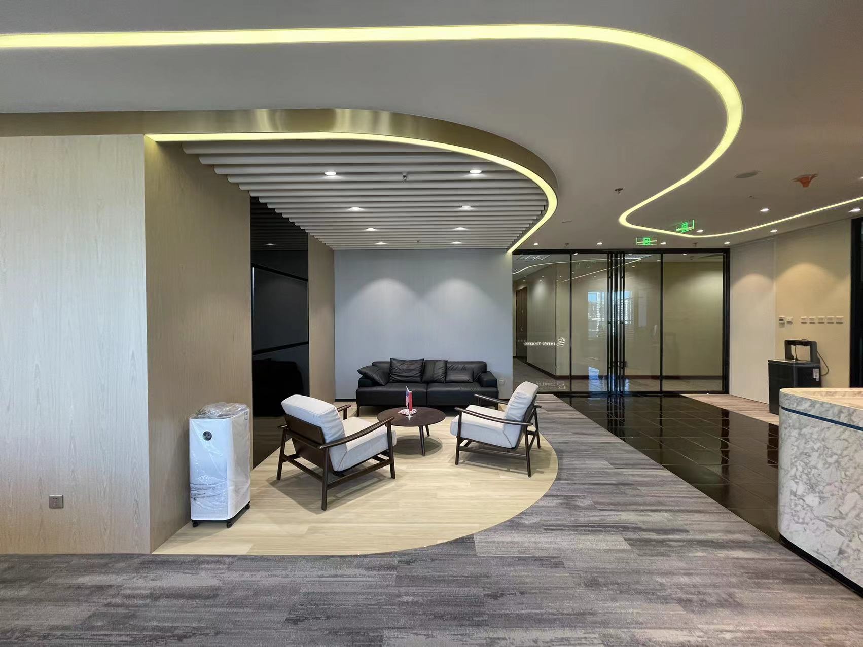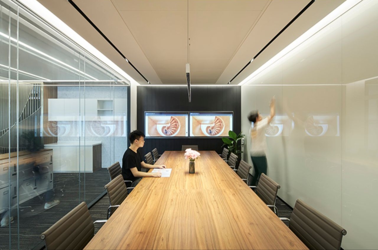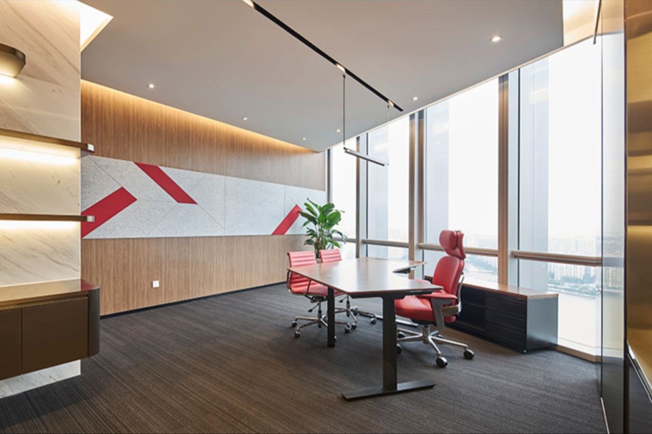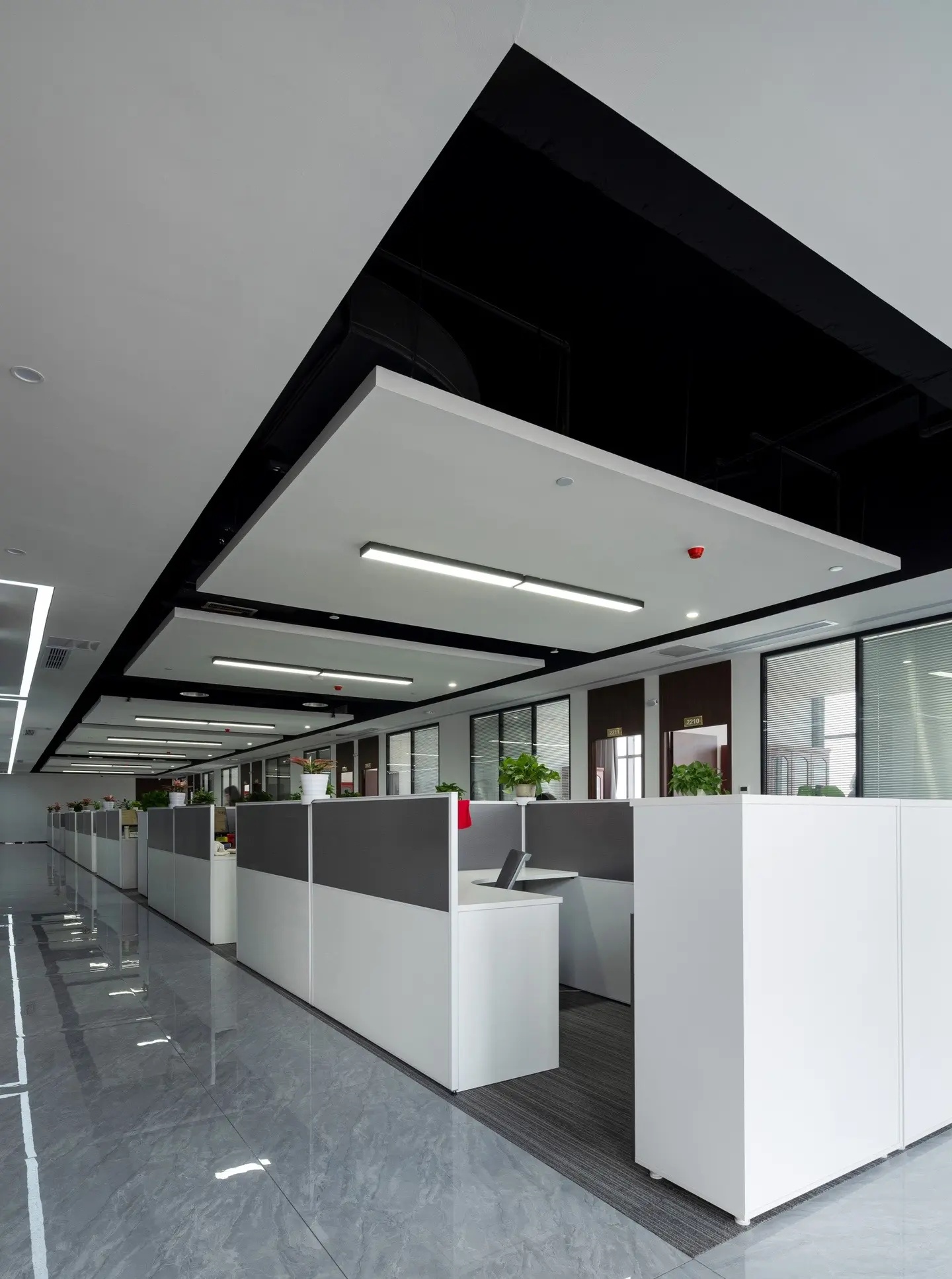 浅木色办公家具和皮质班椅的搭配,让空间整体氛围更加年轻时尚。嵌入式线性灯与金属材质的运用让空间更具科技感,打破了传统国企形象给人的刻板印象,同时又平衡了稳重感与严肃性。