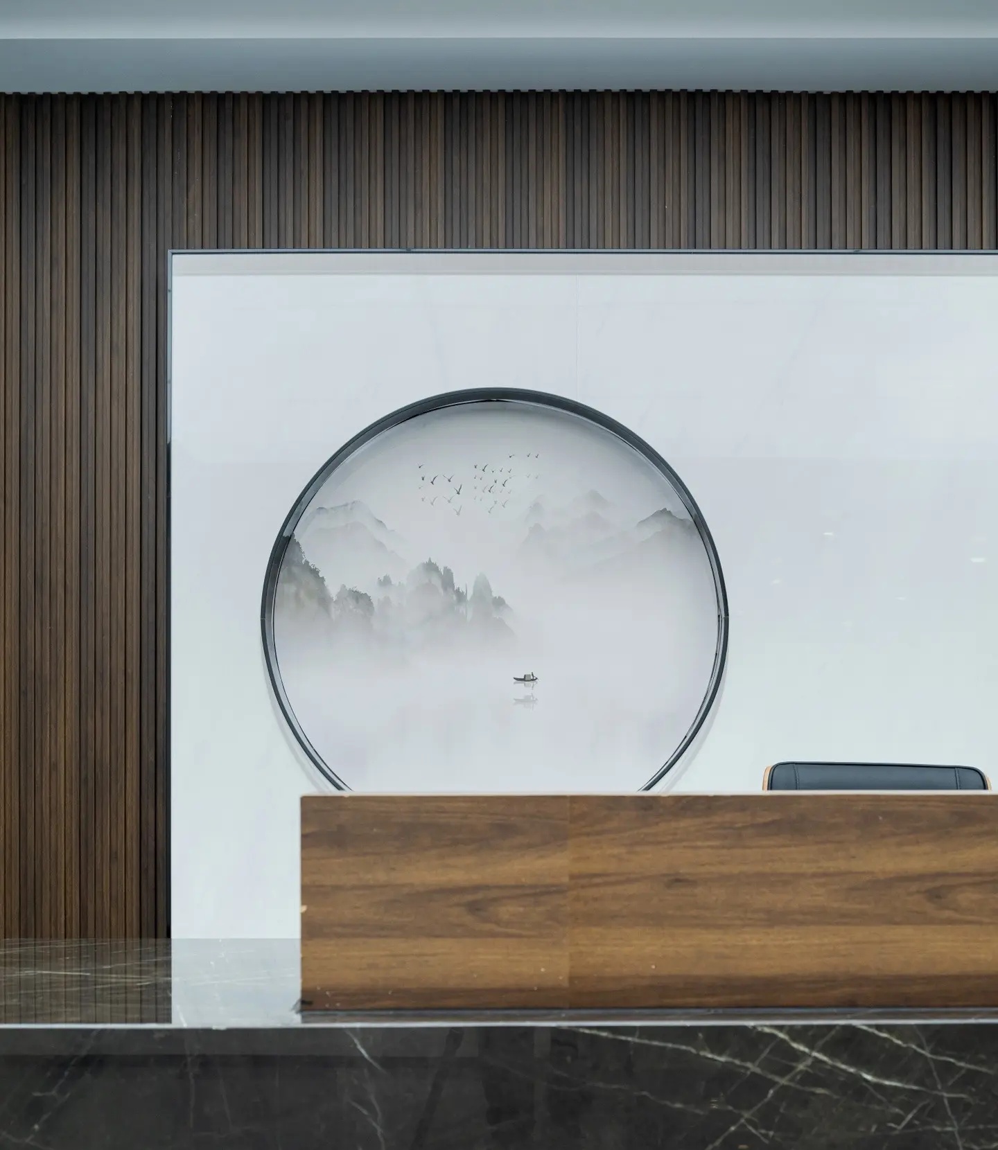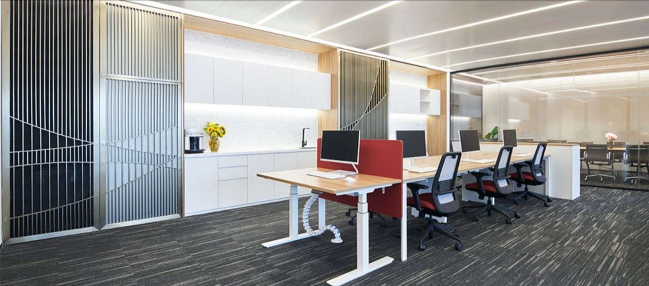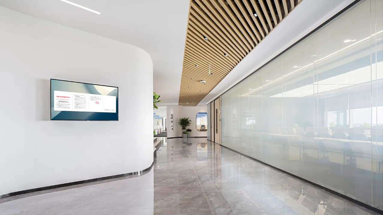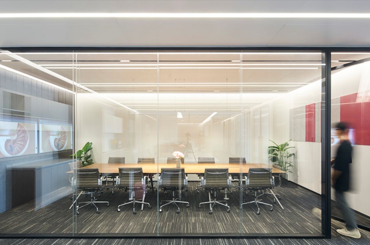 浅木色办公家具和皮质班椅的搭配,让空间整体氛围更加年轻时尚。嵌入式线性灯与金属材质的运用让空间更具科技感,打破了传统国企形象给人的刻板印象,同时又平衡了稳重感与严肃性。