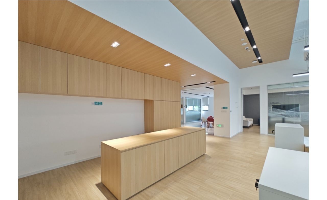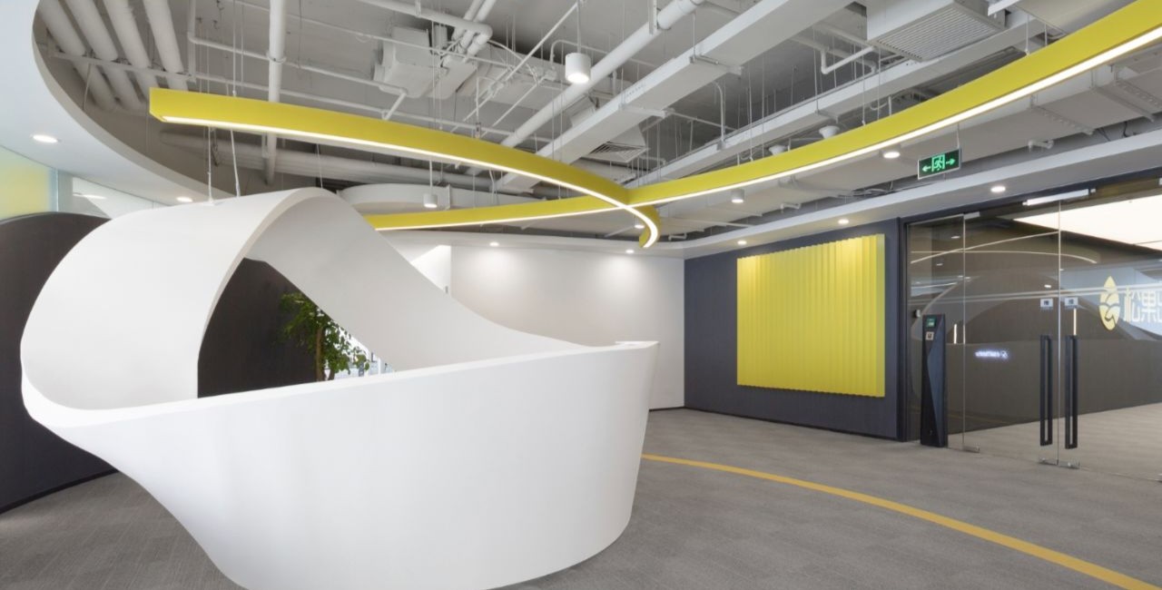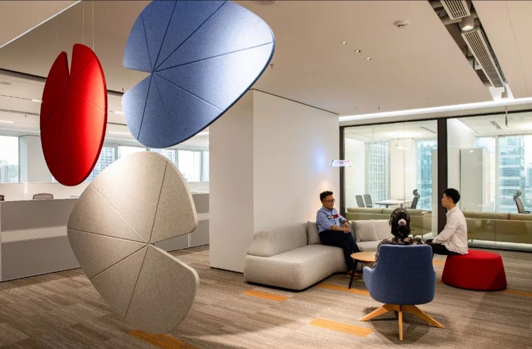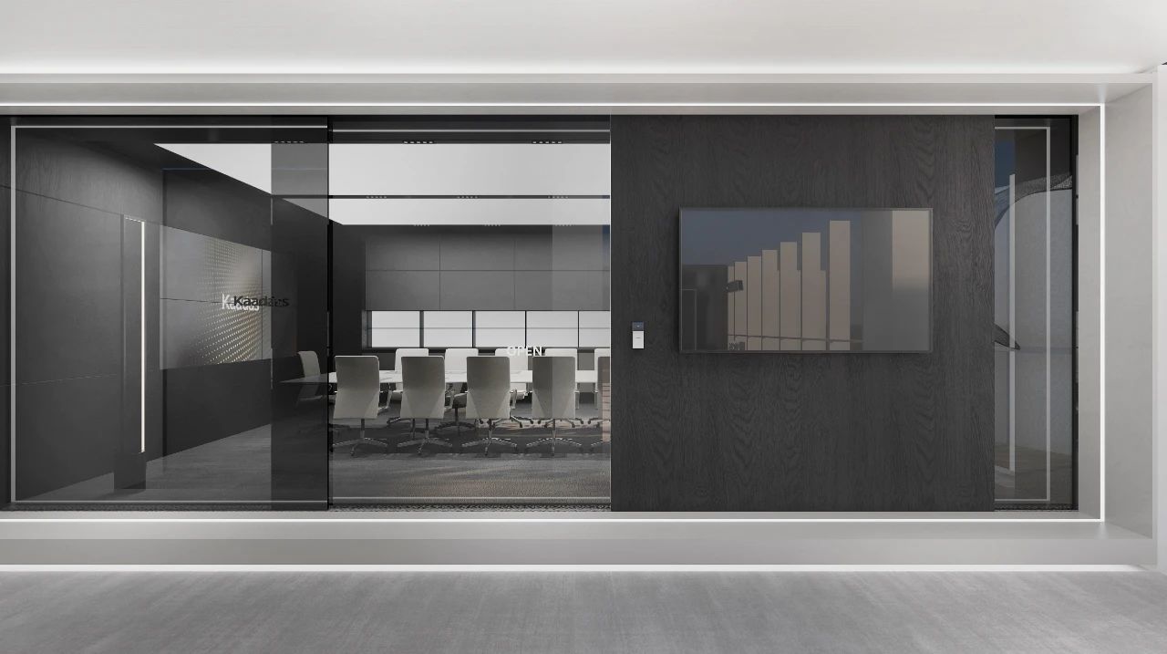 接待区作为进入办公室的第一空间,以简洁的线条和硬朗的材质为主要设计元素,打造出专业的第一感,通过灯光晕染的前厅空间亦给人冷静专注的视觉感受。入口便会看见以公司主色调的荷叶吊屏,在满足视觉隔断,分割空间等基础功能的同时,荷叶吊屏本身采用了吸音毛毡板作为内芯,能满足一定的吸音功能。