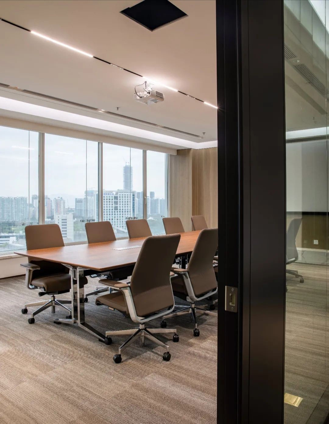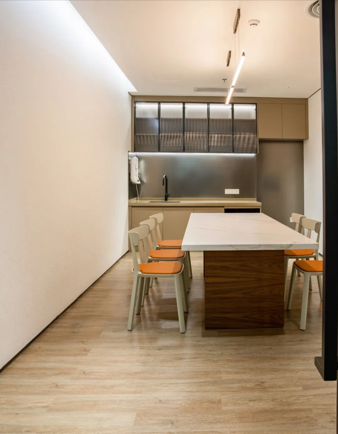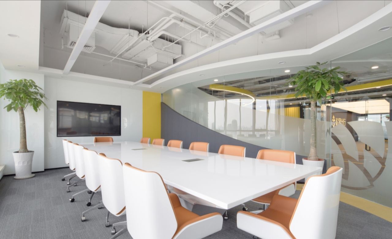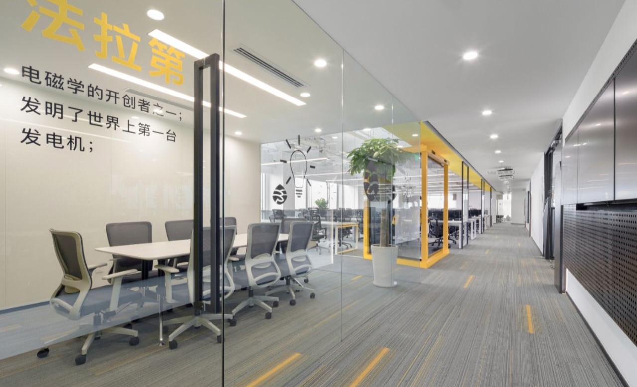 接待区作为进入办公室的第一空间,以简洁的线条和硬朗的材质为主要设计元素,打造出专业的第一感,通过灯光晕染的前厅空间亦给人冷静专注的视觉感受。入口便会看见以公司主色调的荷叶吊屏,在满足视觉隔断,分割空间等基础功能的同时,荷叶吊屏本身采用了吸音毛毡板作为内芯,能满足一定的吸音功能。