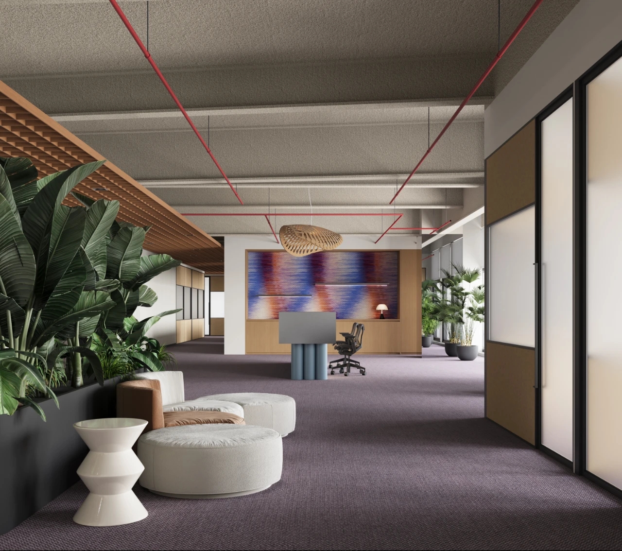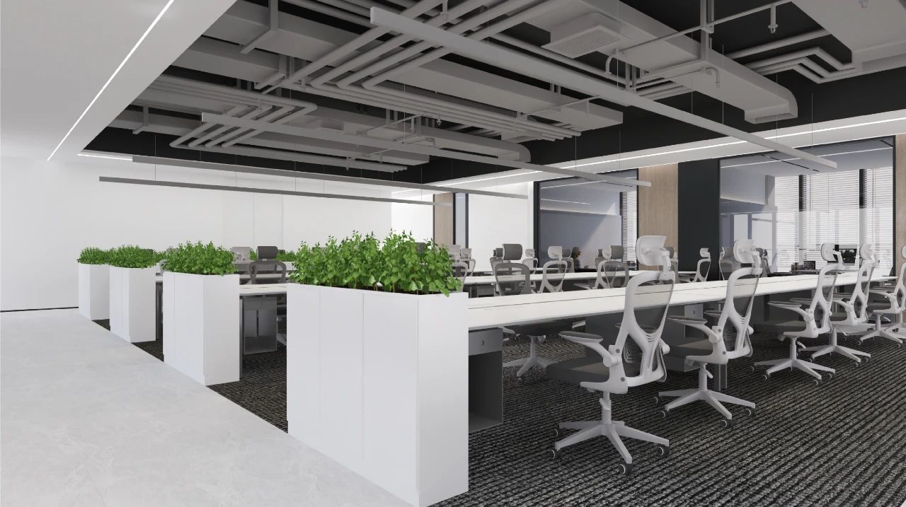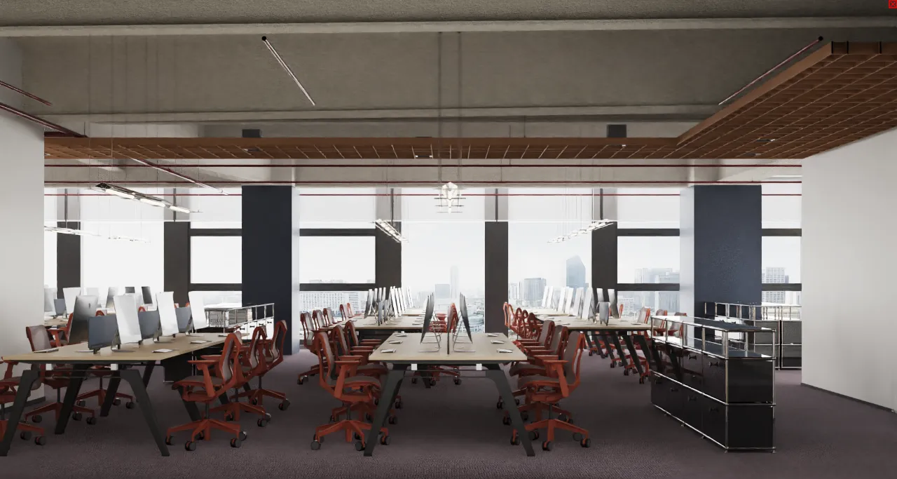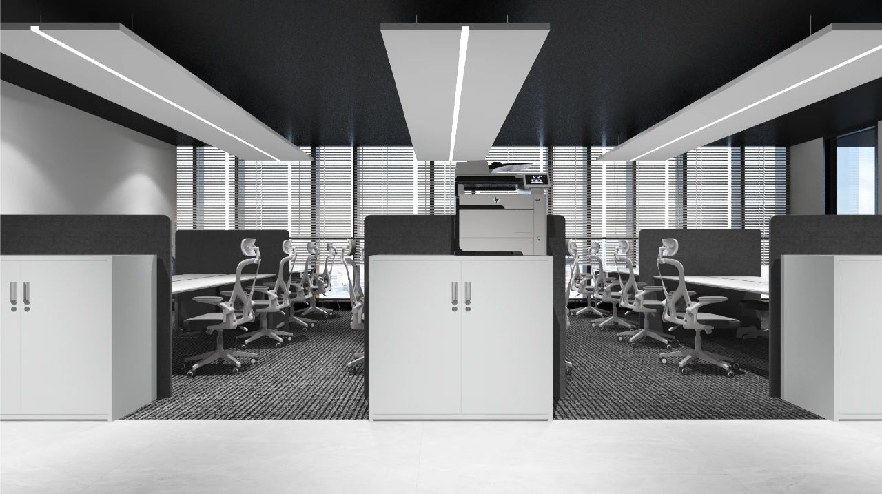 包豪斯风格办公区设计摒弃了传统的封闭式隔间,转而采用开放式布局,使员工之间更容易进行非正式的沟通和知识分享。在中性背景下,用一种或两种重点色来吸引眼球。例如,红色的办公椅或黑色的柜体都能成为焦点,同时也能反映公司的品牌色彩。