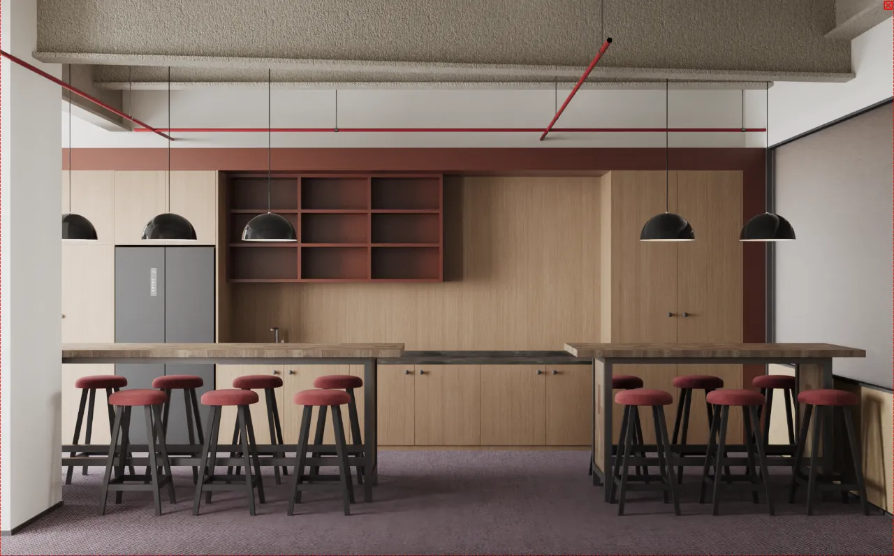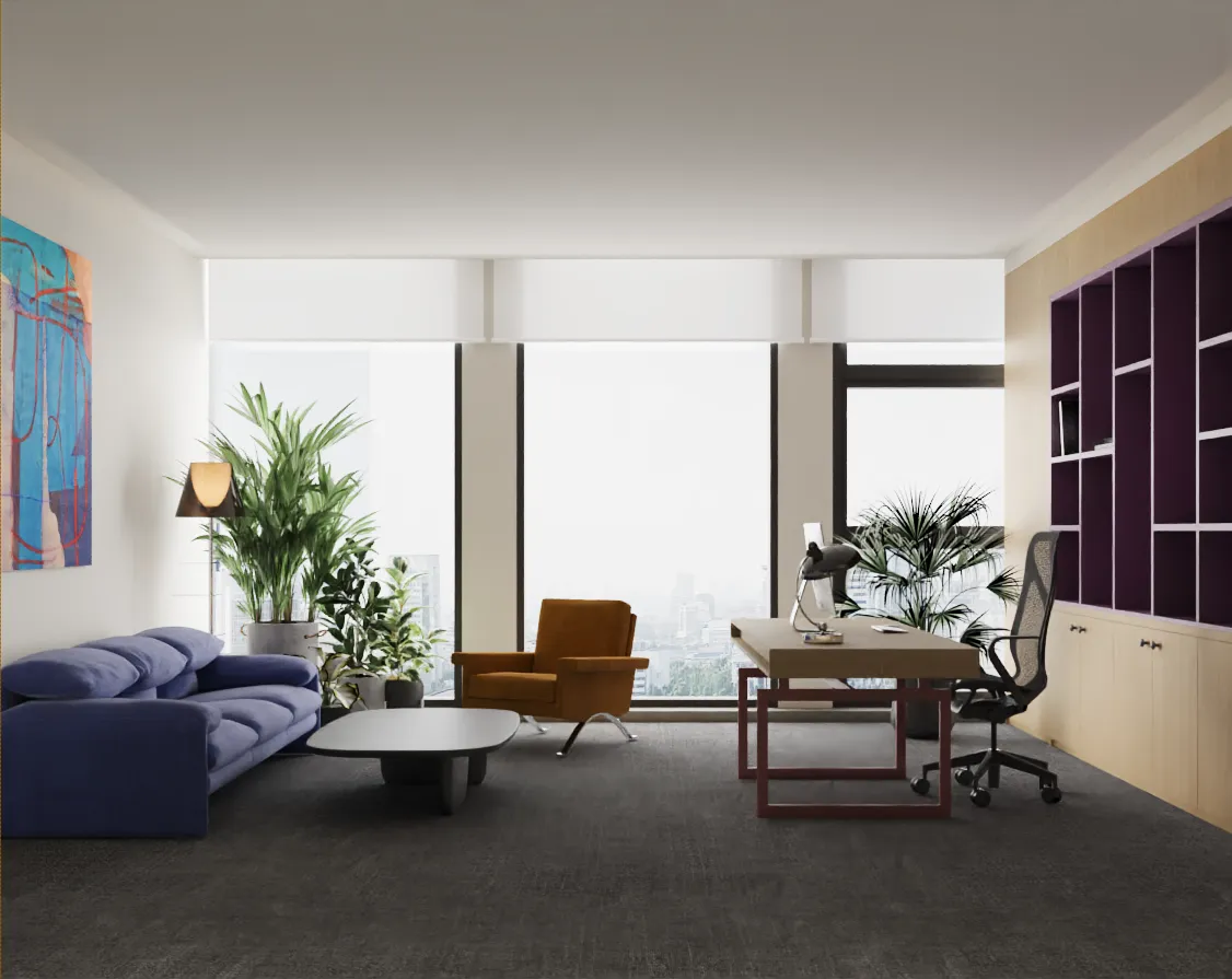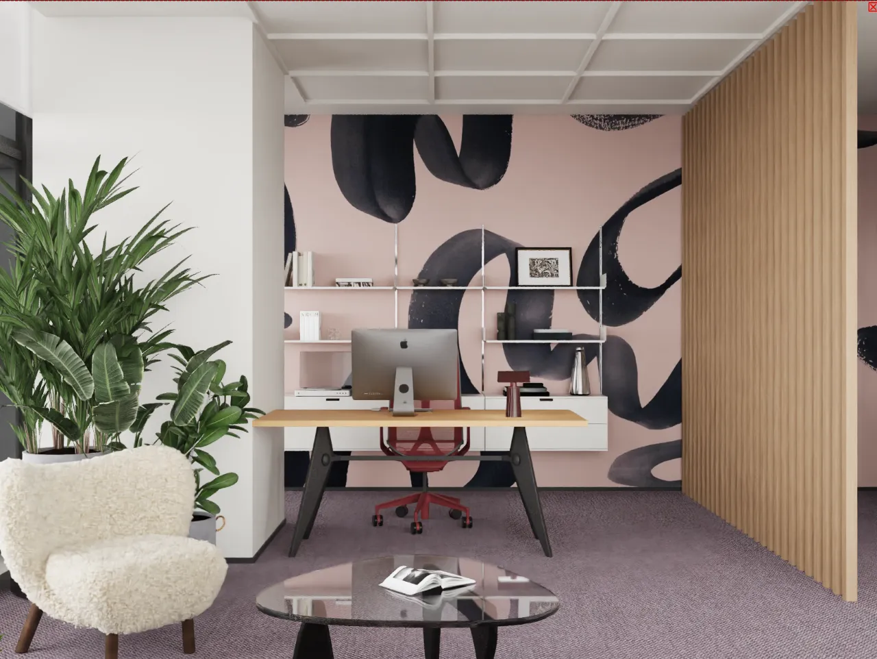 包豪斯风格办公区设计摒弃了传统的封闭式隔间,转而采用开放式布局,使员工之间更容易进行非正式的沟通和知识分享。在中性背景下,用一种或两种重点色来吸引眼球。例如,红色的办公椅或黑色的柜体都能成为焦点,同时也能反映公司的品牌色彩。