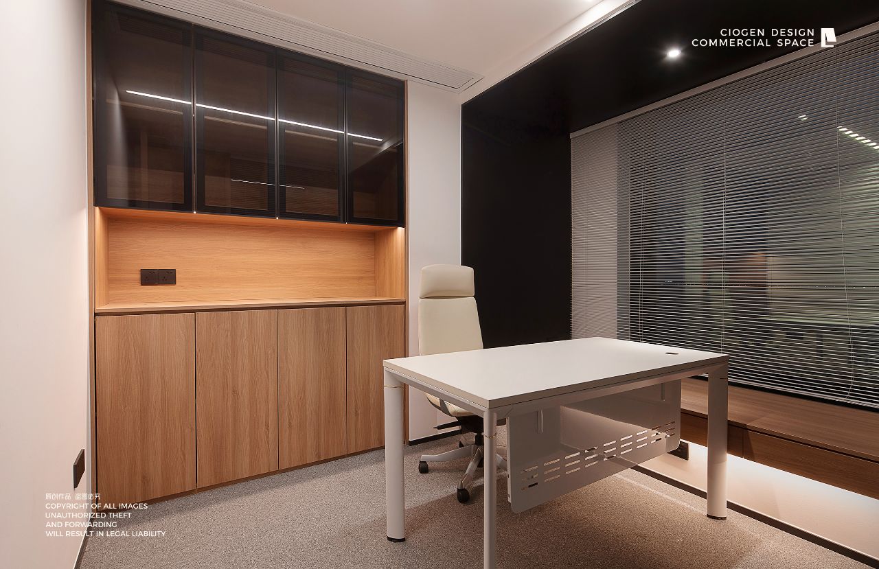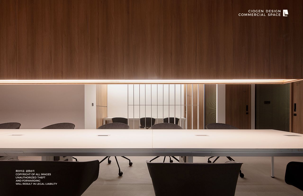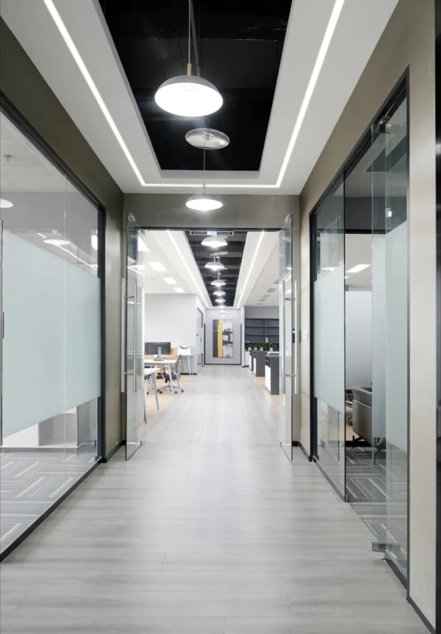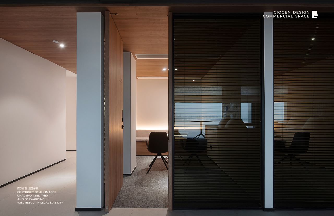 室内建筑是由6个隔间打通隔墙成一体,空间规划将大门放在公司中线位置,出入便利且根据了公司人员部门设置南北区。而整个布局动线和立面装饰风格提取了企业logo的切角元素、以及黑白灰配色系统。将正面和前台背景都做成斜面,增加了展示长度,让空间更为大气和灵动。