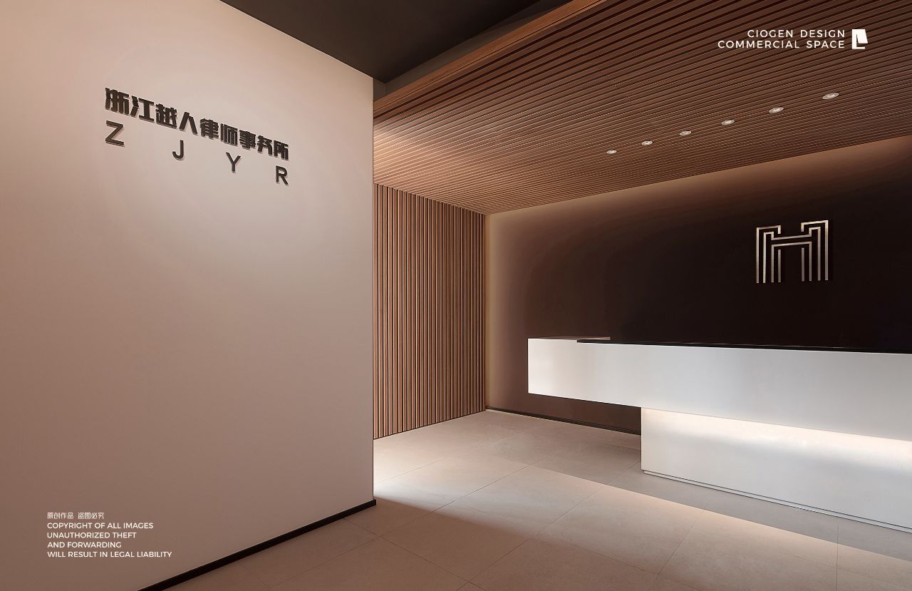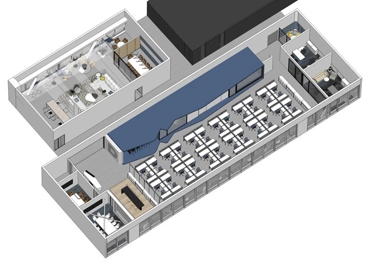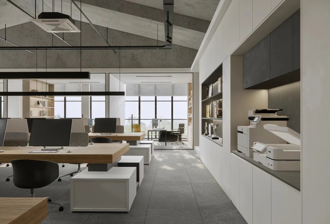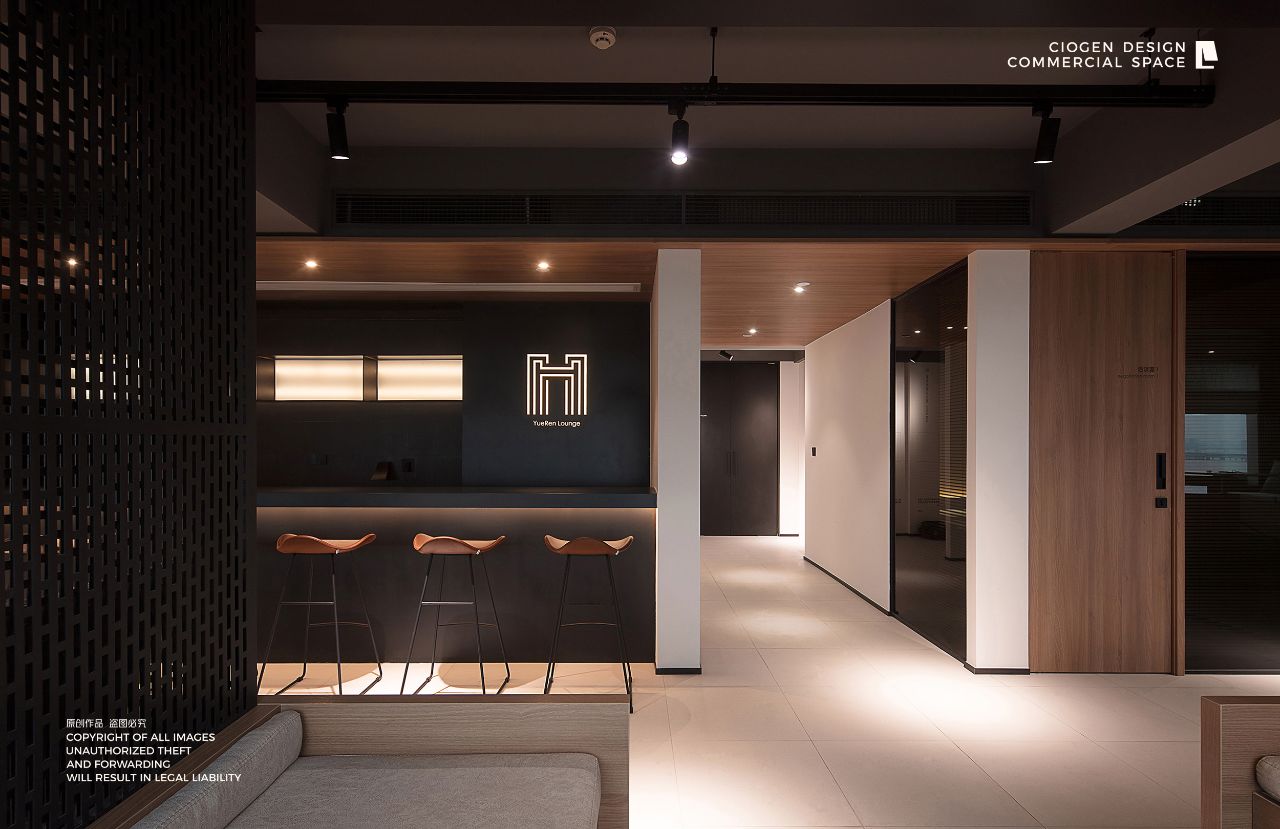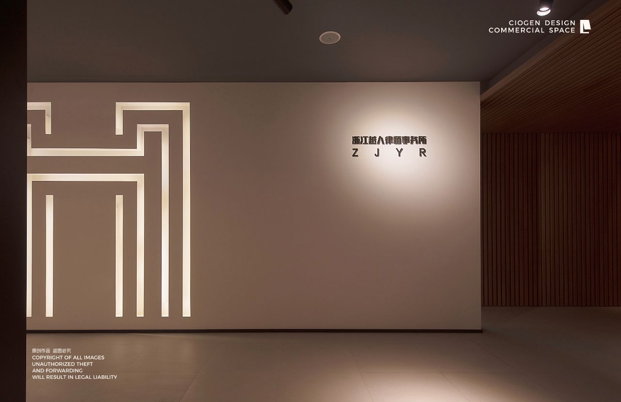室内建筑是由6个隔间打通隔墙成一体,空间规划将大门放在公司中线位置,出入便利且根据了公司人员部门设置南北区。而整个布局动线和立面装饰风格提取了企业logo的切角元素、以及黑白灰配色系统。将正面和前台背景都做成斜面,增加了展示长度,让空间更为大气和灵动。