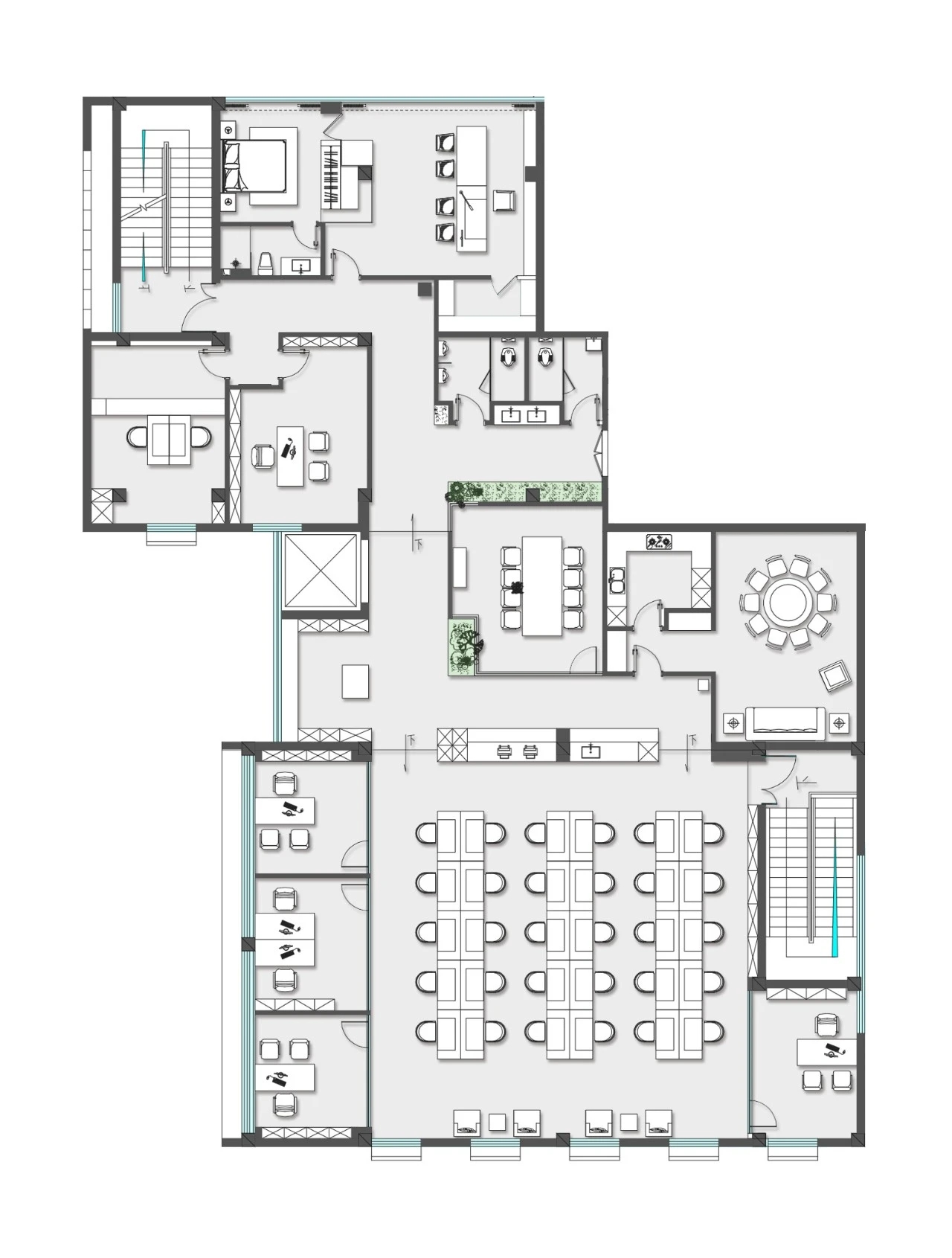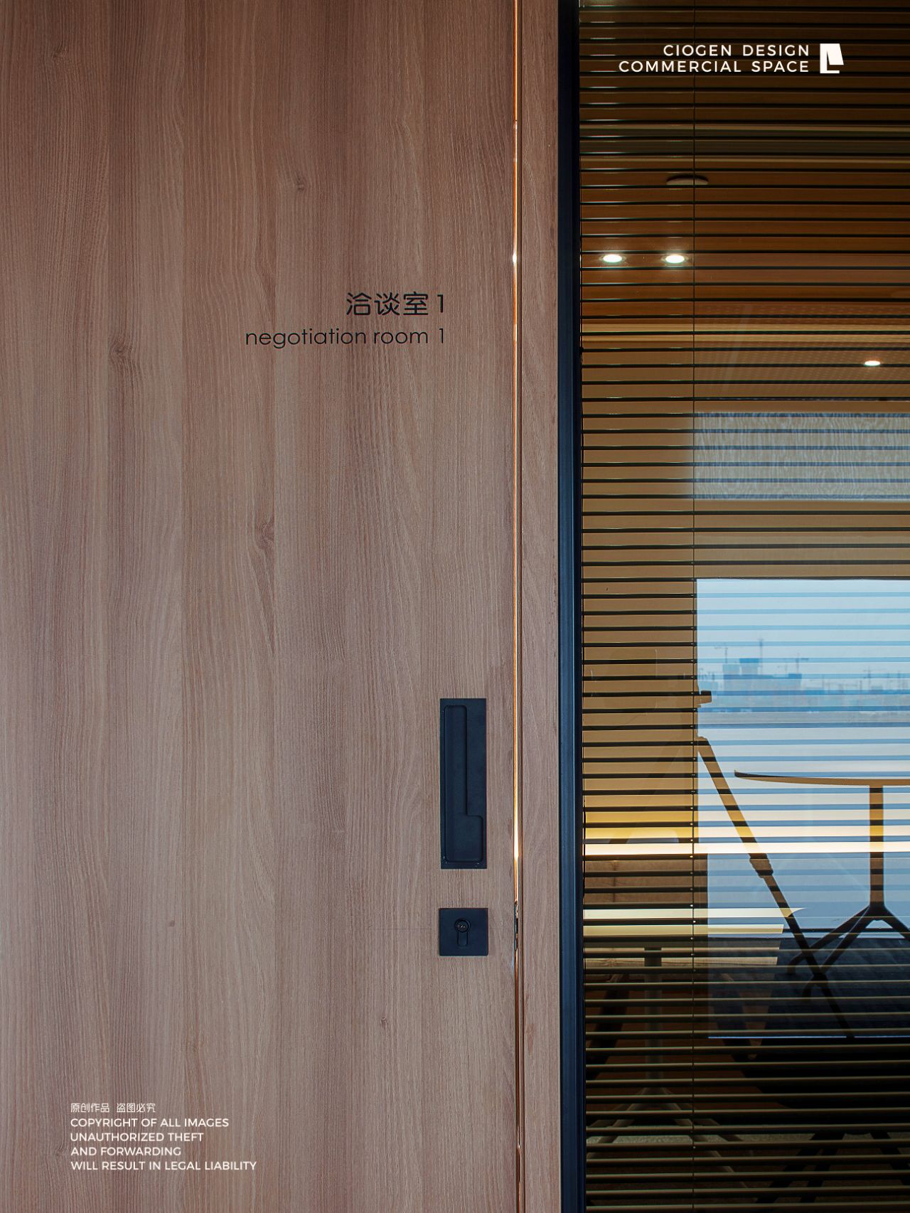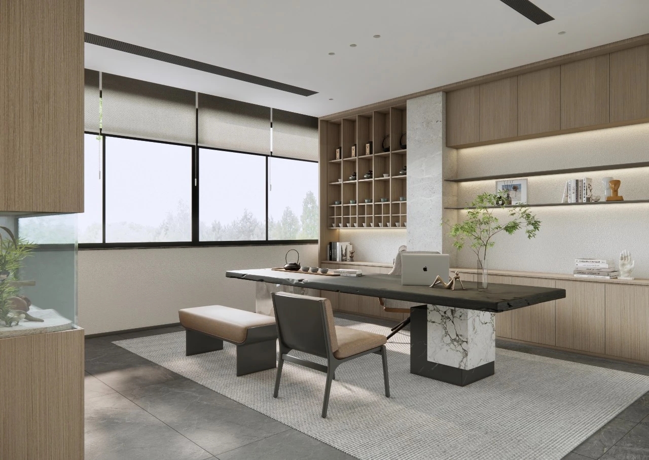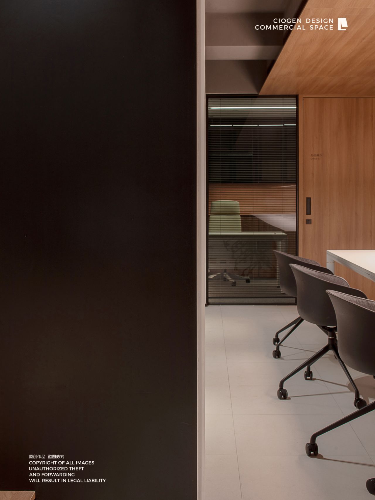 室内建筑是由6个隔间打通隔墙成一体,空间规划将大门放在公司中线位置,出入便利且根据了公司人员部门设置南北区。而整个布局动线和立面装饰风格提取了企业logo的切角元素、以及黑白灰配色系统。将正面和前台背景都做成斜面,增加了展示长度,让空间更为大气和灵动。