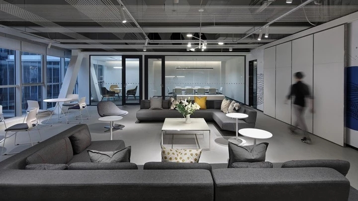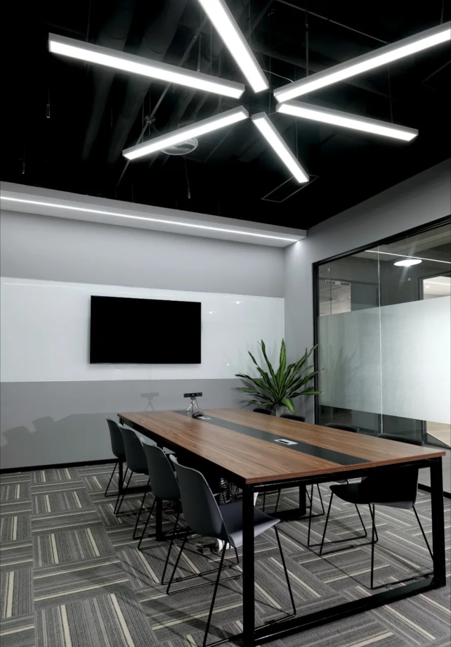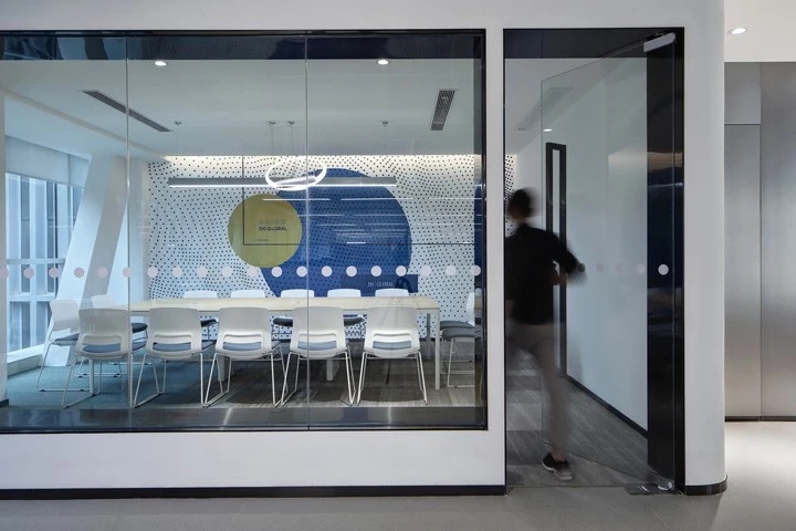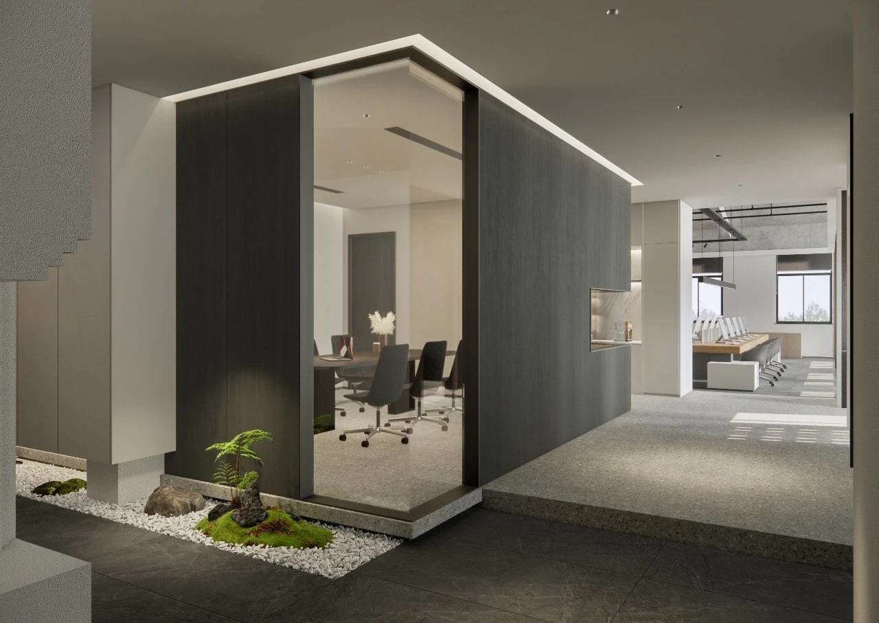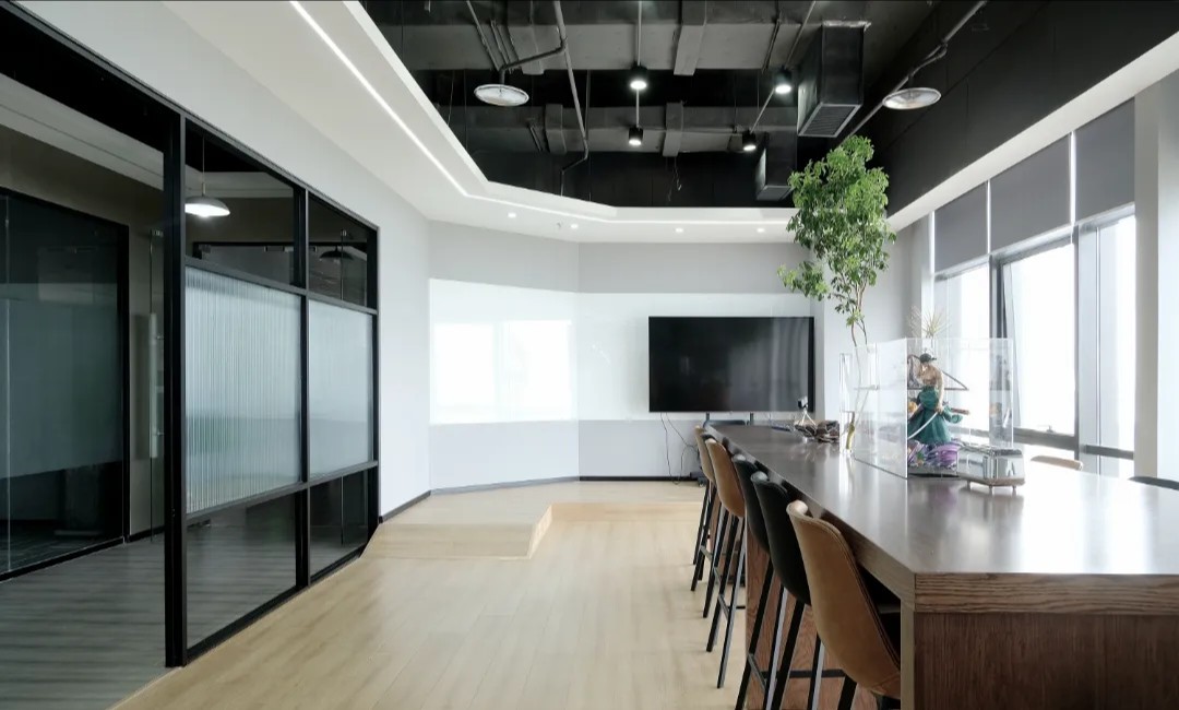 企业前区,黑白的运用,呈现给客户务实的科技企业不带有明显的感情色彩。氧化铝板和简洁的灰色PVC地垫同时表现科技公司高效利落,可变的电子屏寓意开发领域的无限可能性。进门的巨大发光logo,宛如数据传播的隧道,让人印象深刻。同时强化“粒子系统”所代表的前沿科技、多元及包容并蓄的文化。并使之更加的有话题性,以其达到深入内心的作用,提高公司的文化凝聚力。