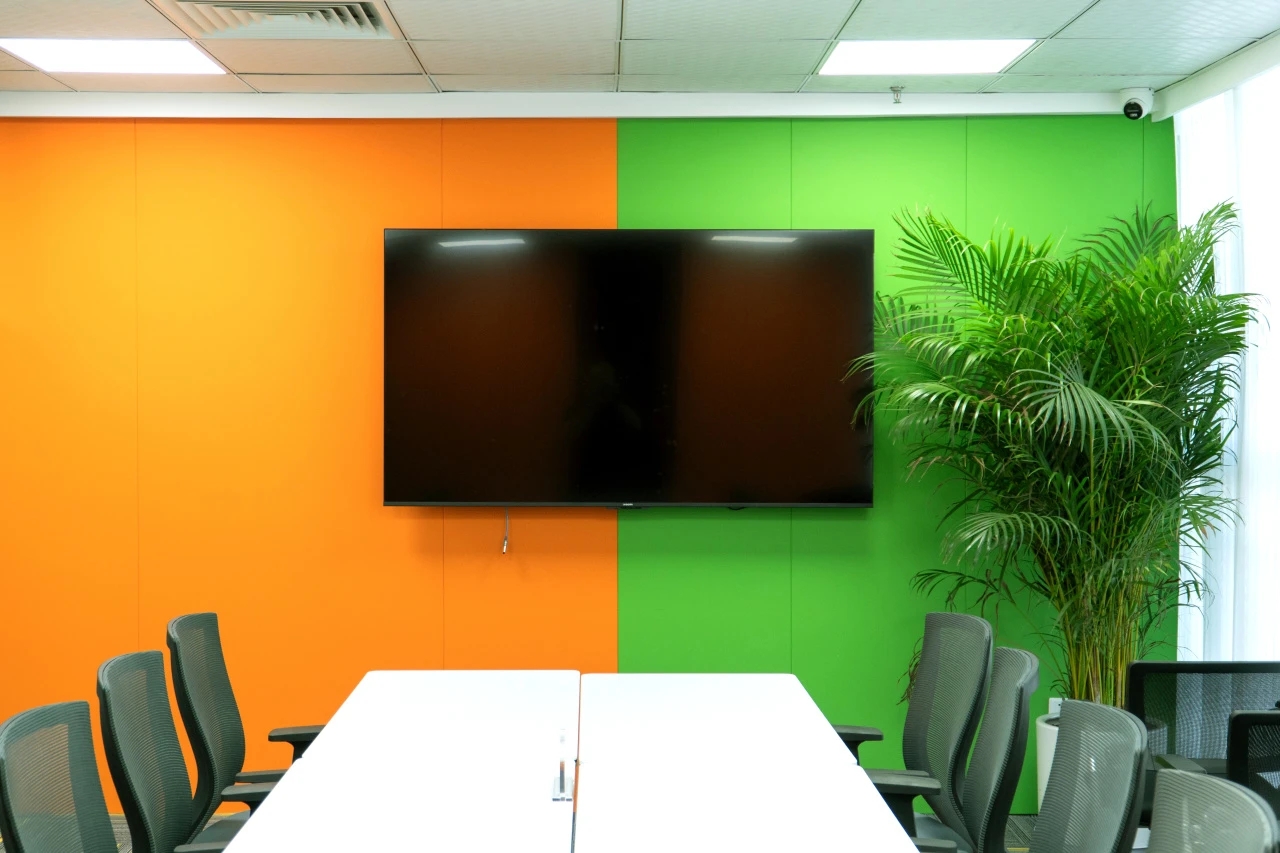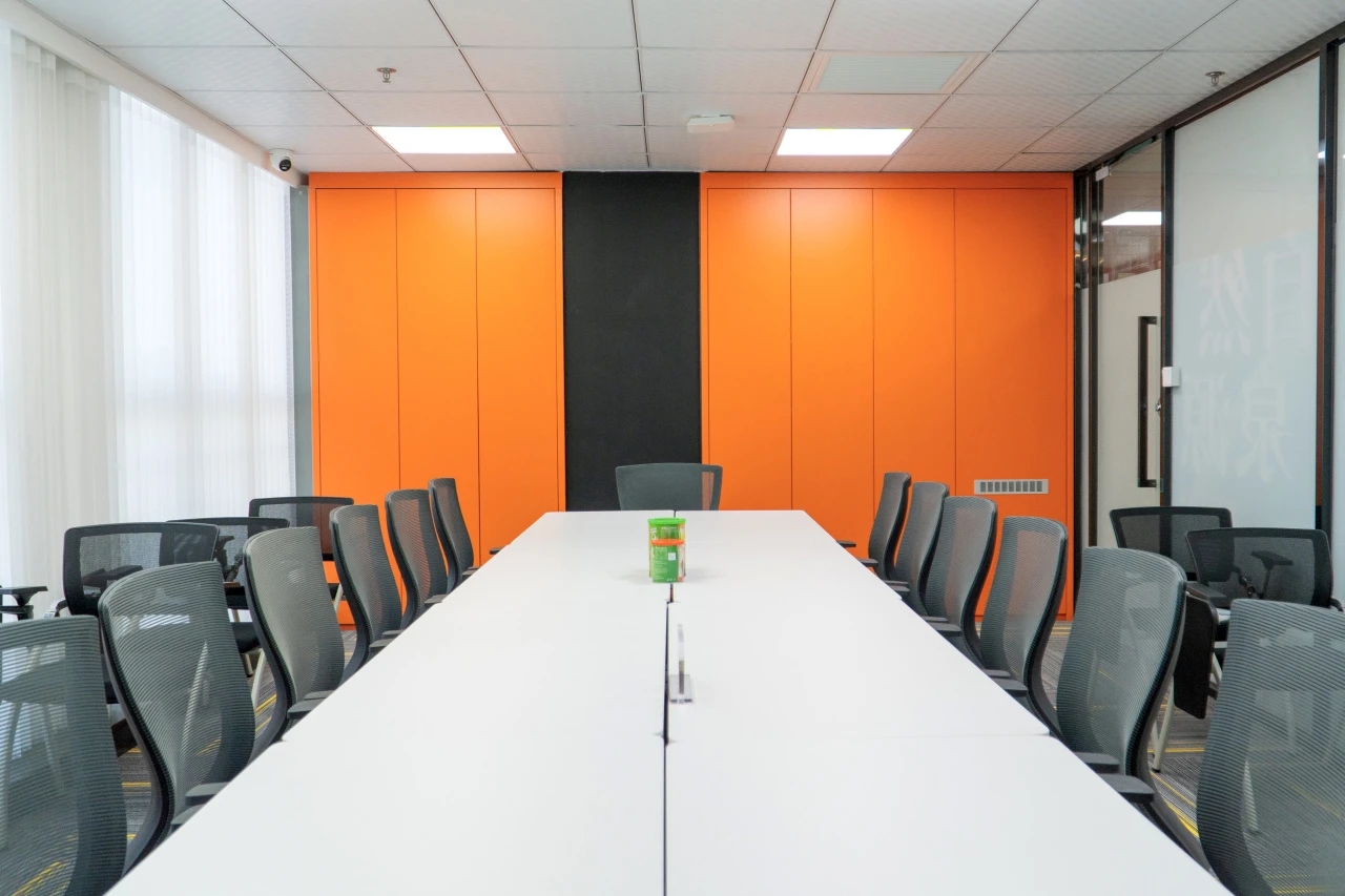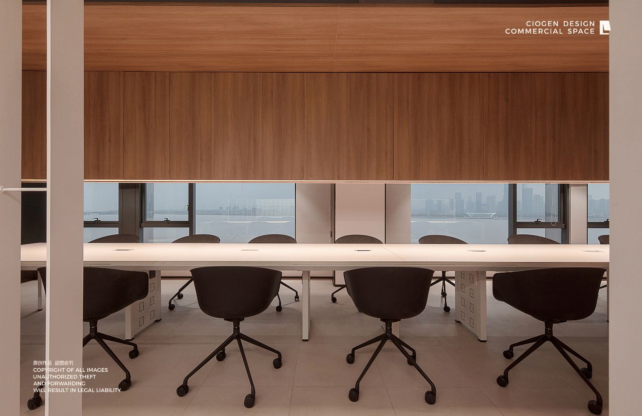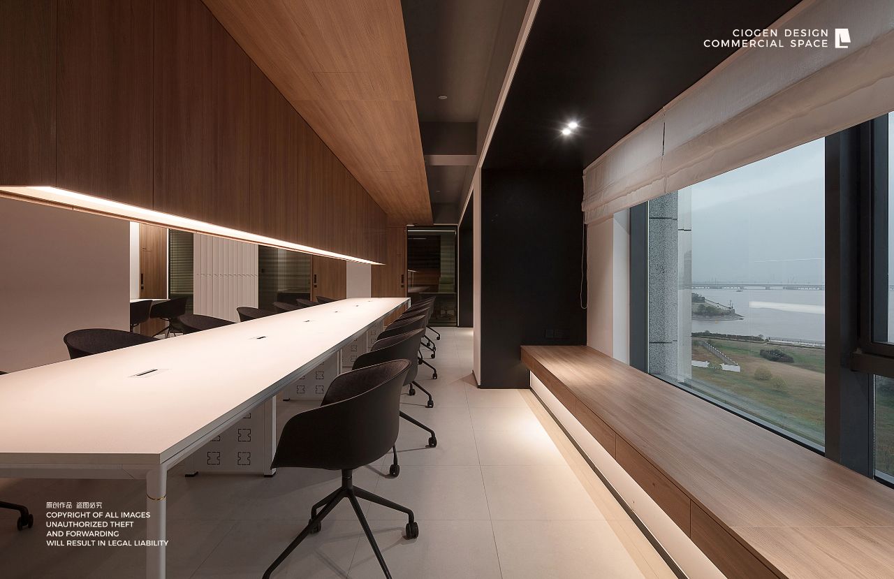 企业前区,黑白的运用,呈现给客户务实的科技企业不带有明显的感情色彩。氧化铝板和简洁的灰色PVC地垫同时表现科技公司高效利落,可变的电子屏寓意开发领域的无限可能性。进门的巨大发光logo,宛如数据传播的隧道,让人印象深刻。同时强化“粒子系统”所代表的前沿科技、多元及包容并蓄的文化。并使之更加的有话题性,以其达到深入内心的作用,提高公司的文化凝聚力。