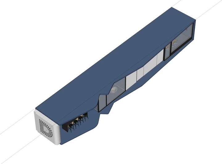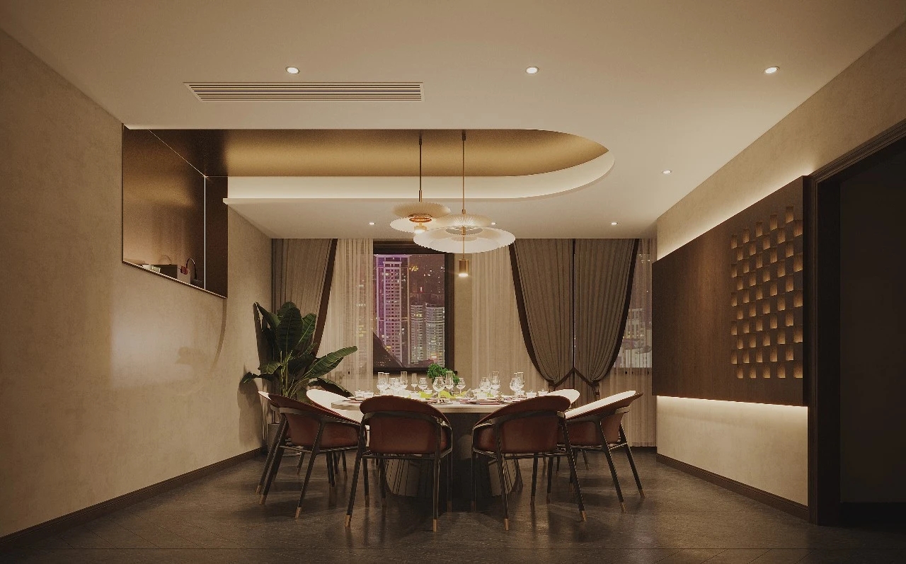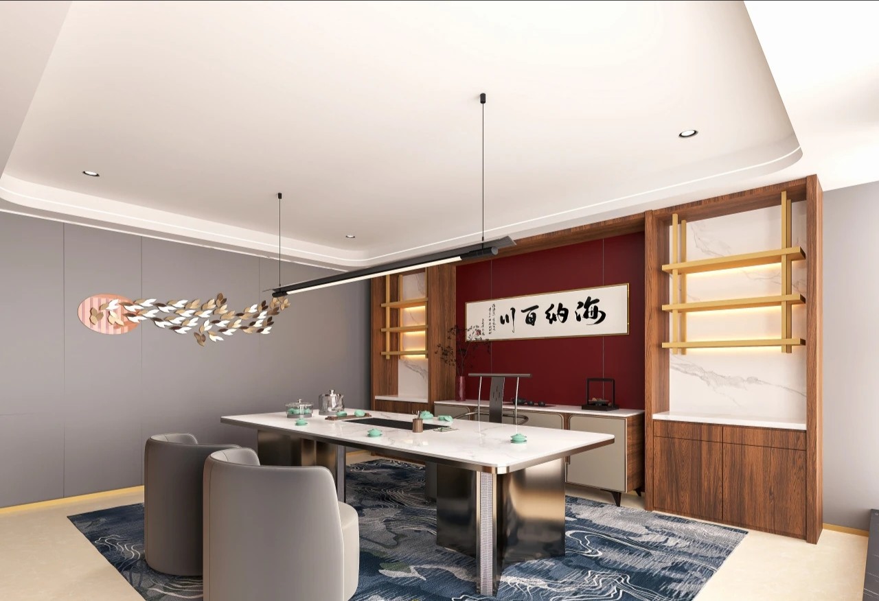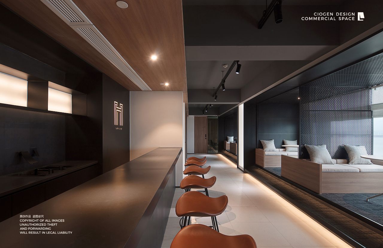 尝试了一些新型网红材料,如金属波浪板、金属膜、异型线条、长虹玻璃等,搭配LED线条灯和用两种颜色的地板划分出各个功能区域。