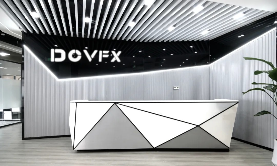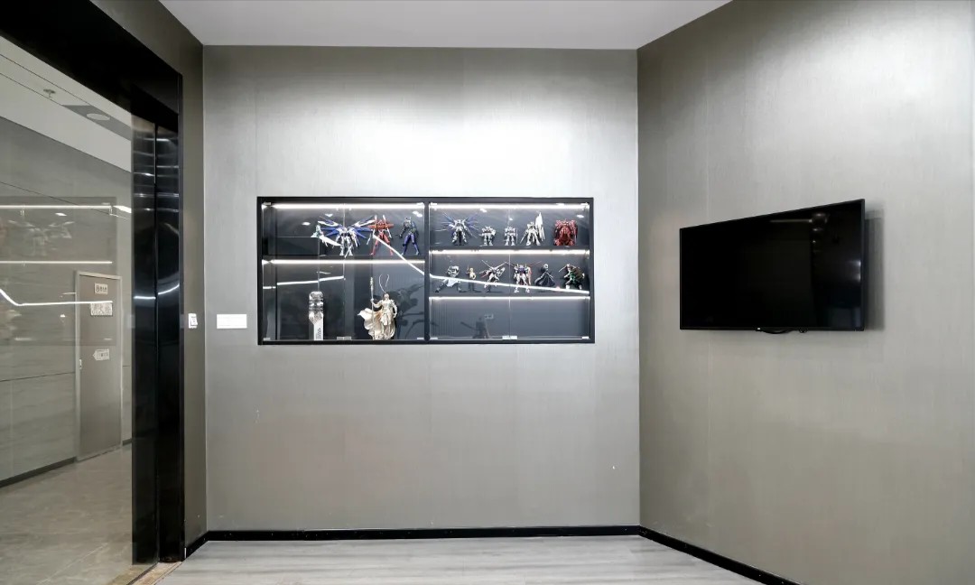 进入公司首先是一道不规则的切角墙面构造出仿佛科幻场景的前厅区域,来访者映入眼帘的是一个放置公司做塑造过动画形象公仔展示柜和一个屏幕播放制作的影视作品,右手边是前台区域, 犹如钻石切割形状、金属质感的波浪板、黑色镜面烤漆玻璃等塑造的形象墙与LOGO字体的元素呼应起来。