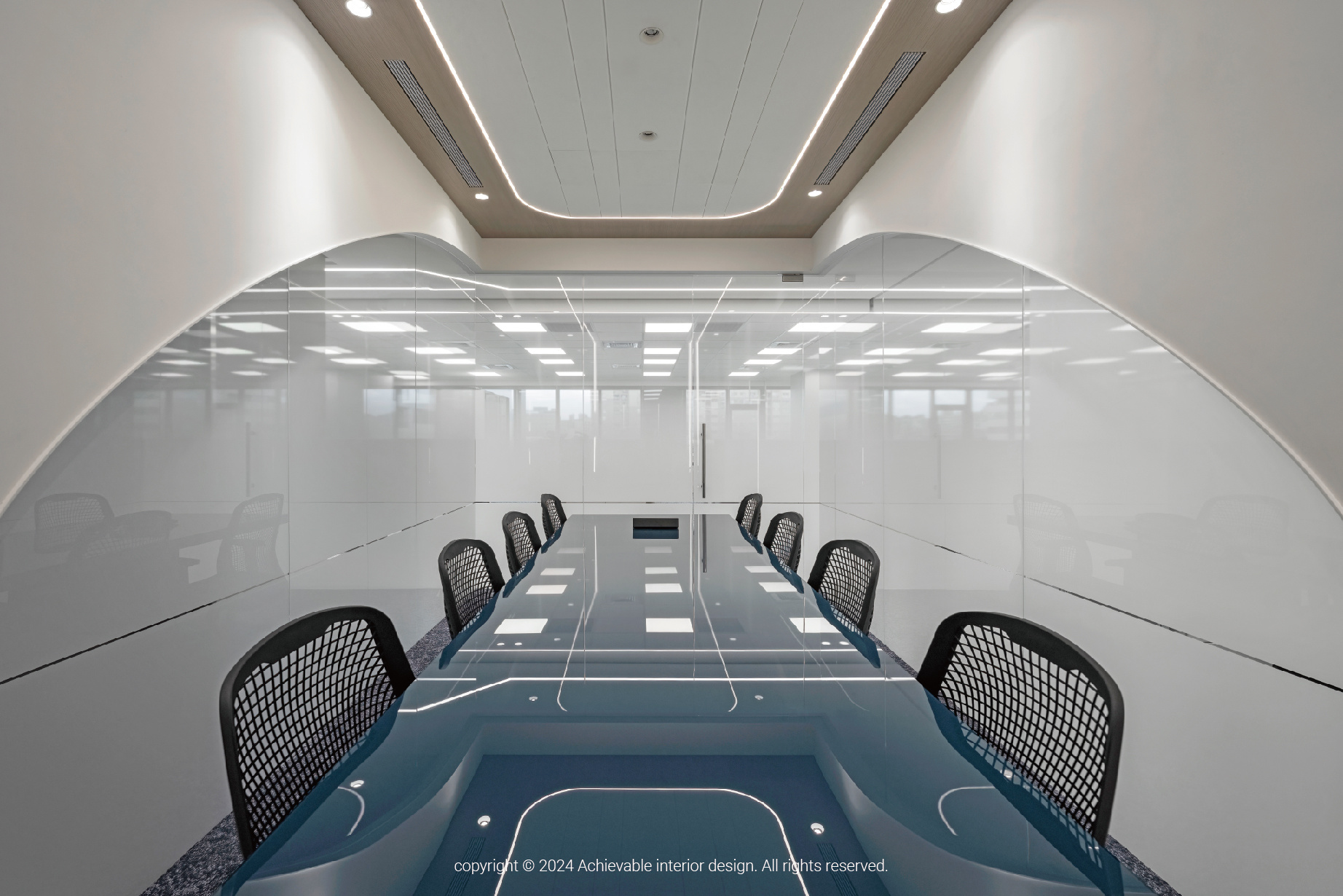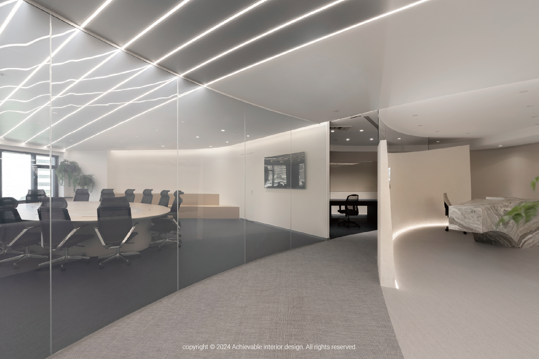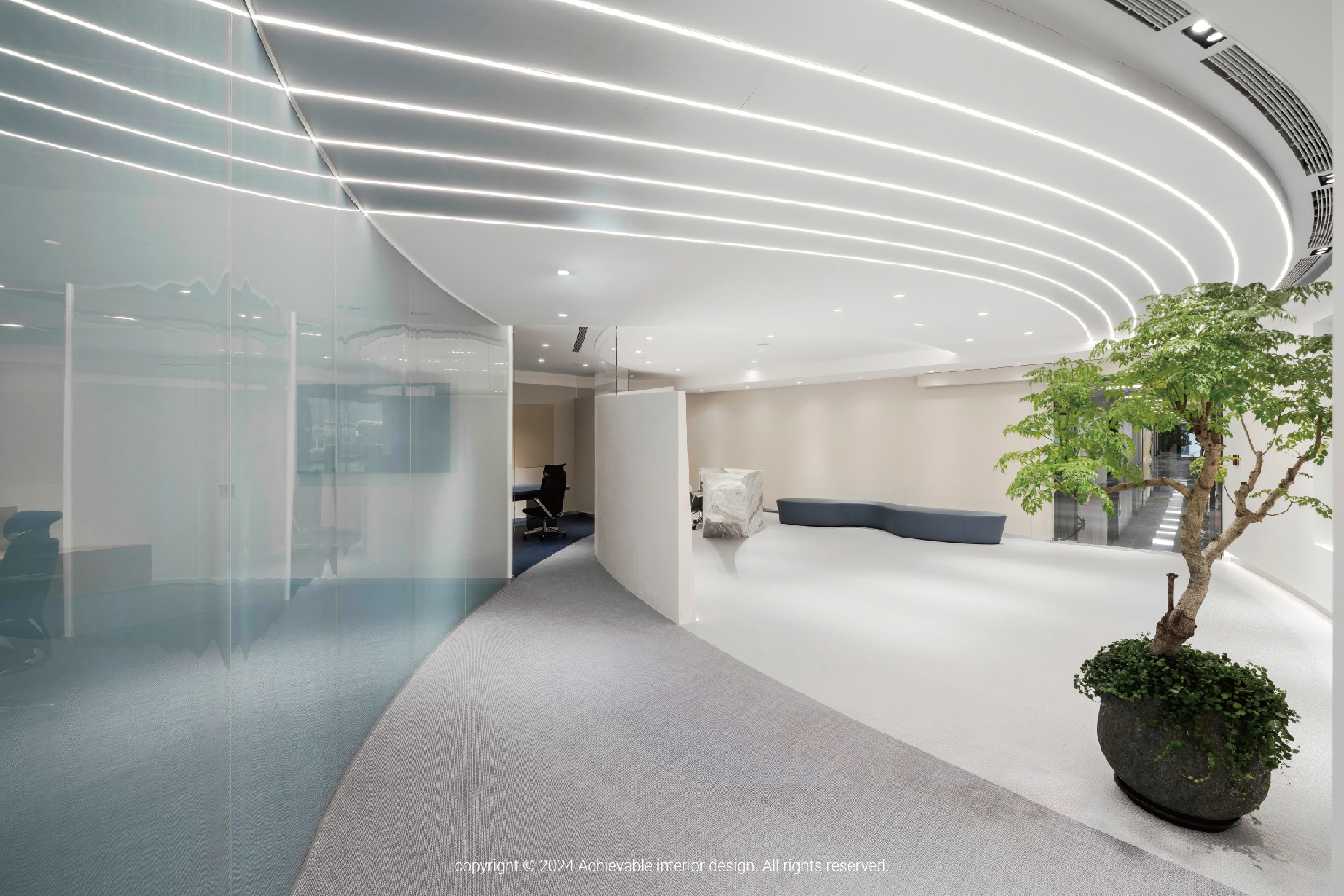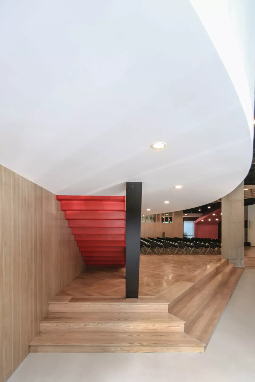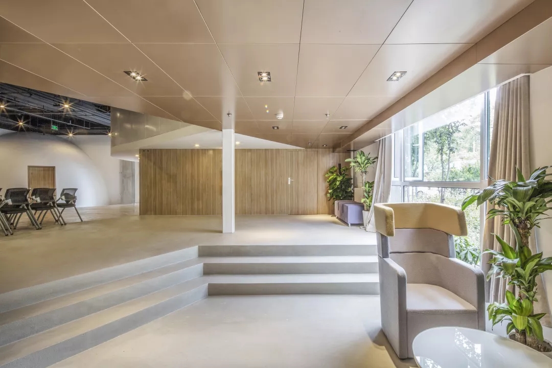 建筑师尝试创造一些对比剧烈并带有冲突性的空间。室内有非常多的空间挤压成非常小的角落,也有肆无忌惮地释放成特别开敞的广场,如下沉的部分是一个大型的集散广场的空间概念。大家可以随意坐在前面的台阶,就像一个开放的公共广场上进行交流的场景。从广场旁的球形的冥想室对面楼梯,到达一个长条形的悬挑,进入一个连廊转换到特别狭小的空间里,是二楼的一个小型和式榻榻米区,工作人员可以完全把房间封闭起来,在宁静空间当中进行自我的沉浸式思考。