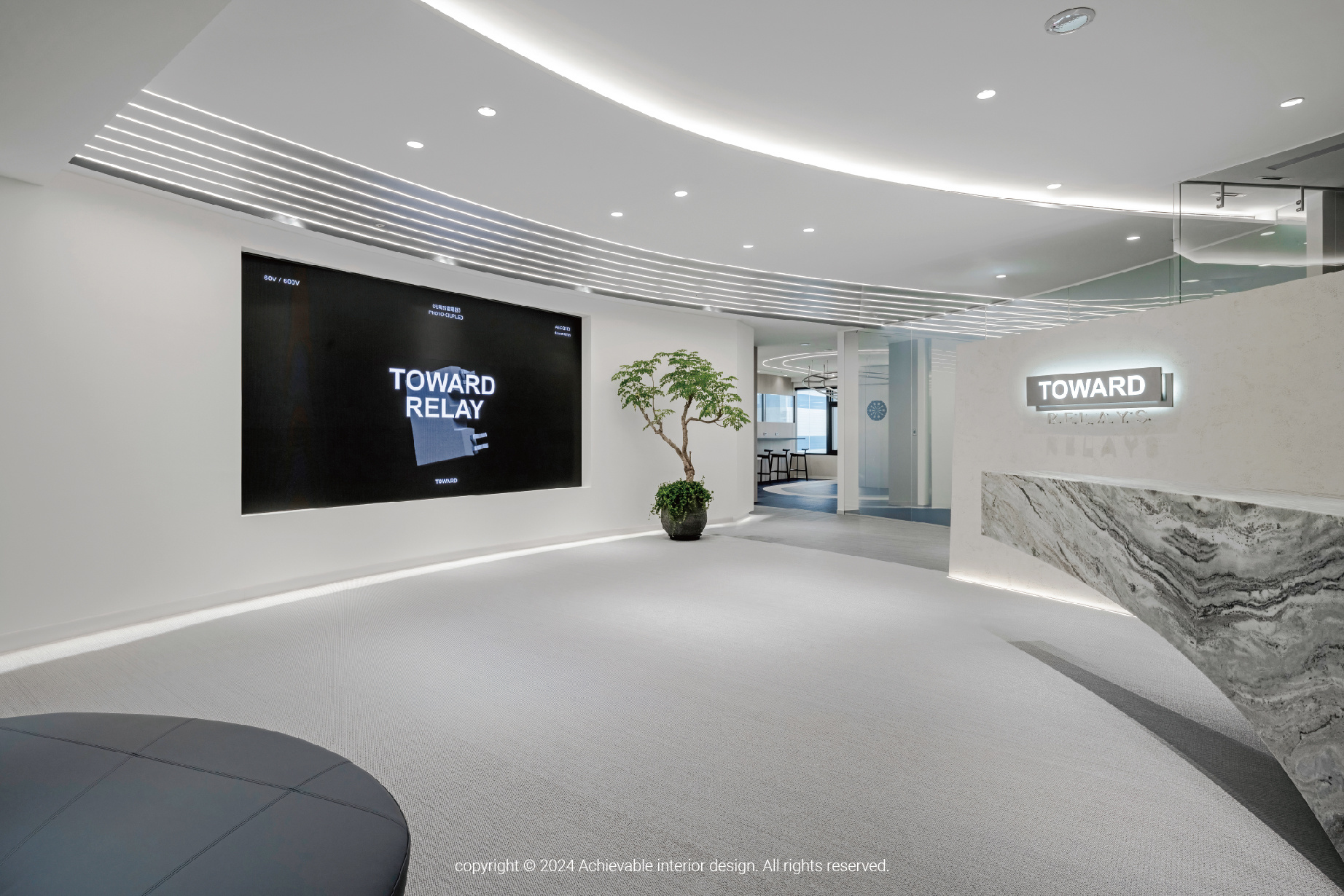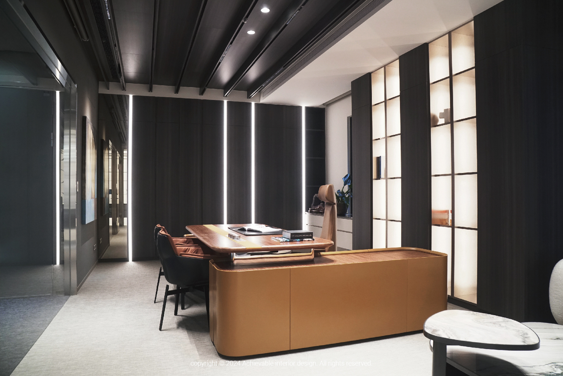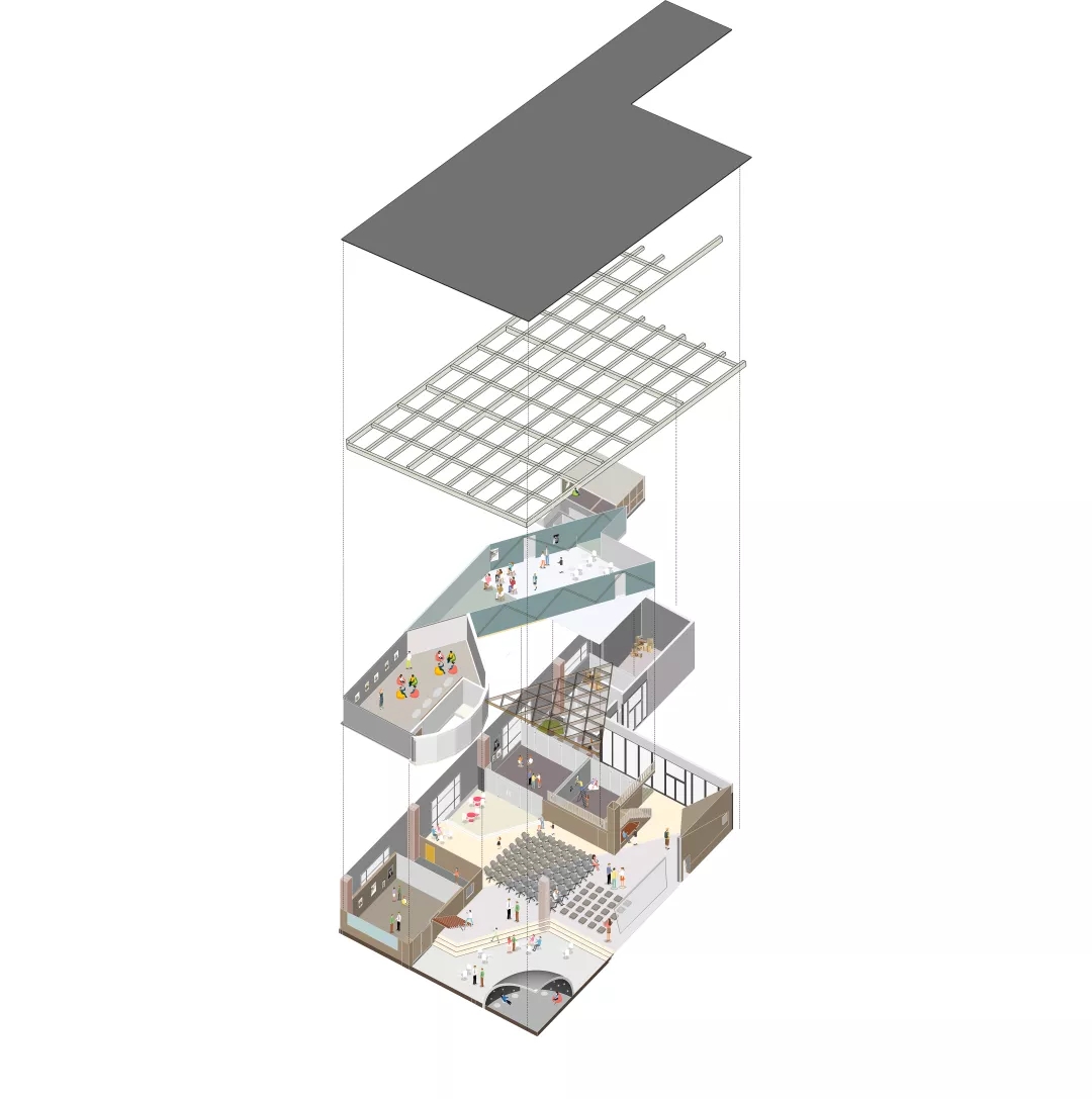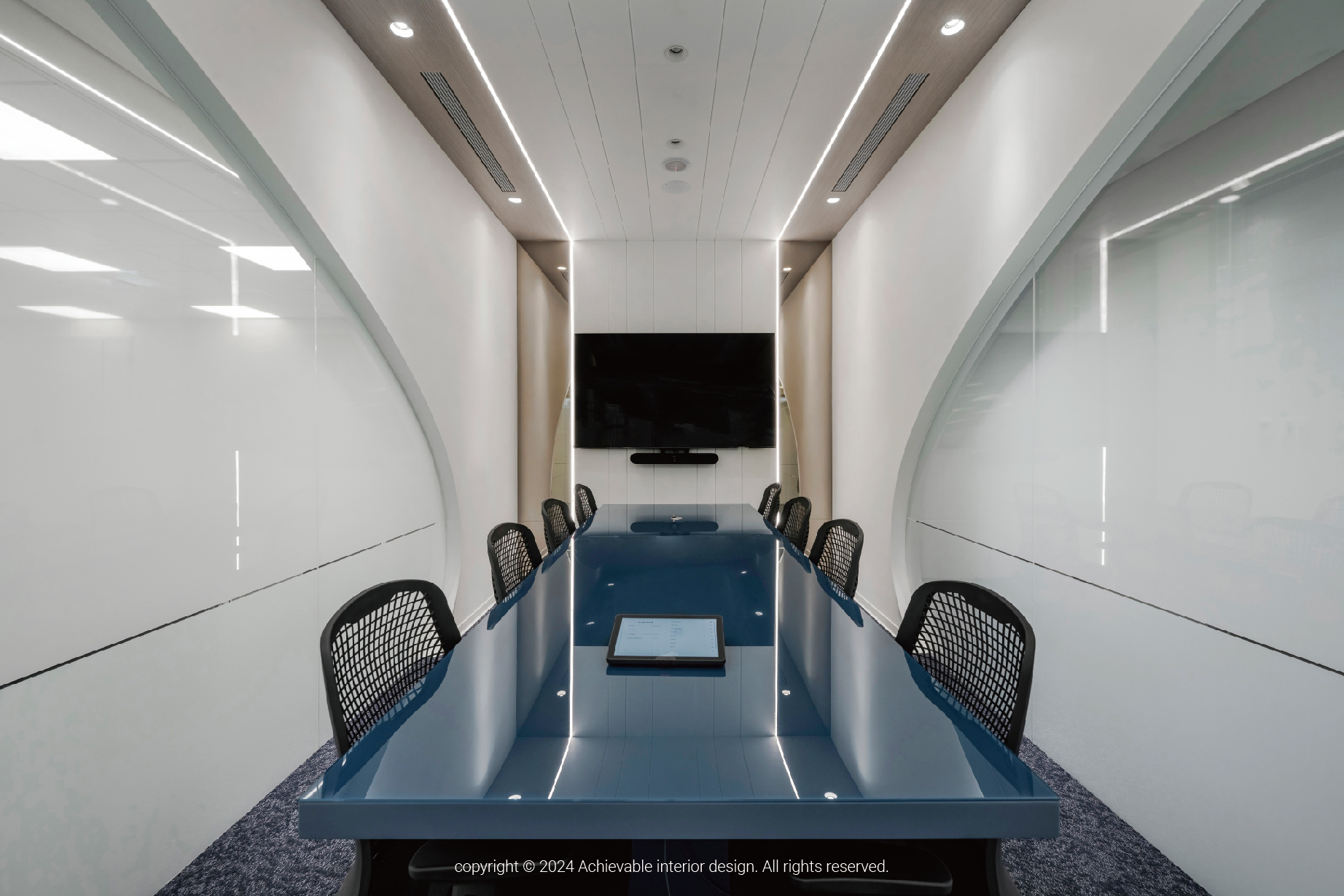 建筑师尝试创造一些对比剧烈并带有冲突性的空间。室内有非常多的空间挤压成非常小的角落,也有肆无忌惮地释放成特别开敞的广场,如下沉的部分是一个大型的集散广场的空间概念。大家可以随意坐在前面的台阶,就像一个开放的公共广场上进行交流的场景。从广场旁的球形的冥想室对面楼梯,到达一个长条形的悬挑,进入一个连廊转换到特别狭小的空间里,是二楼的一个小型和式榻榻米区,工作人员可以完全把房间封闭起来,在宁静空间当中进行自我的沉浸式思考。