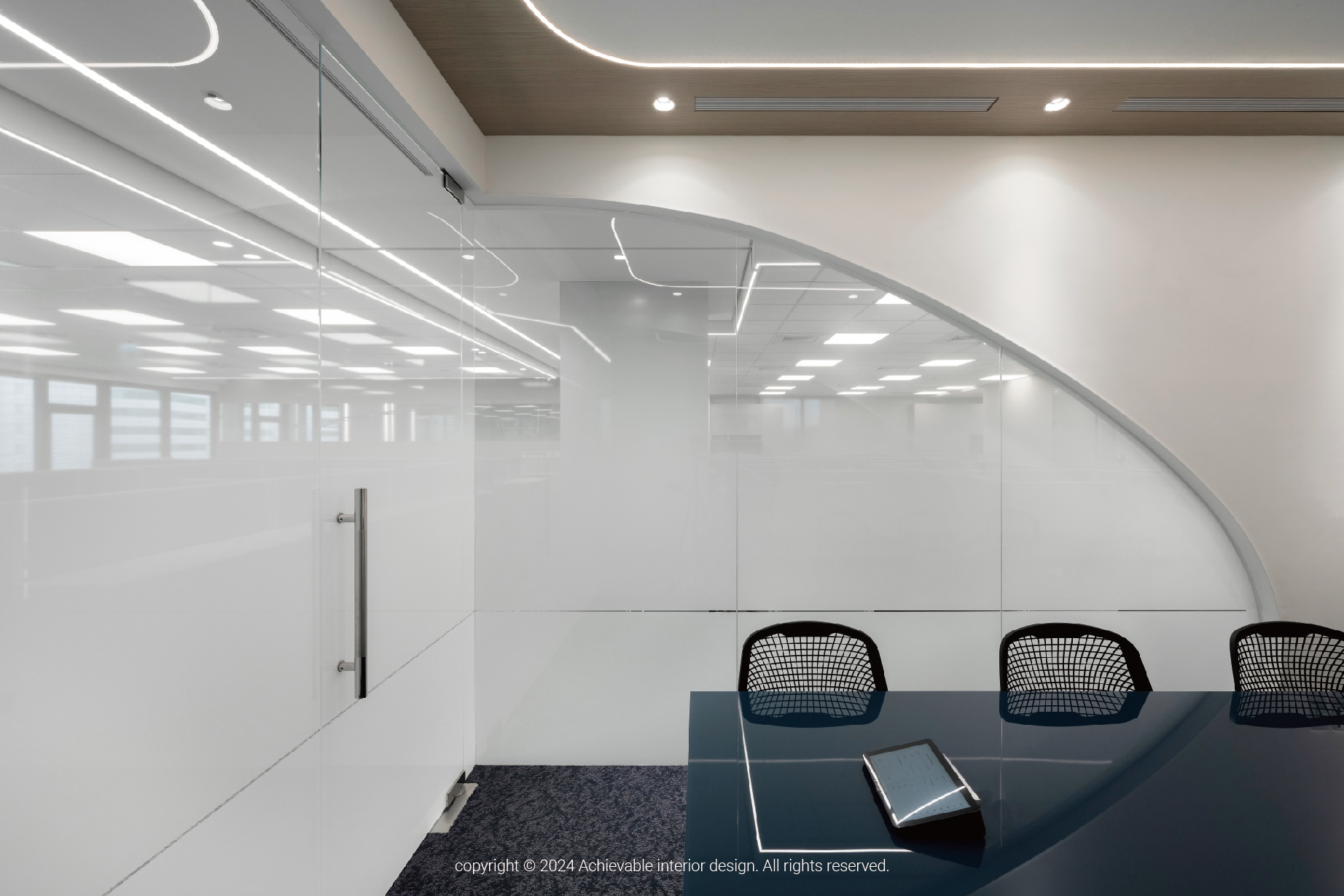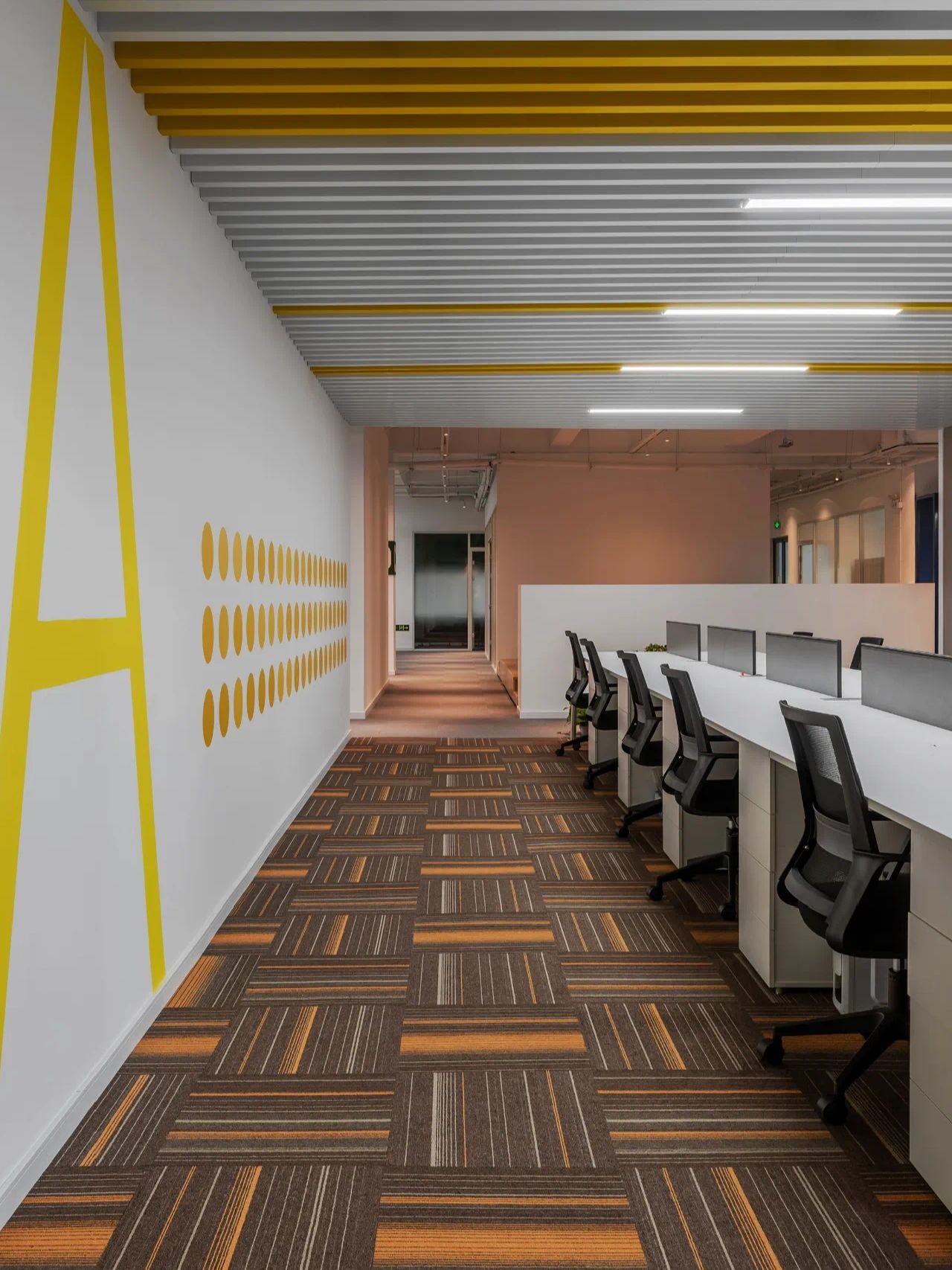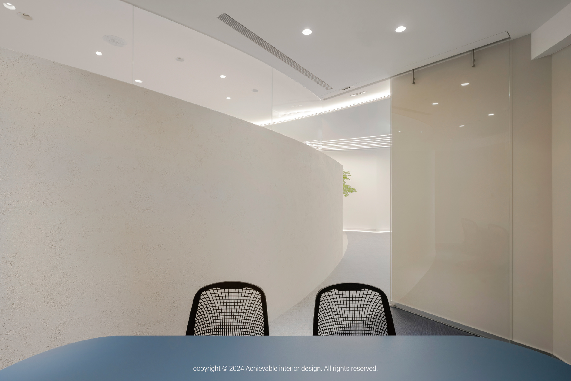 在材料的选择上,整个空间以比较素雅的基调作为整体空间氛围的营造。采用了不同拼花的木地板,以及水泥自流平。二楼采用了一些地胶和乳胶漆搭配组合。脑暴会议进行隔音的毛毡处理。在整个空间的立面饰面,做了一些局部的木饰面啊,以及金属板,白色的冲孔板,双层表皮的处理。