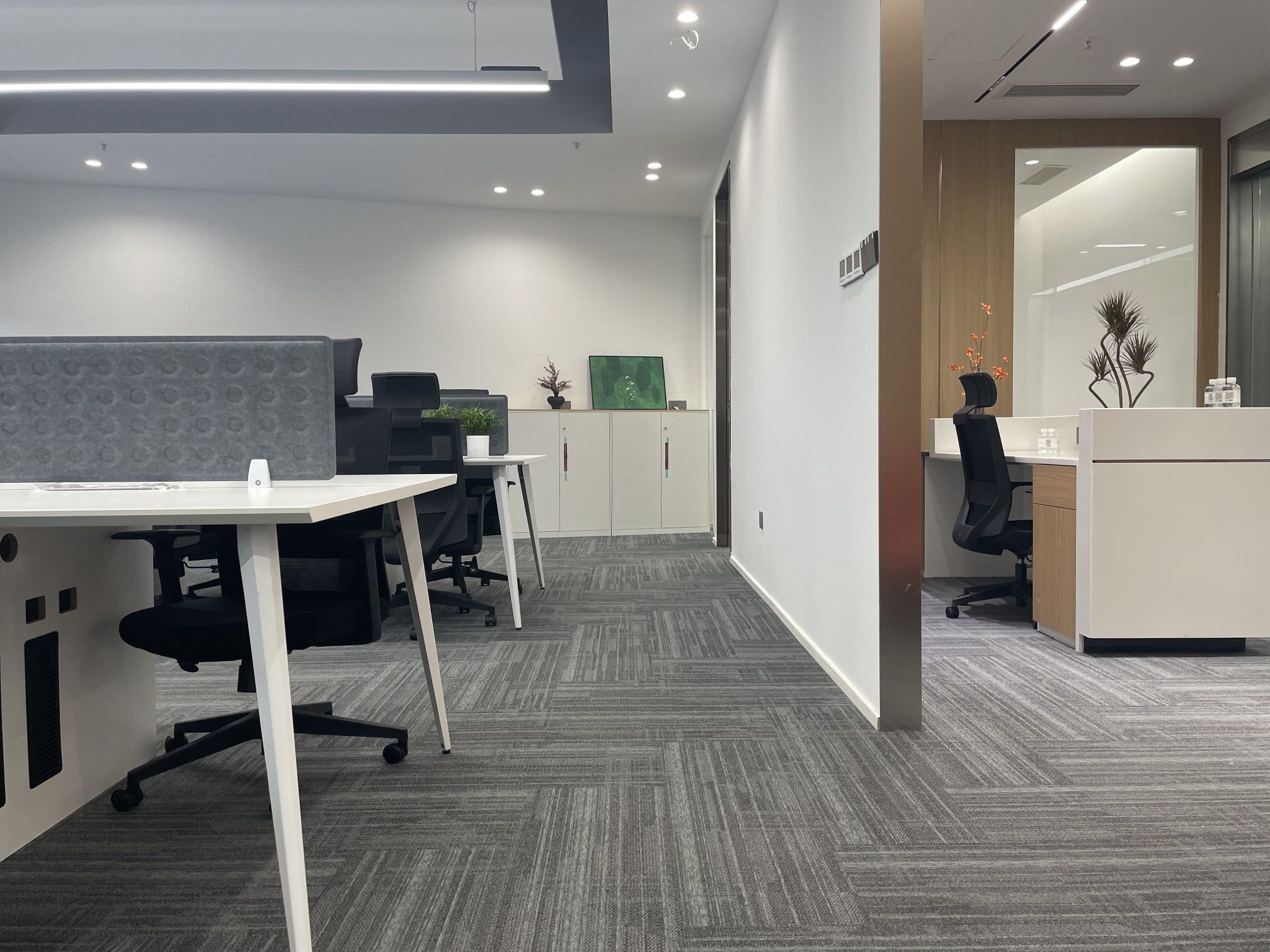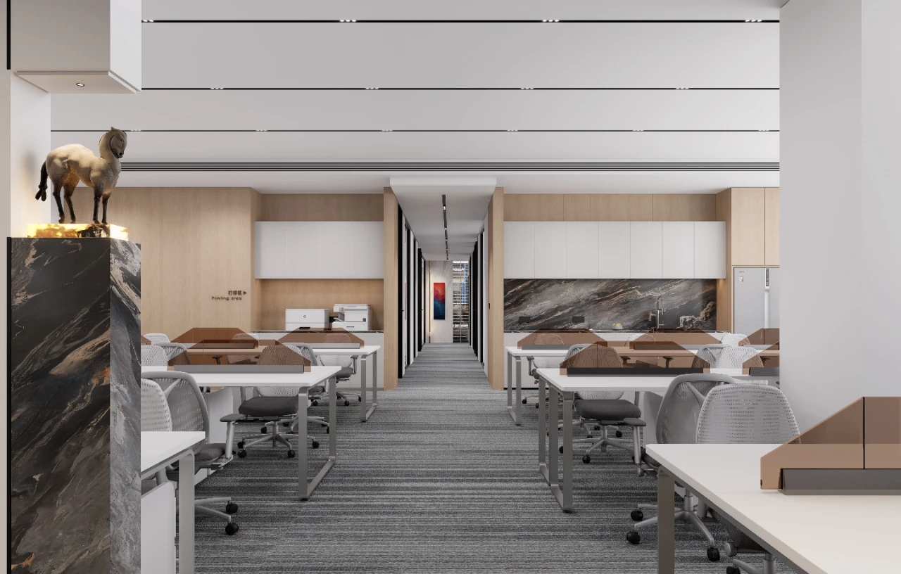 设计元素色彩选择:以白色、灰色为主色调,辅以木色或金属色点缀,营造清新、明亮的空间感。材质运用:选用环保材料,如木材、竹材或玻璃,强调可持续发展的理念。灯光设计:利用自然光和间接照明,创造出柔和、舒适的光线效果,减少视觉疲劳。